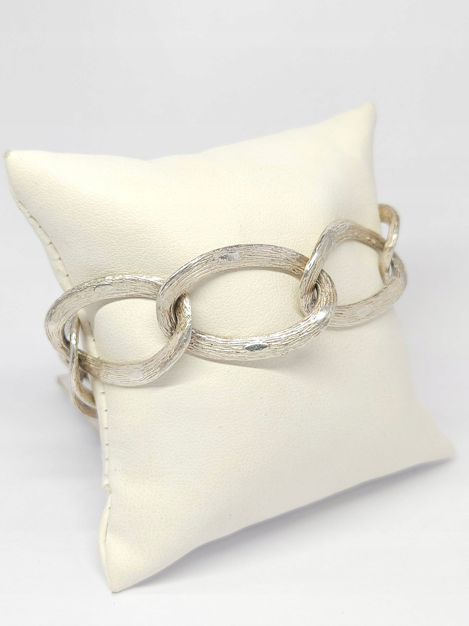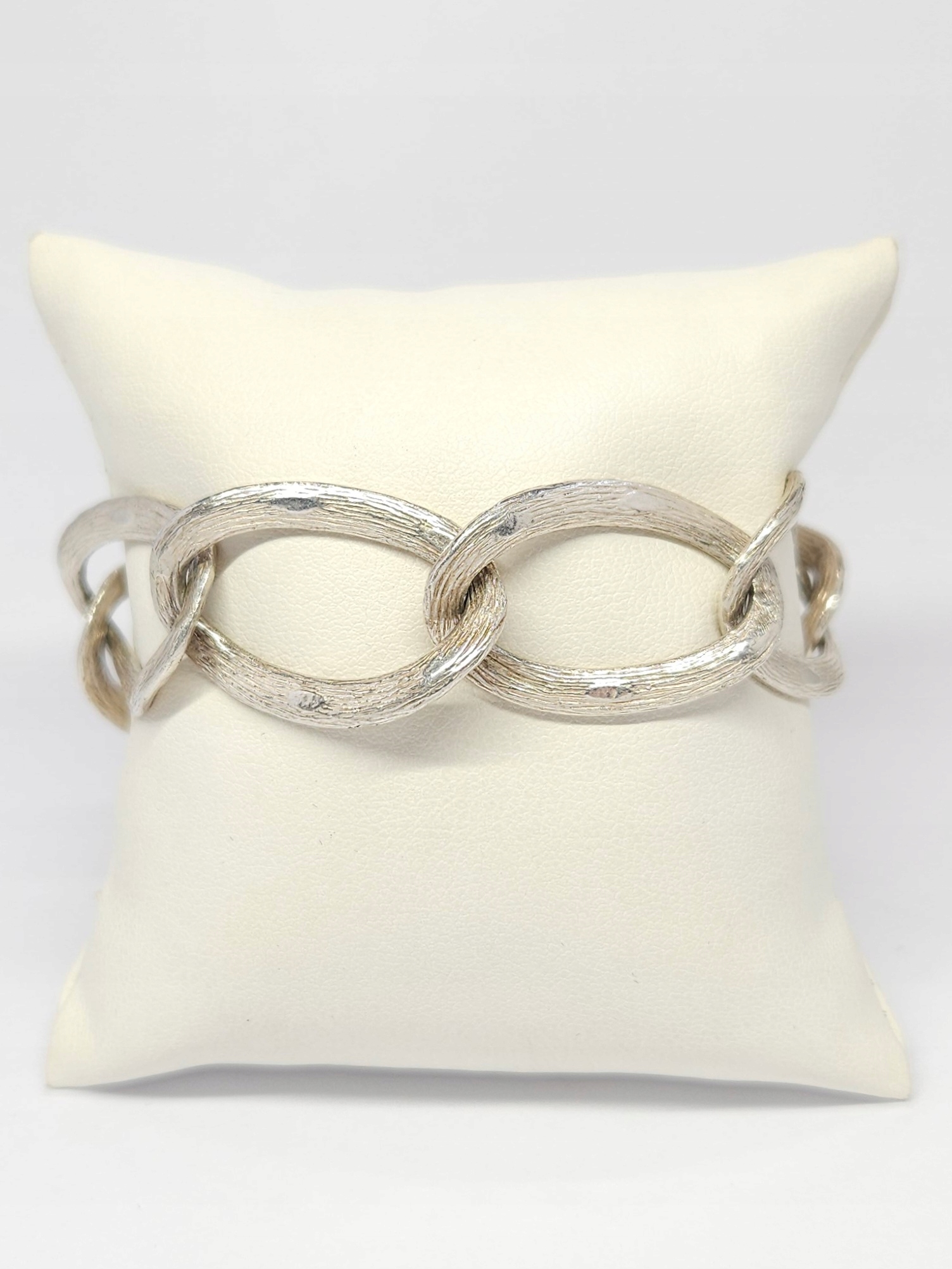 Srebrna bransoletka, wykonana z dużych, owalnych, kekko skręconych ogniw, ze zdobioną powierzchnią; bransoletka zapinana na zatrzask