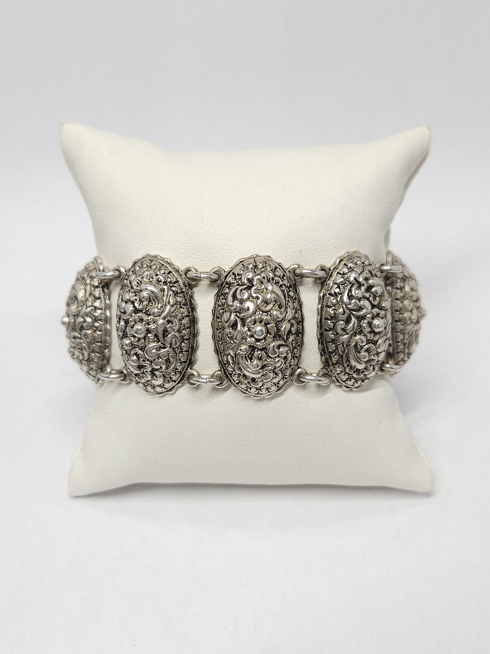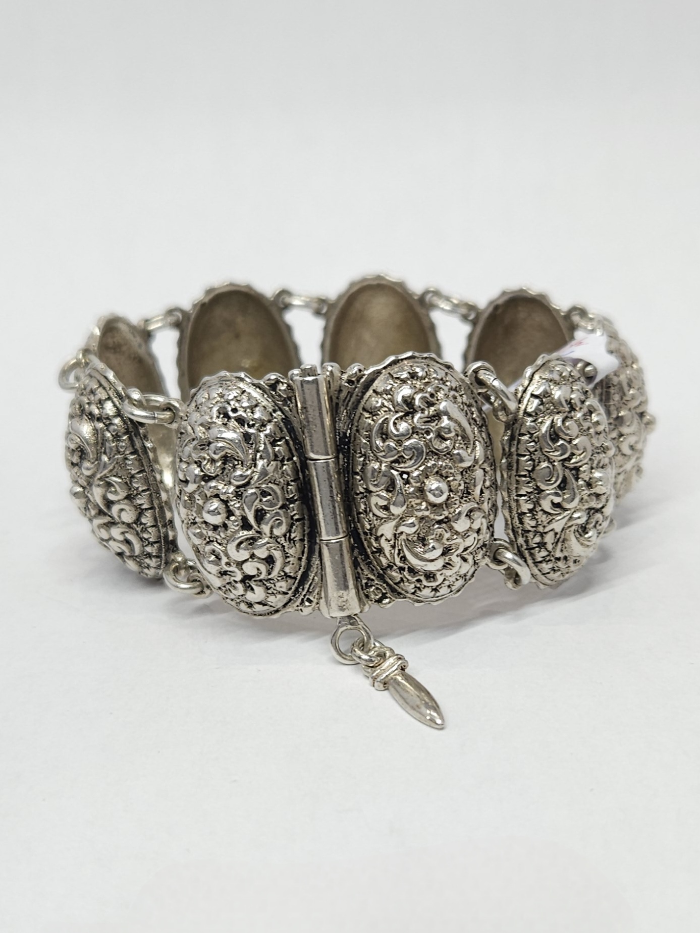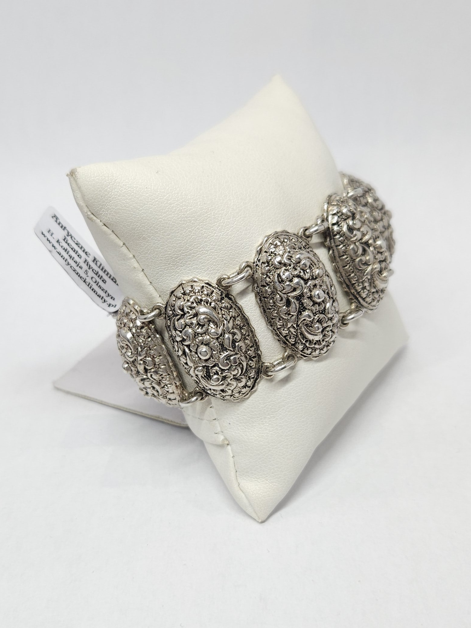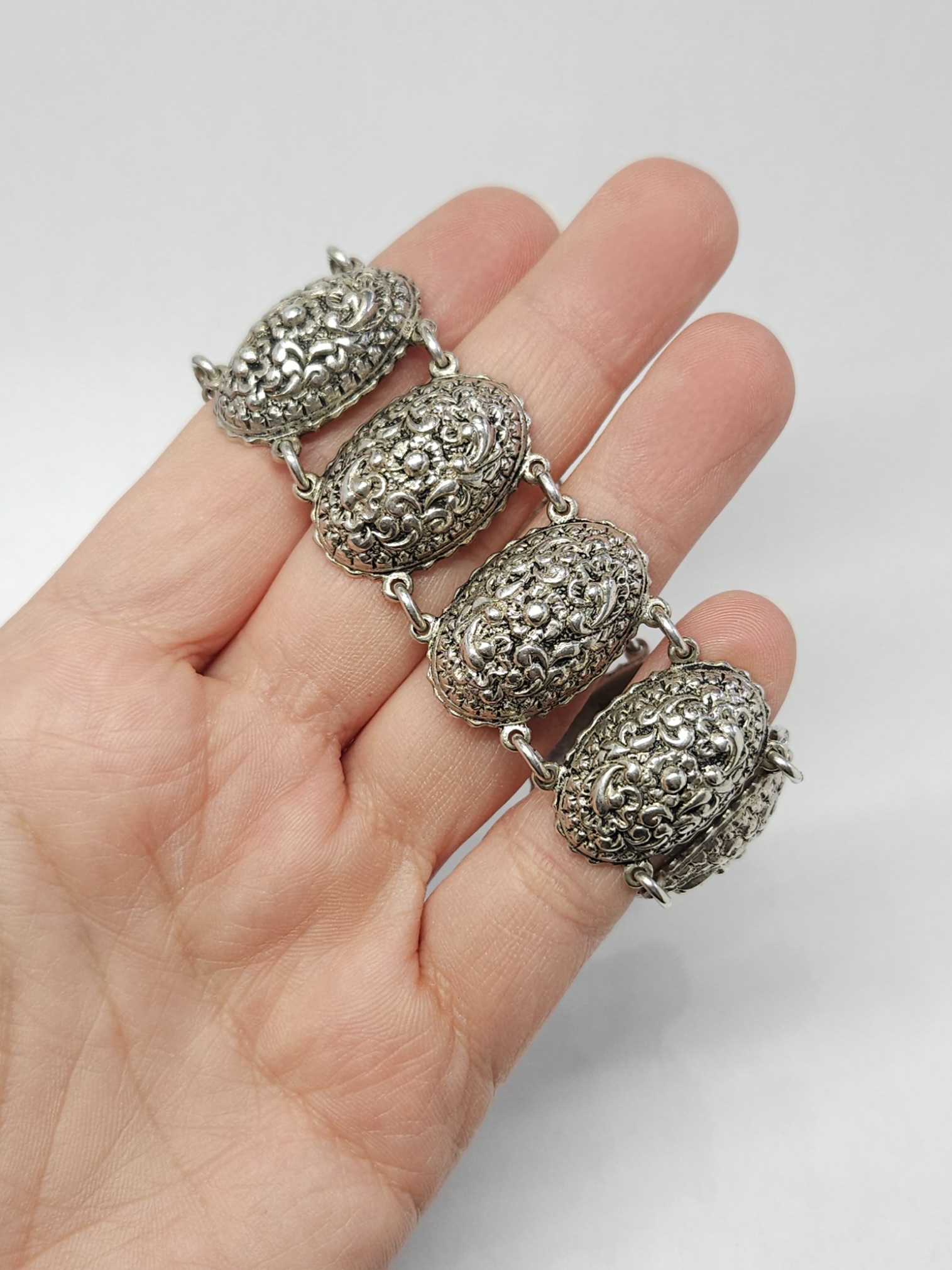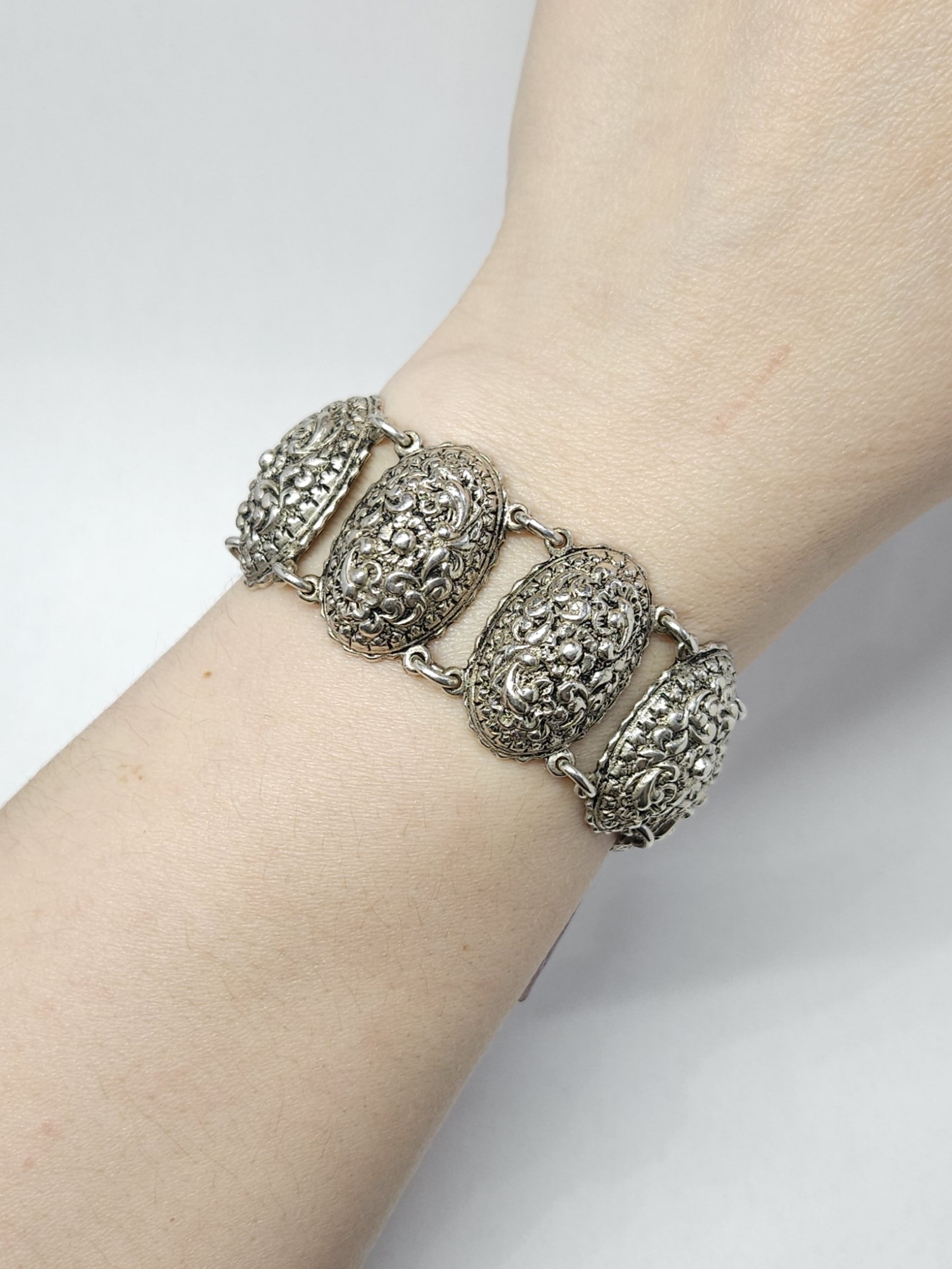 Efektowna, srebrna bransoletka, wykonana z owalnych modułów o zaokrąglonej powierzchni, zdobionych bogatym, tłoczonym ornamentem dekoracyjnym oraz zapięciem na kołeczek z przywieszką