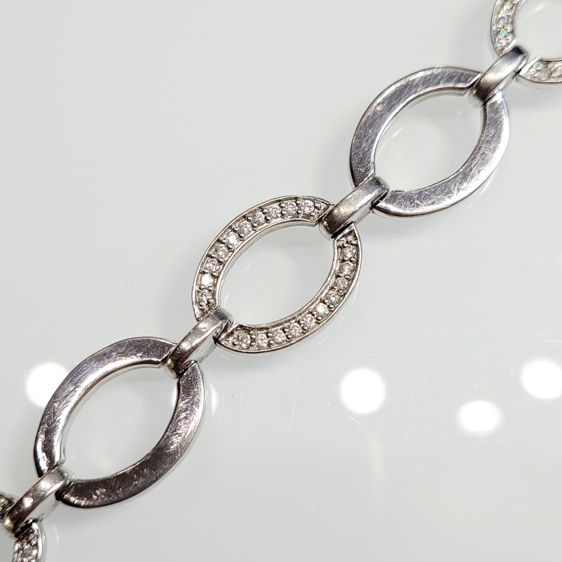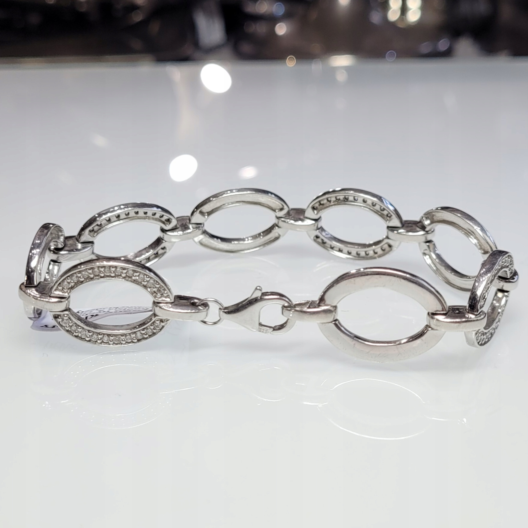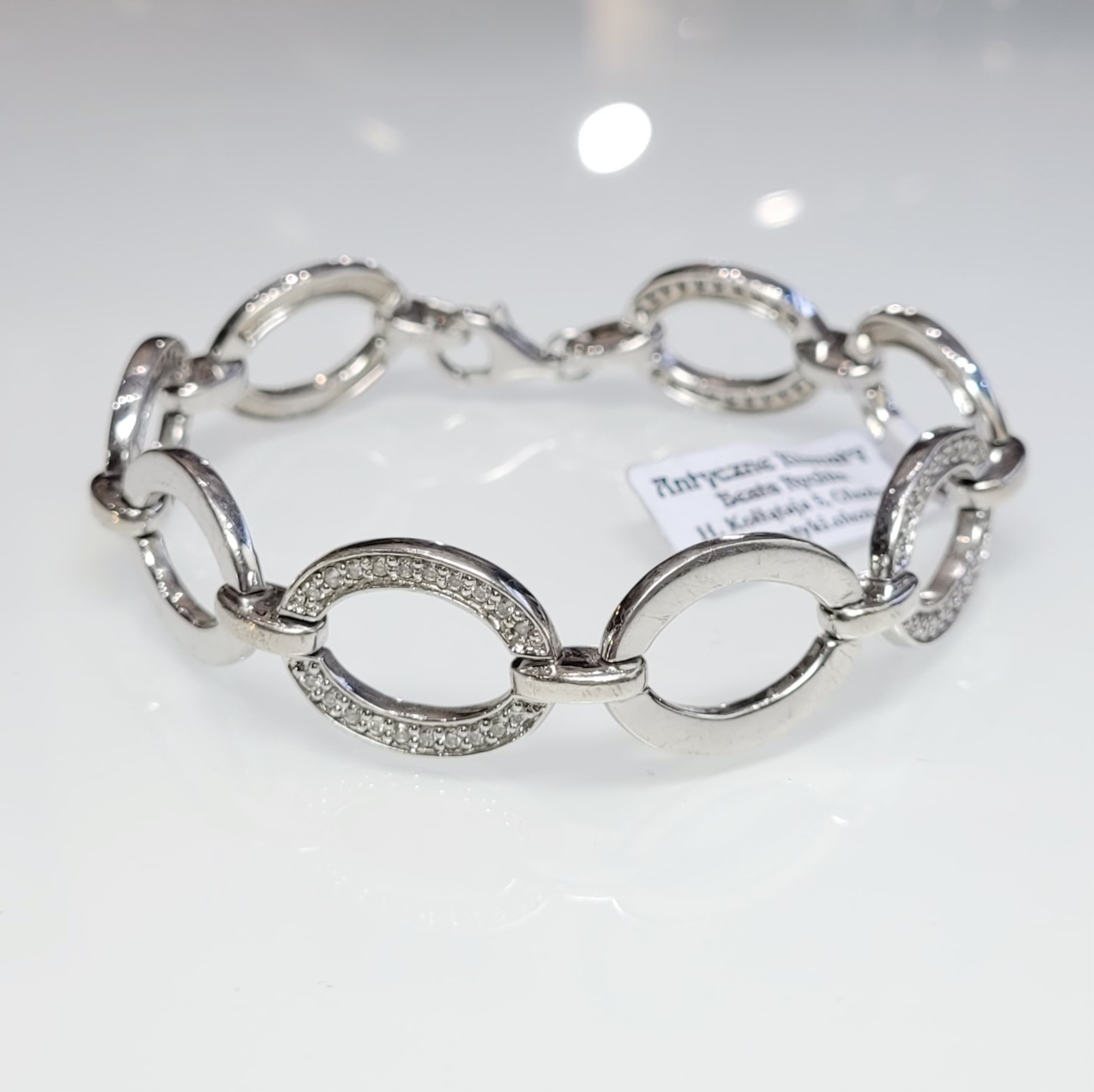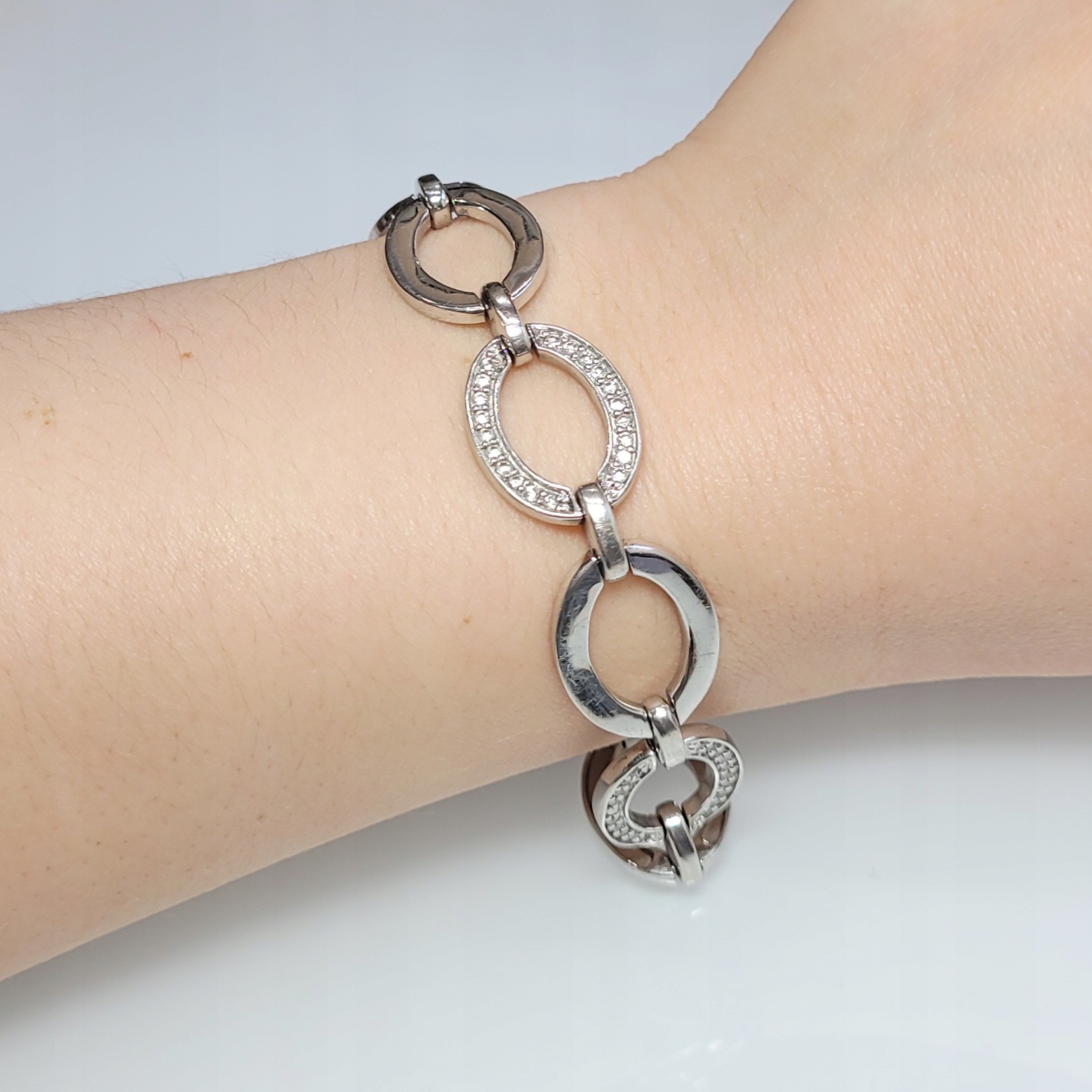 Srebrna bransoletka, wykonana z owalnych elementów, naprzemiennie wysadzanych cyrkoniami