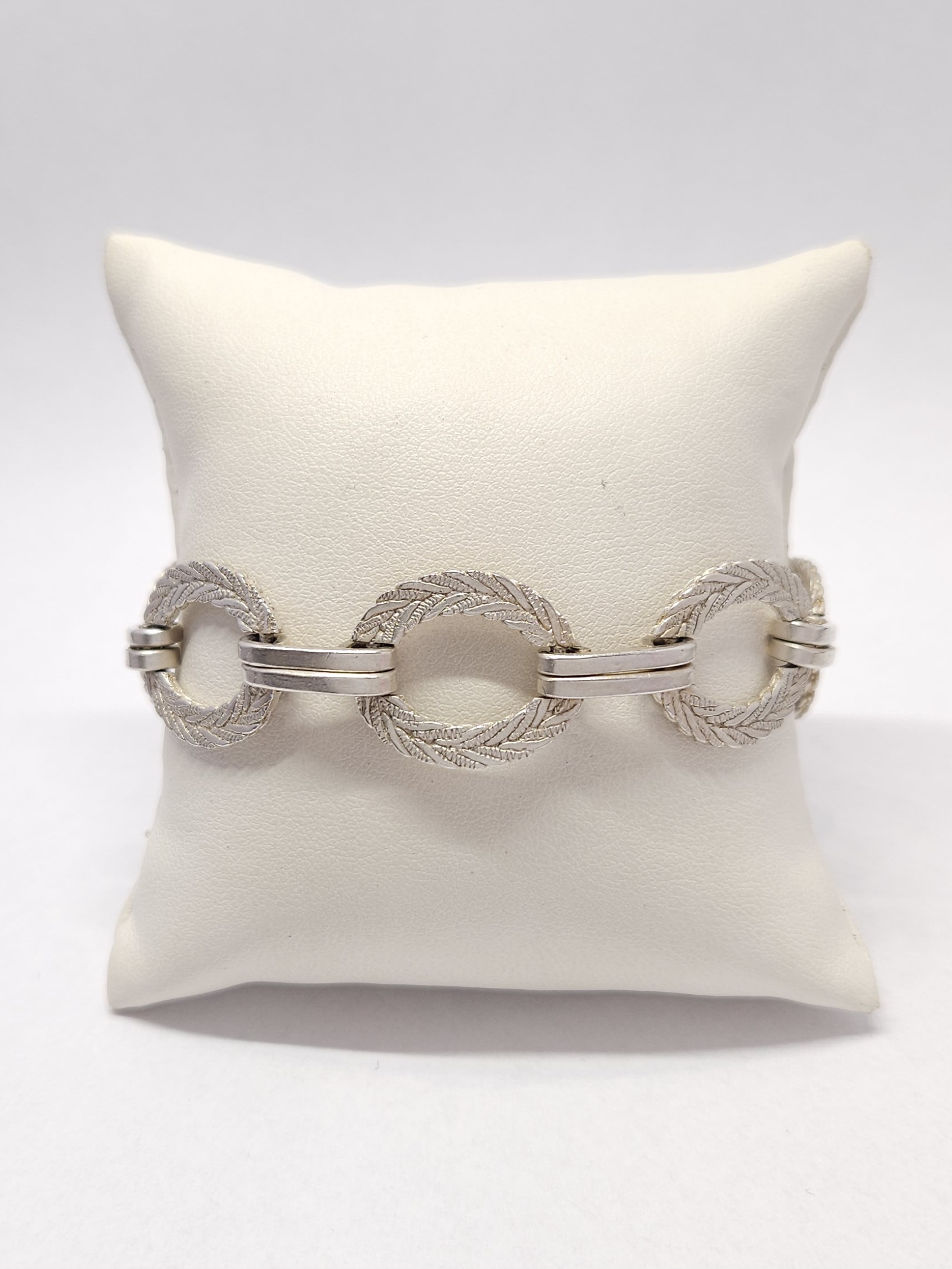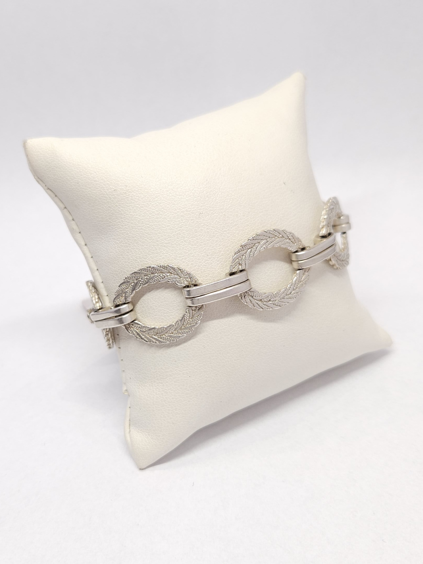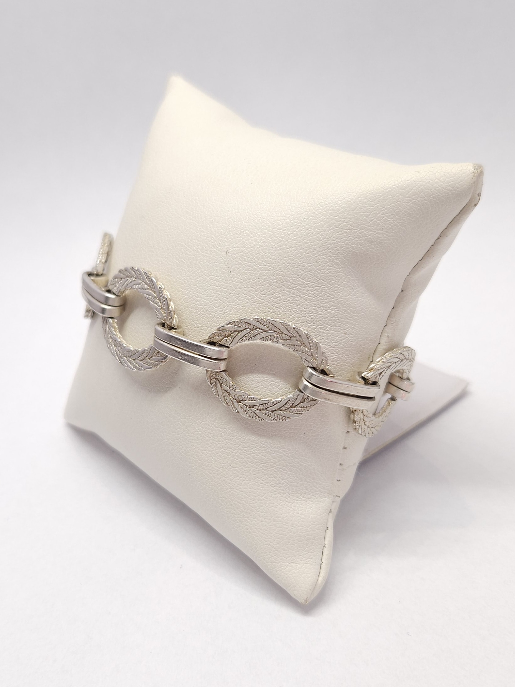 Srebrna bransoletka, z ozdobnymi, plecionymi, owalnymi ogniwami; mocne zapięcie na zatrzask