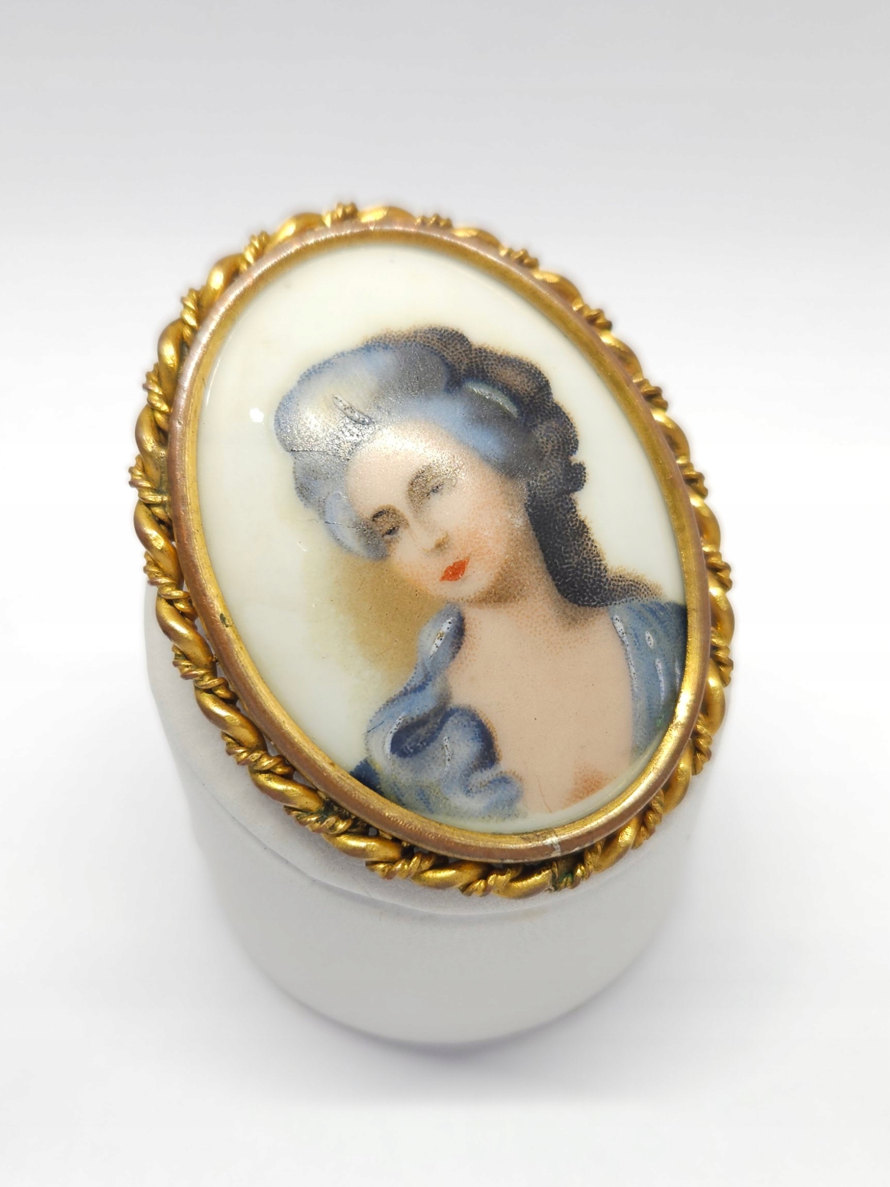 Owalna broszka, wykonana z francuskiej porcelany Limoges, oprawionej w mosiądz i miedź, z podobizną kobiety, zdobiona techniką kalkomanii, miejscowo podmalowywana