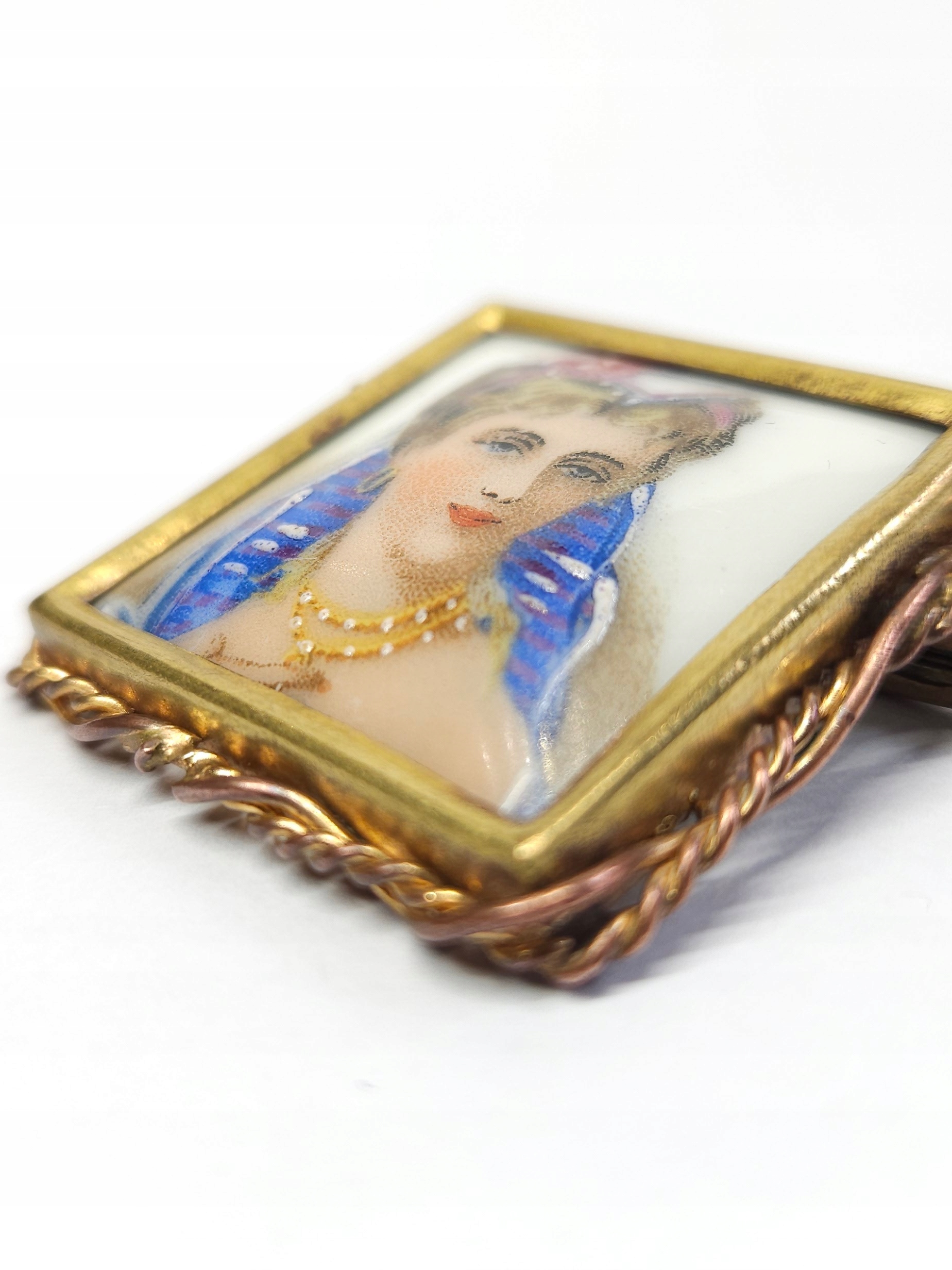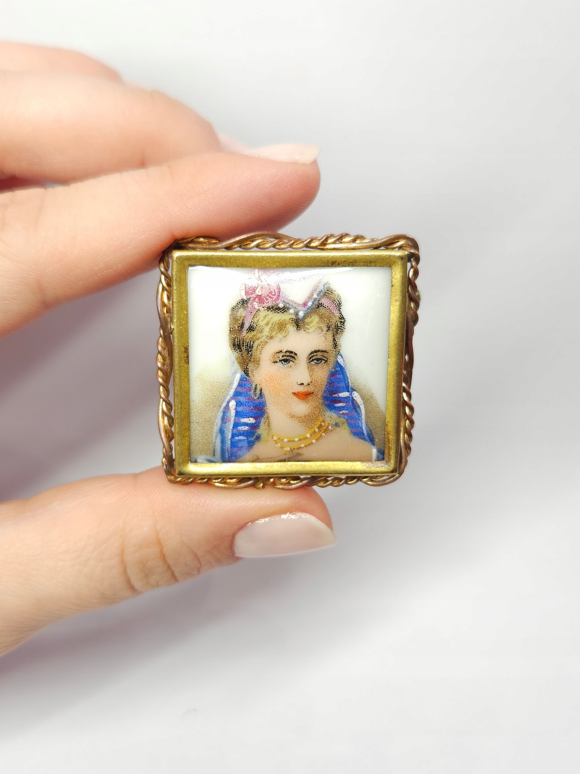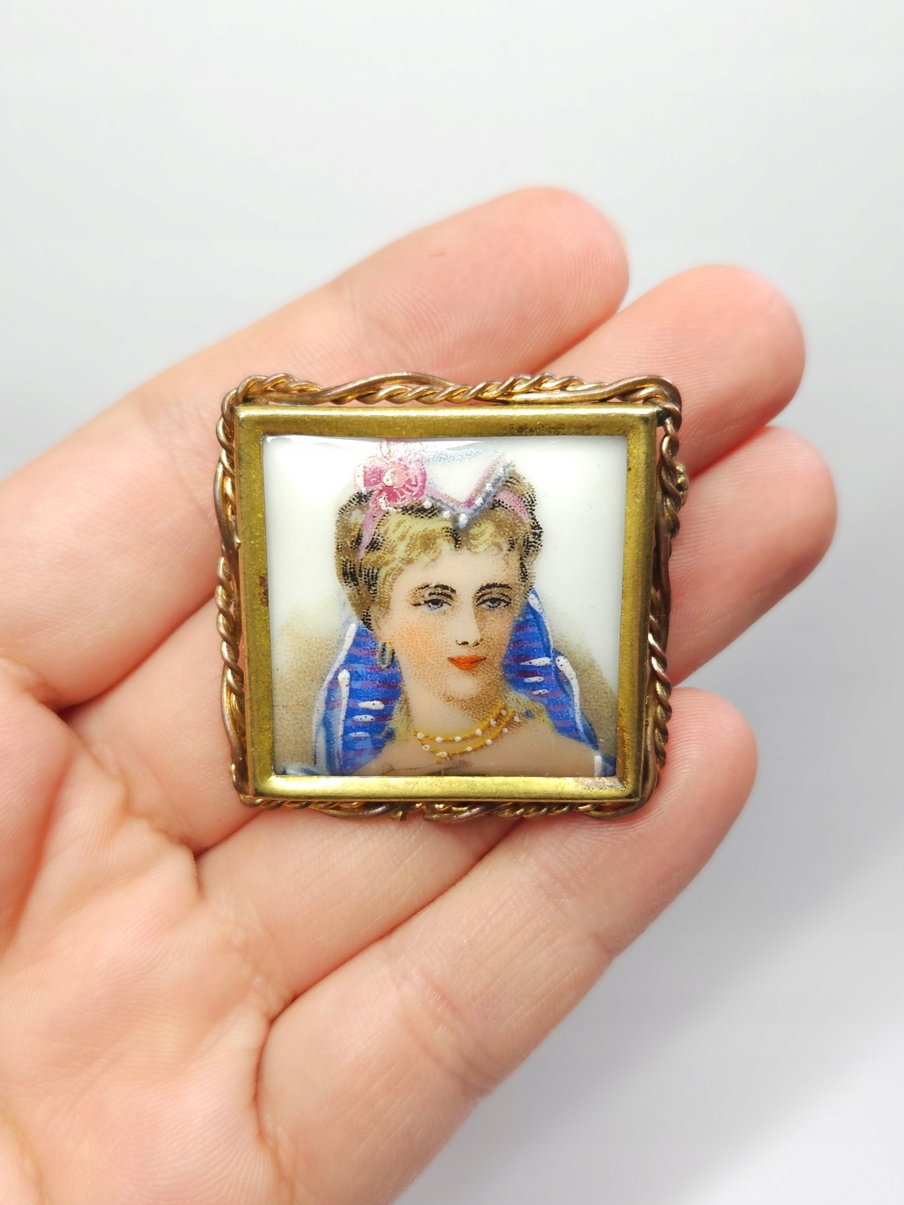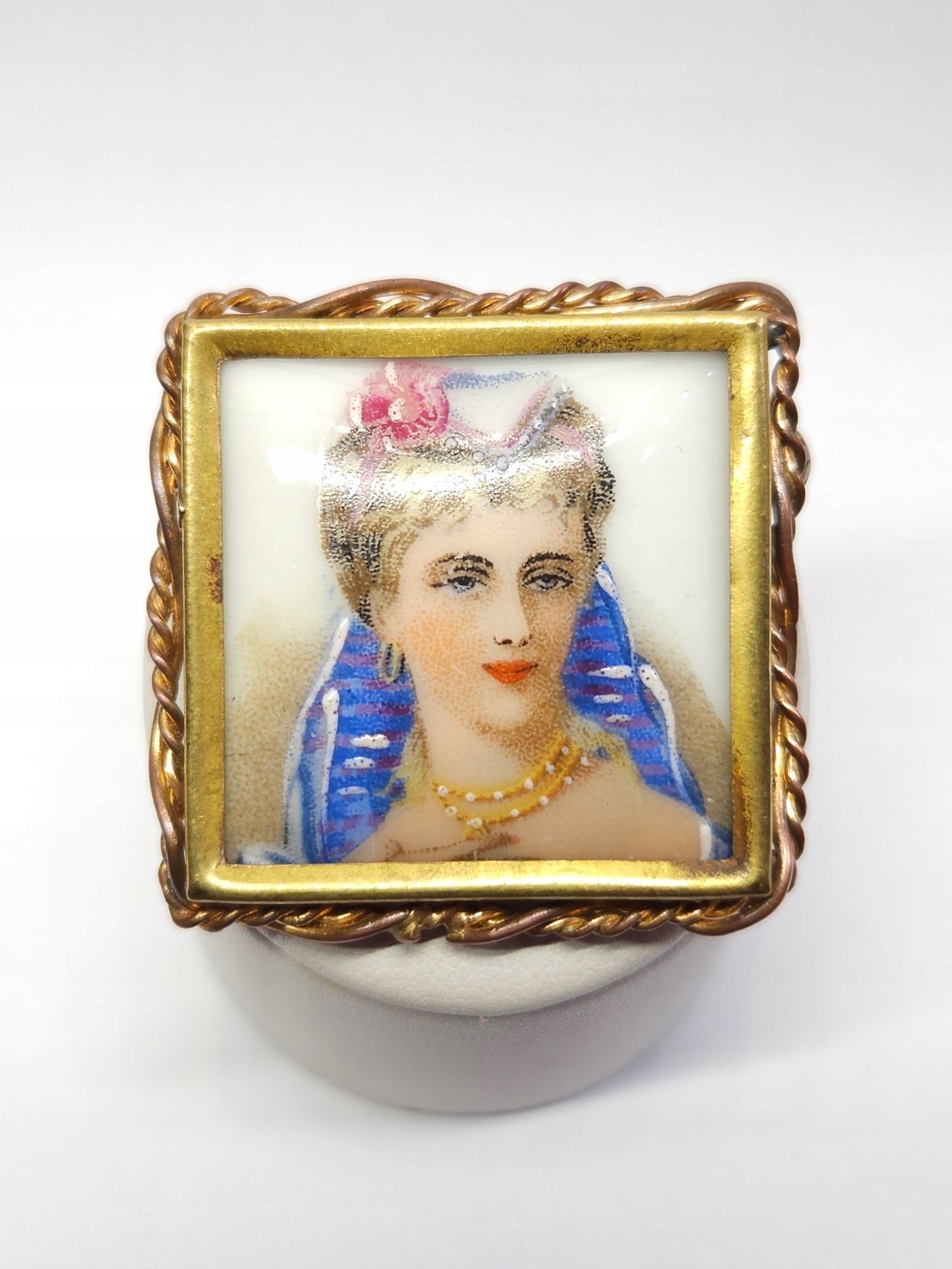 Kwadratowa broszka, wykonana z francuskiej porcelany Limoges, oprawionej w mosiądz i miedź, z podobizną kobiety, zdobiona techniką kalkomanii, miejscowo podmalowywana