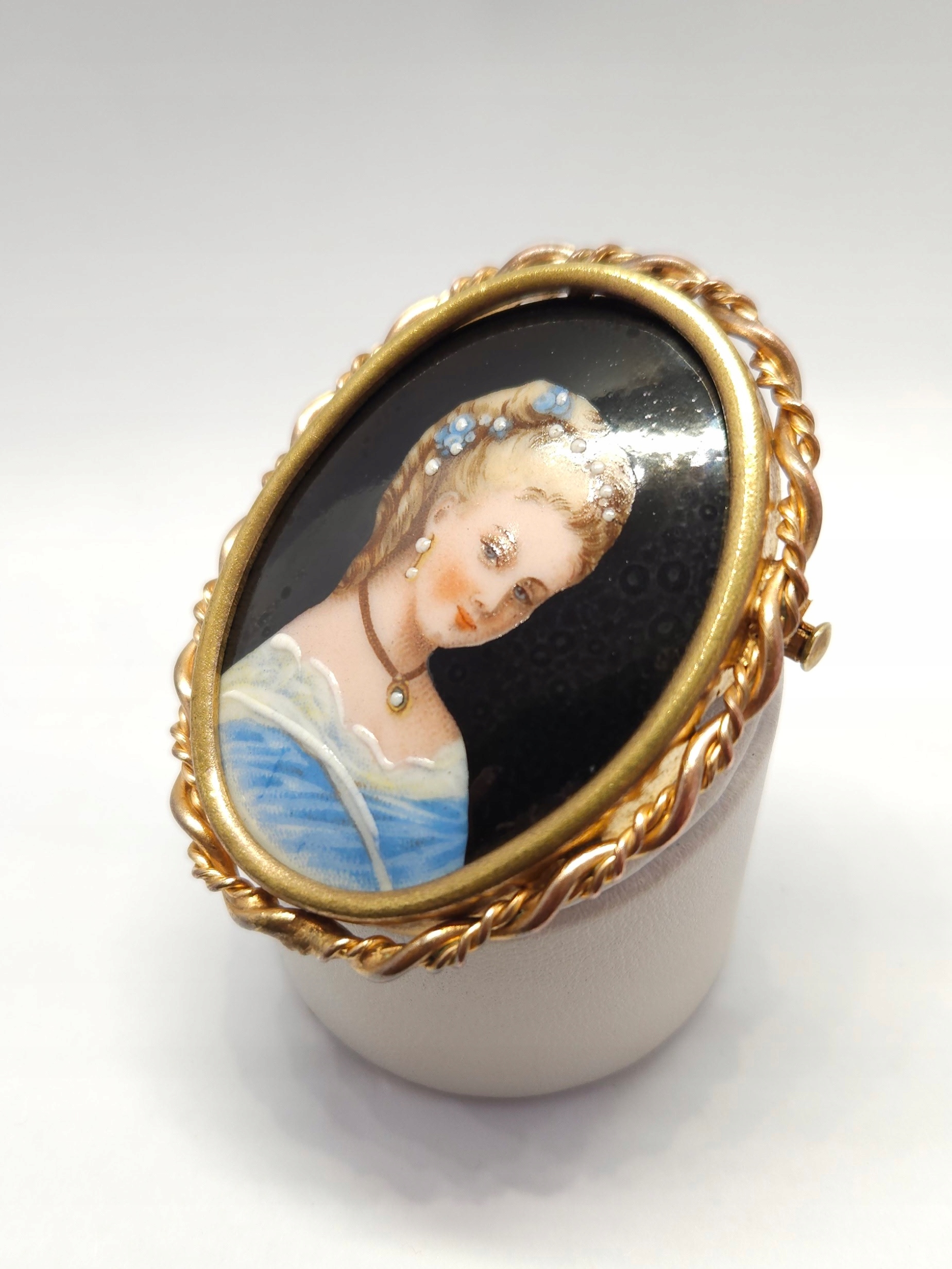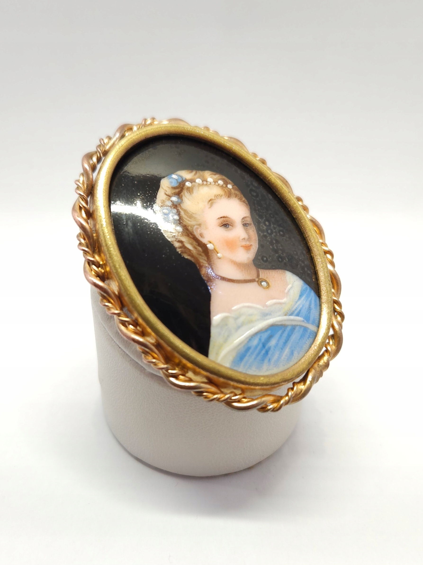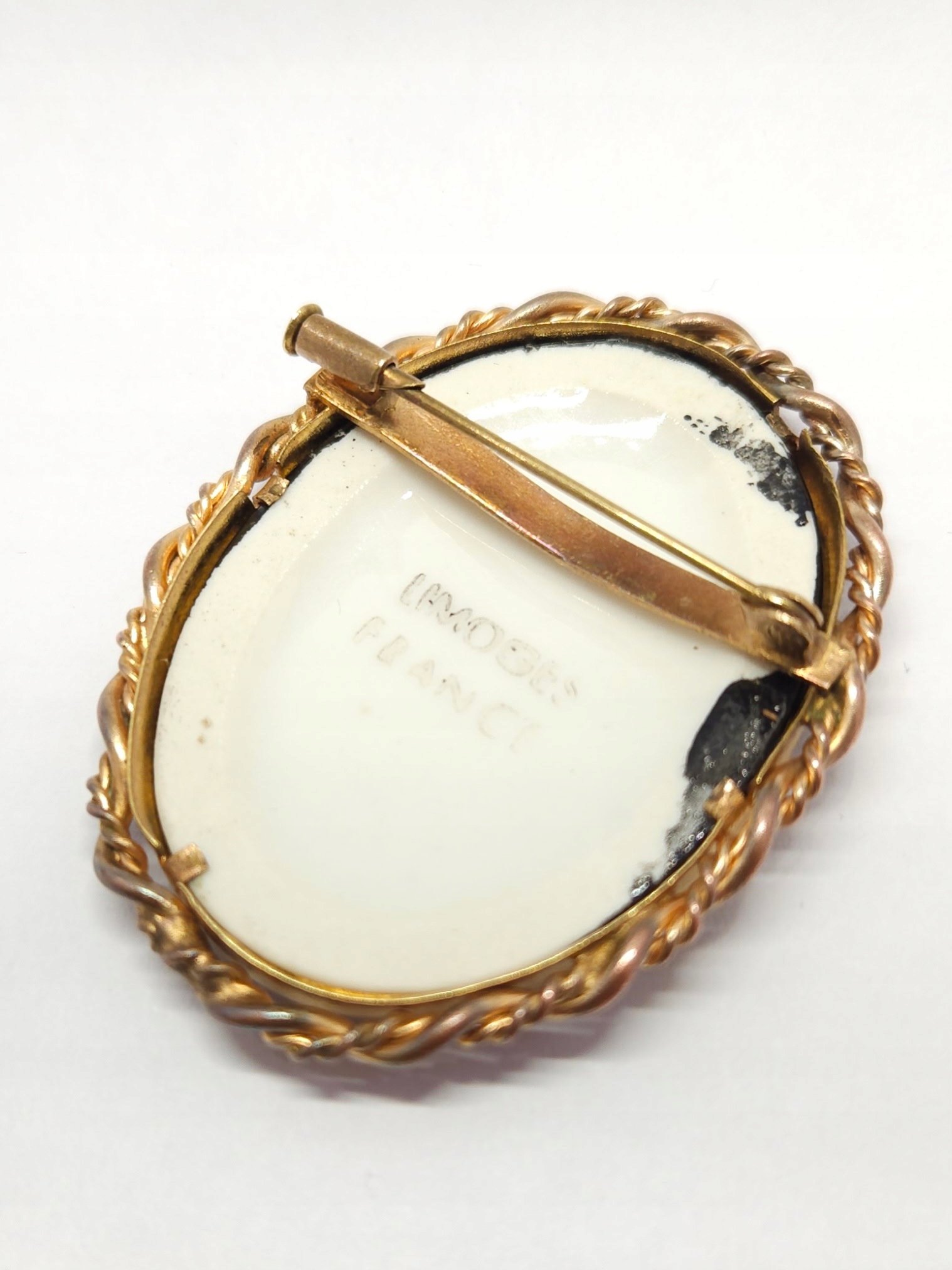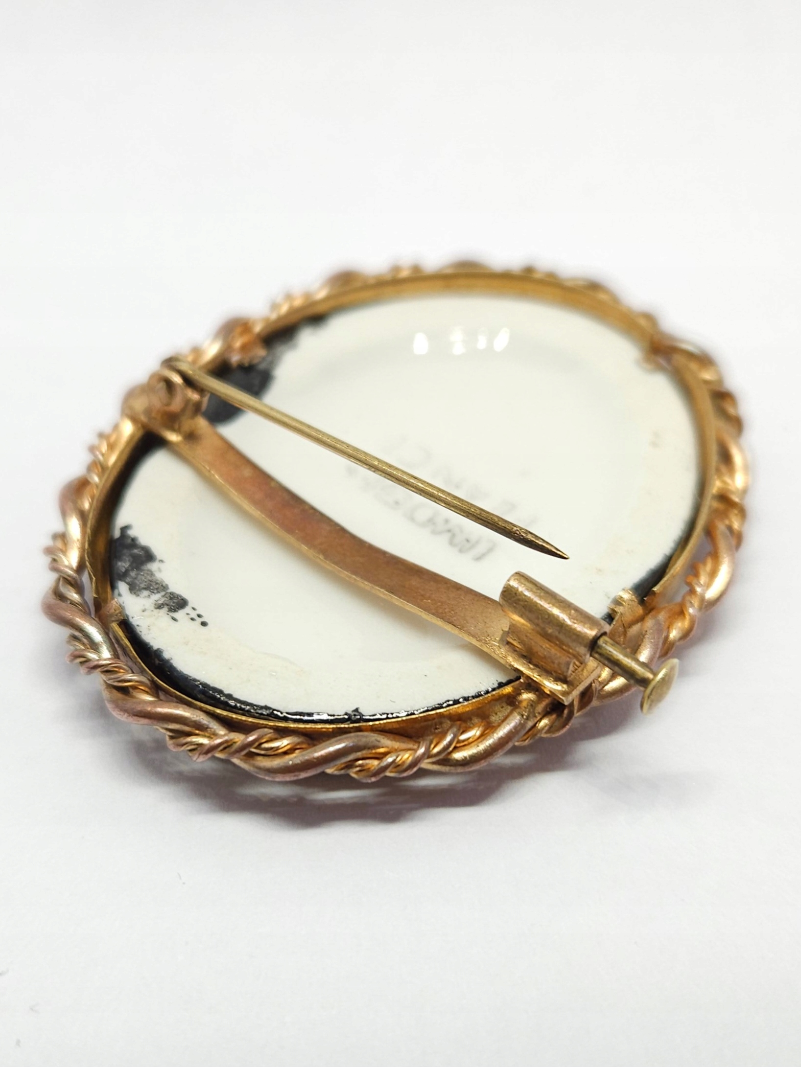 Duża, owalna broszka, wykonana z francuskiej porcelany Limoges, oprawionej w mosiądz i miedź, z podobizną kobiety na czarnym tle, zdobiona techniką kalkomanii, miejscowo podmalowywana