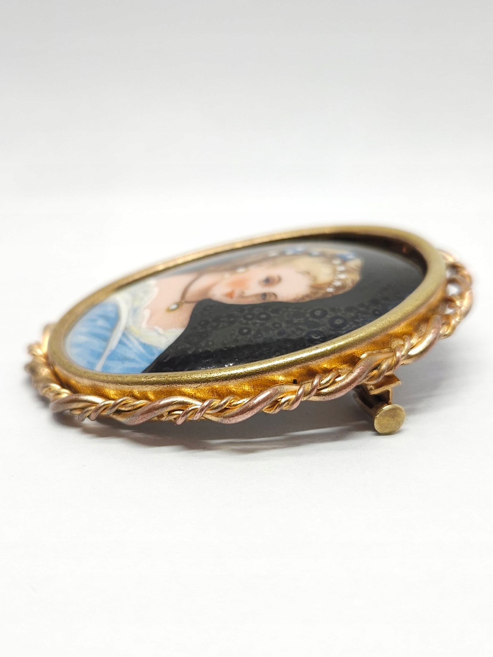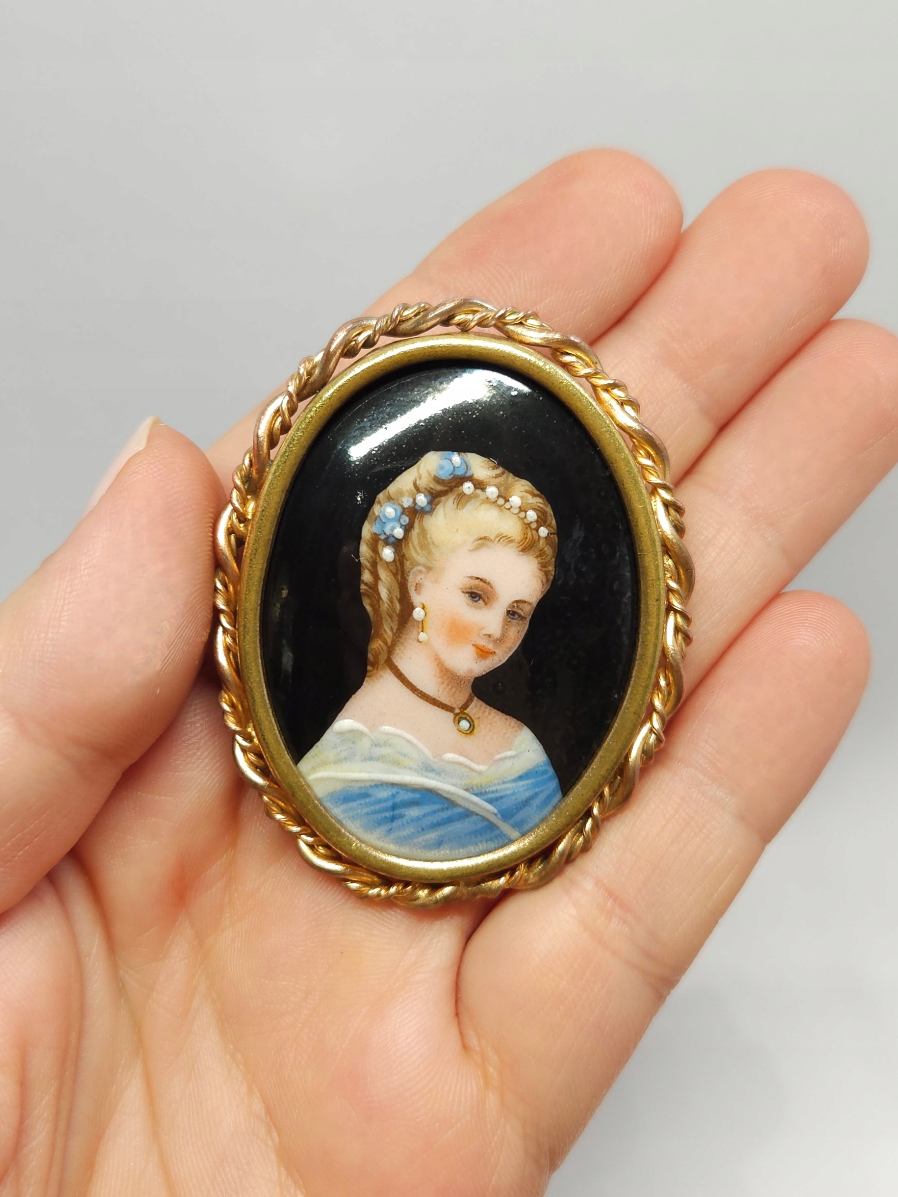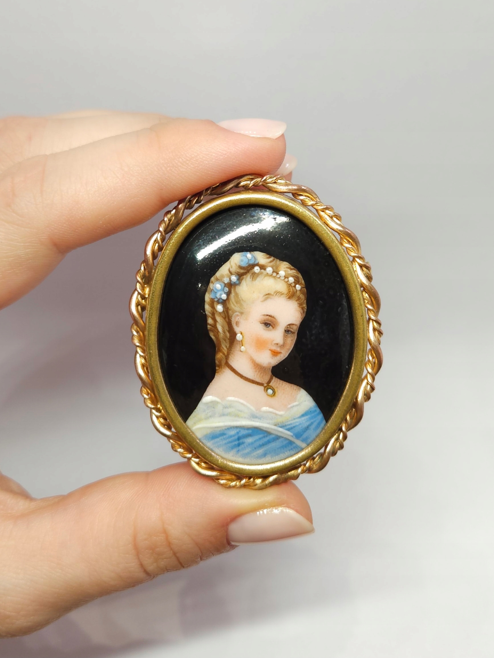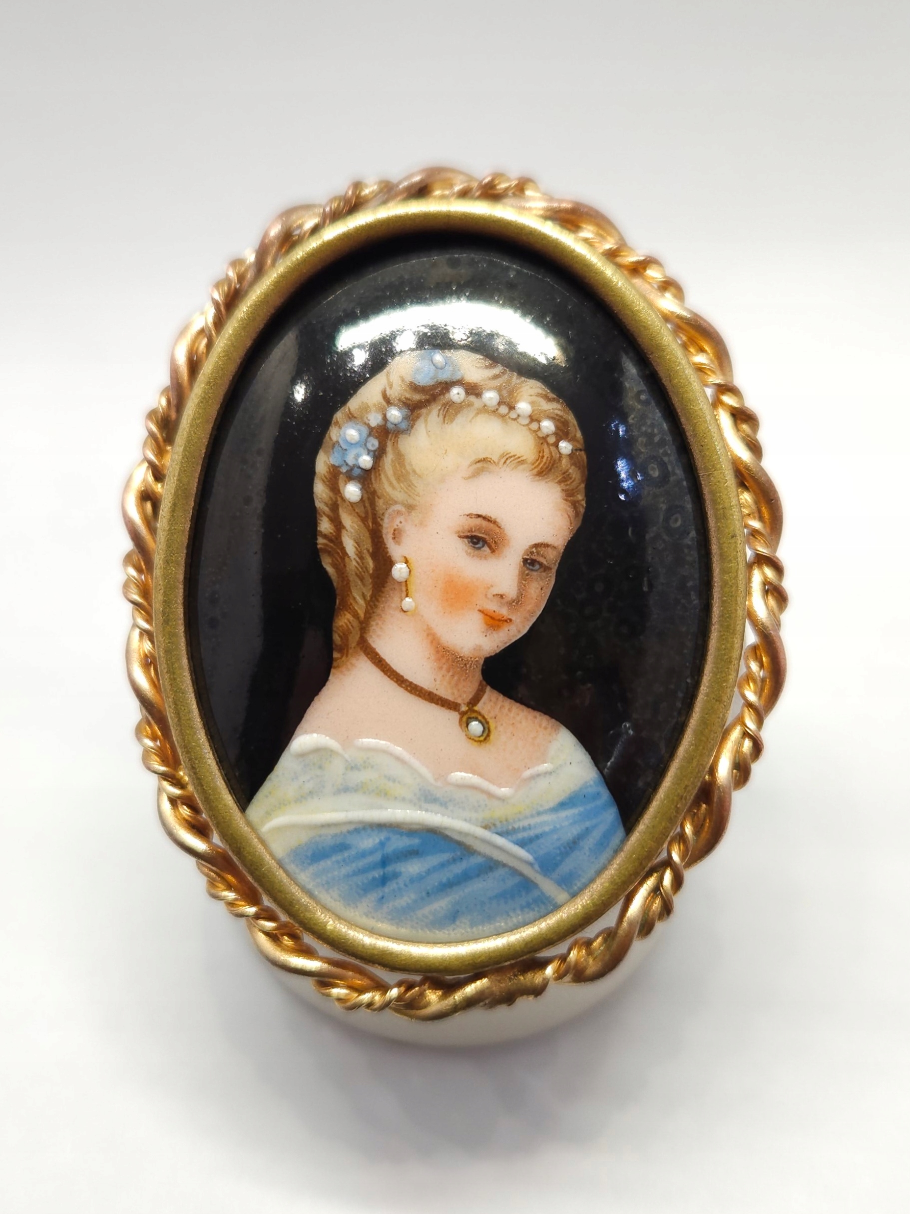 Duża, owalna broszka, wykonana z francuskiej porcelany Limoges, oprawionej w mosiądz i miedź, z podobizną kobiety na czarnym tle, zdobiona techniką kalkomanii, miejscowo podmalowywana