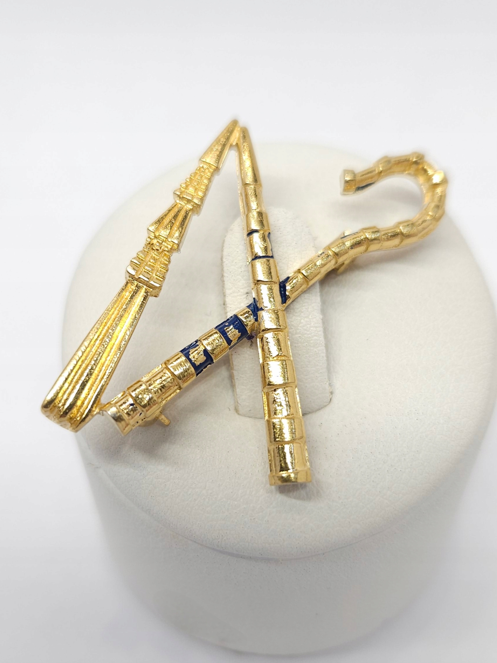 Broszka wykonana z mosiądzu złoconego, w formie egipskich insygniów królewskich, z miejscowymi śladami emalii