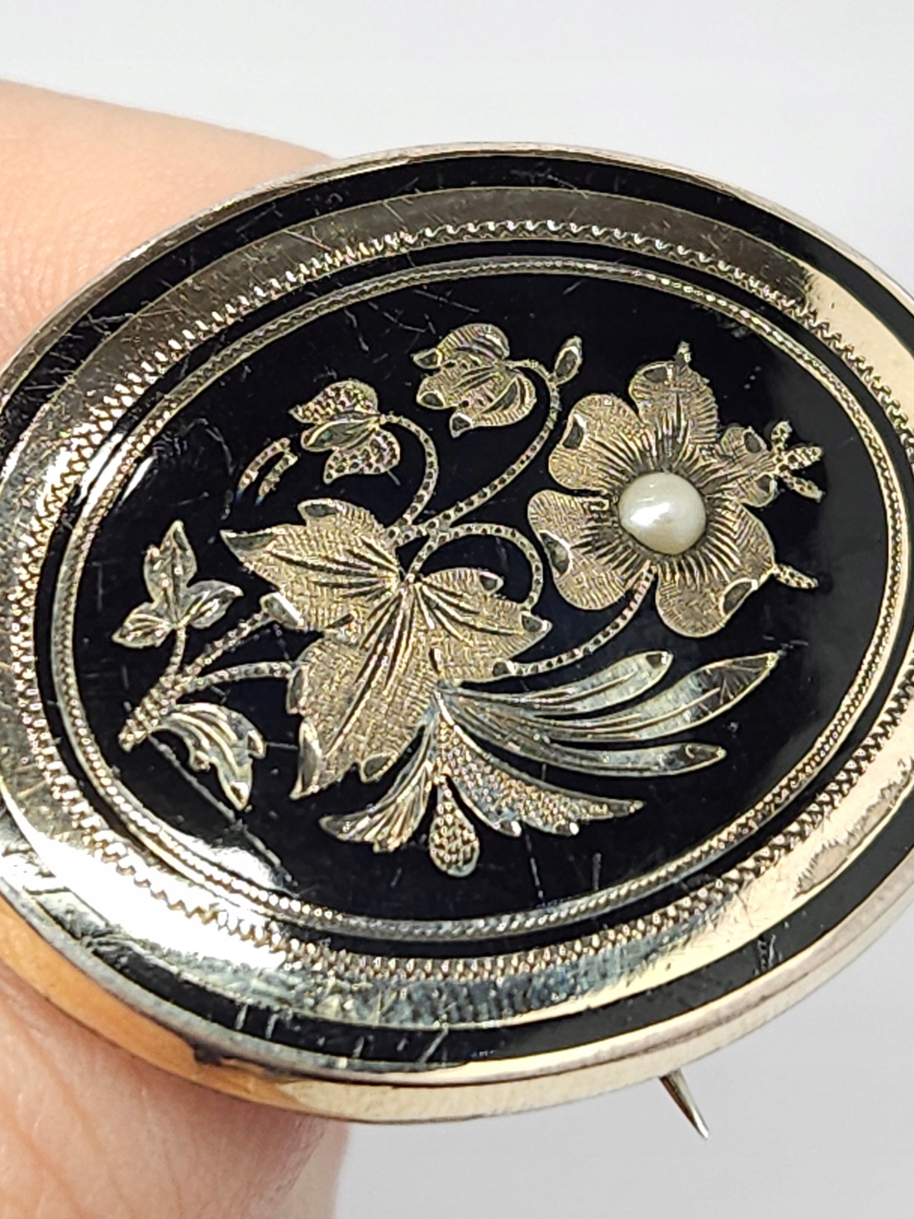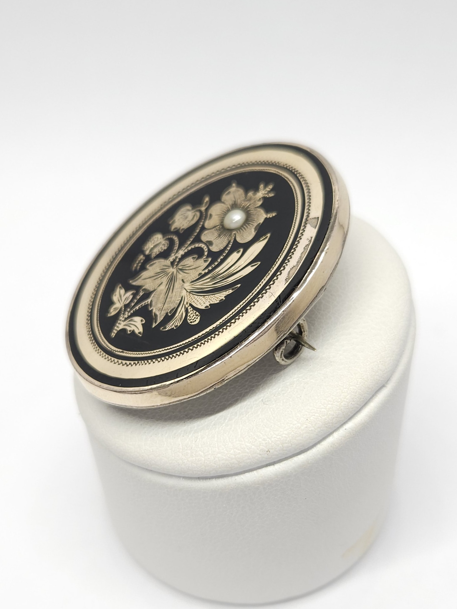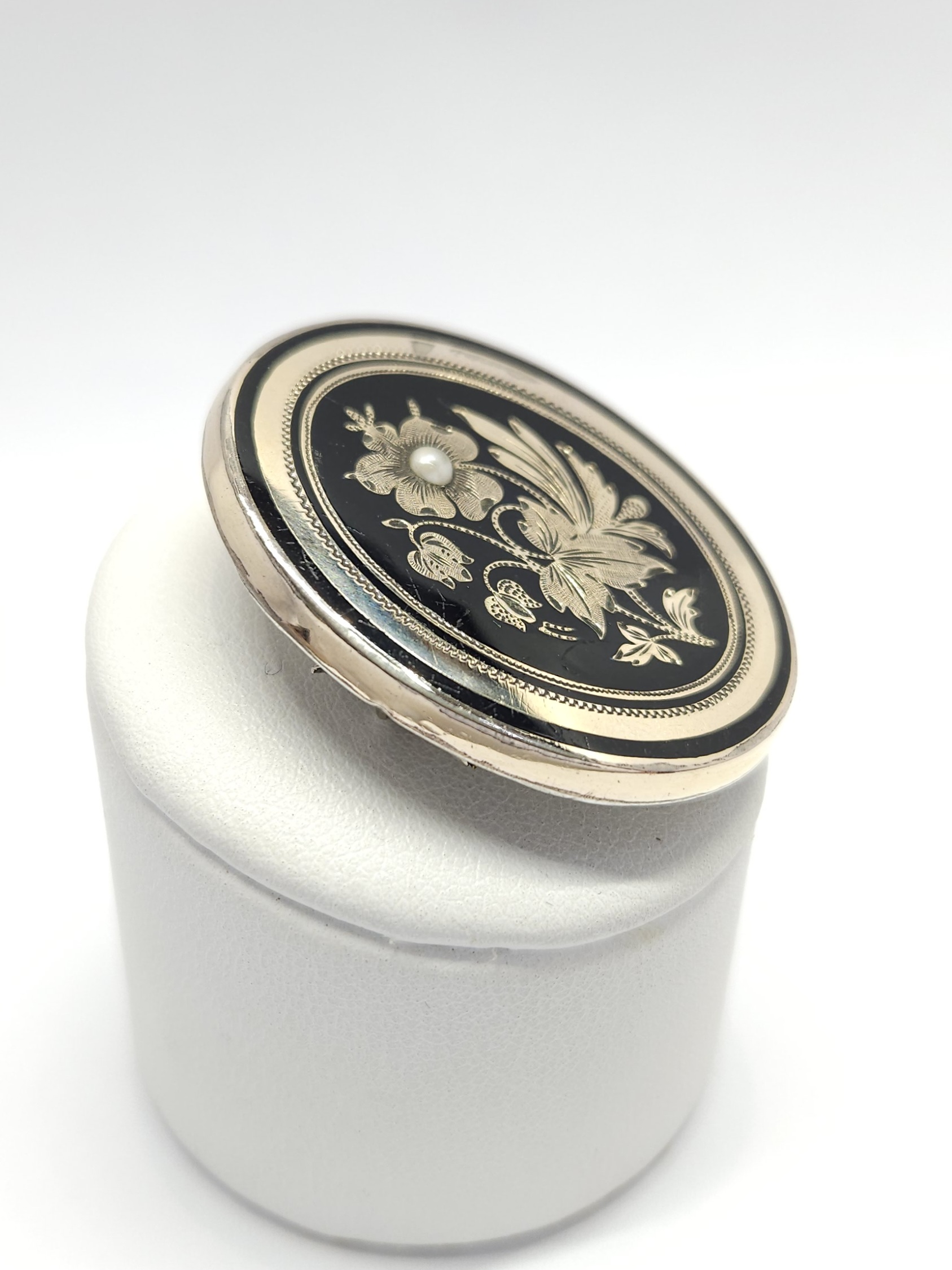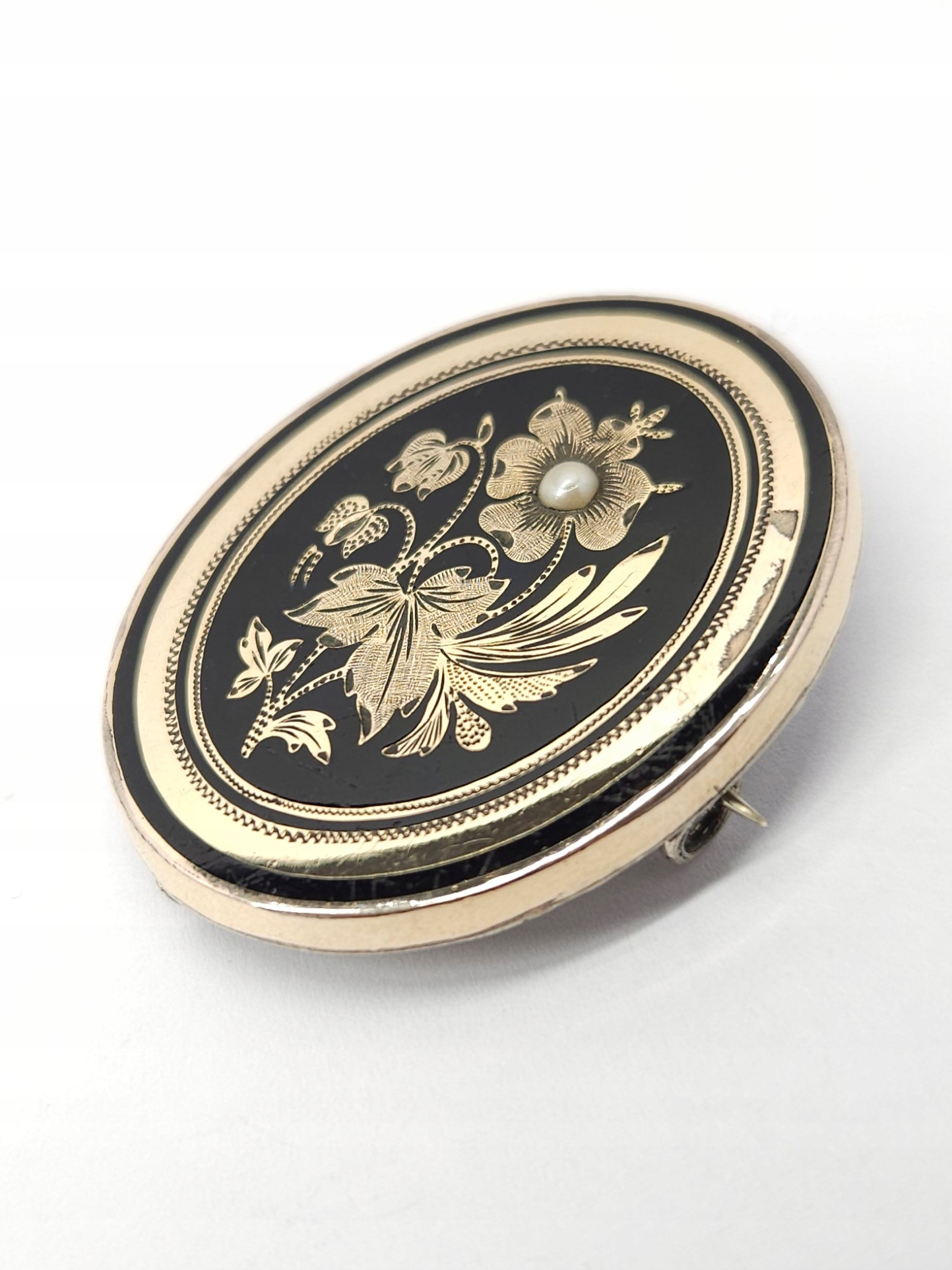 Owalna, pozłacana broszka z 2 poł. XIXw., zdobiona drobną półperłą oraz czarną emalią; przód broszki wykonany z mosiądzu złoconego, tył ze srebra; z racji wieku widoczne przetarcia złoceń i drobne mikroryski