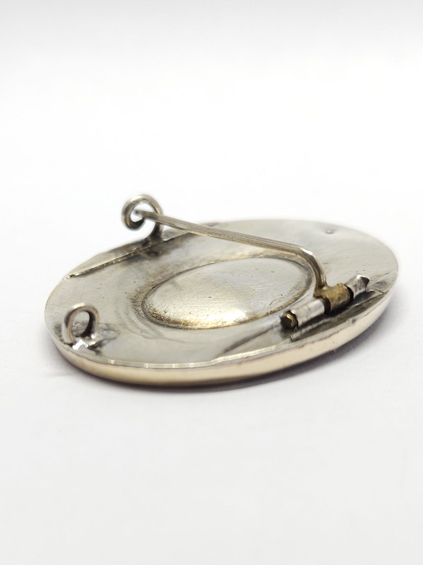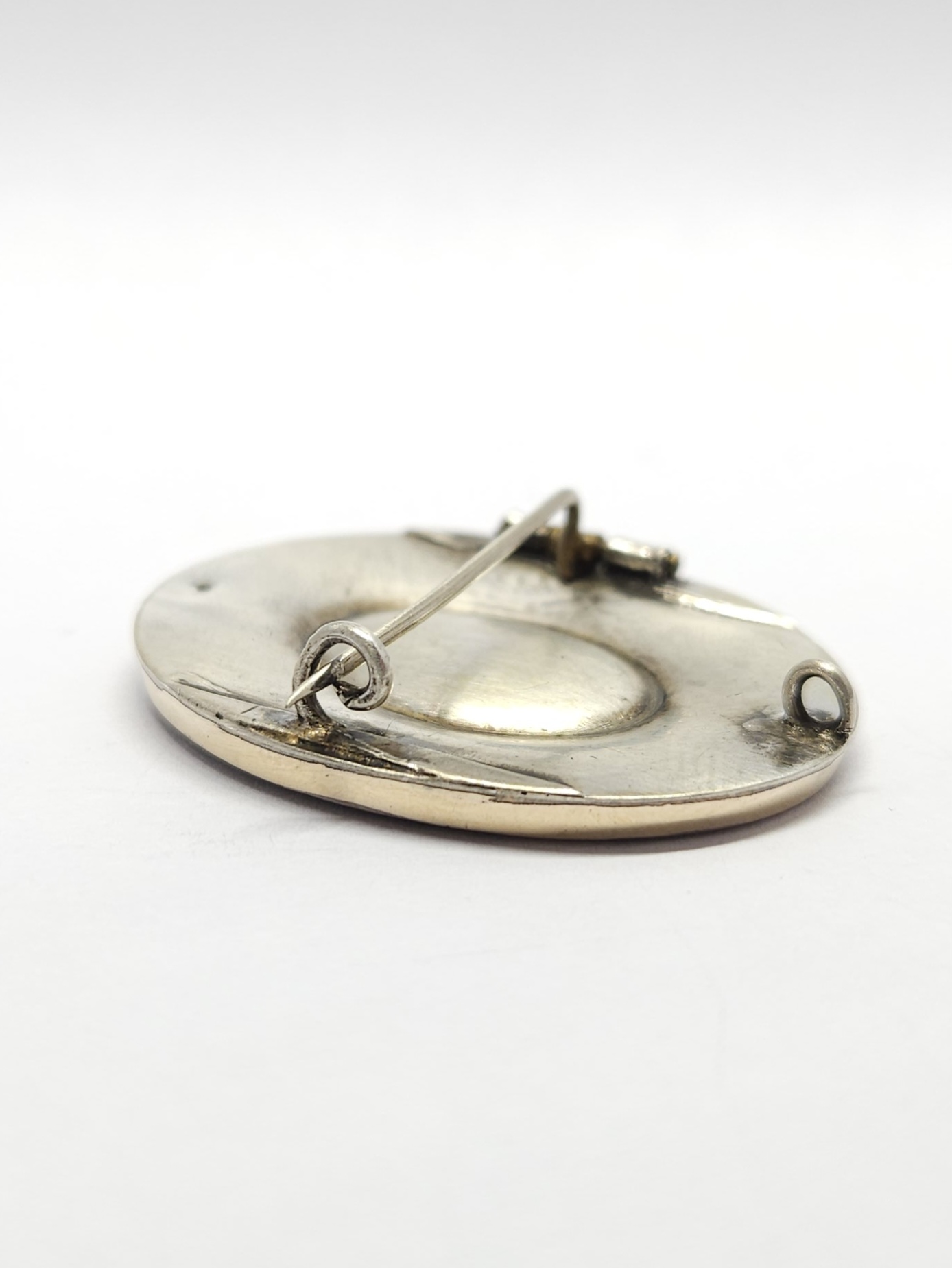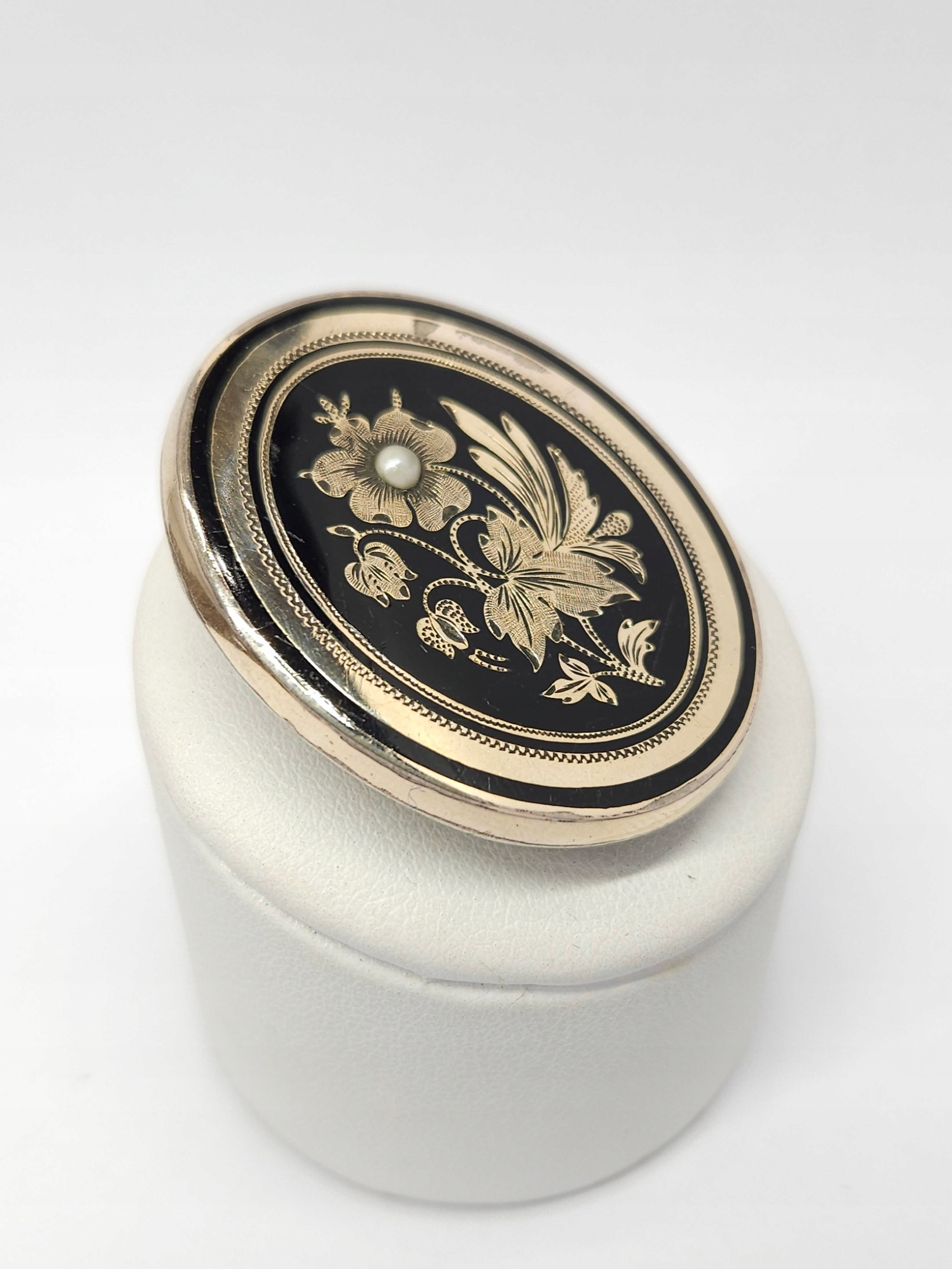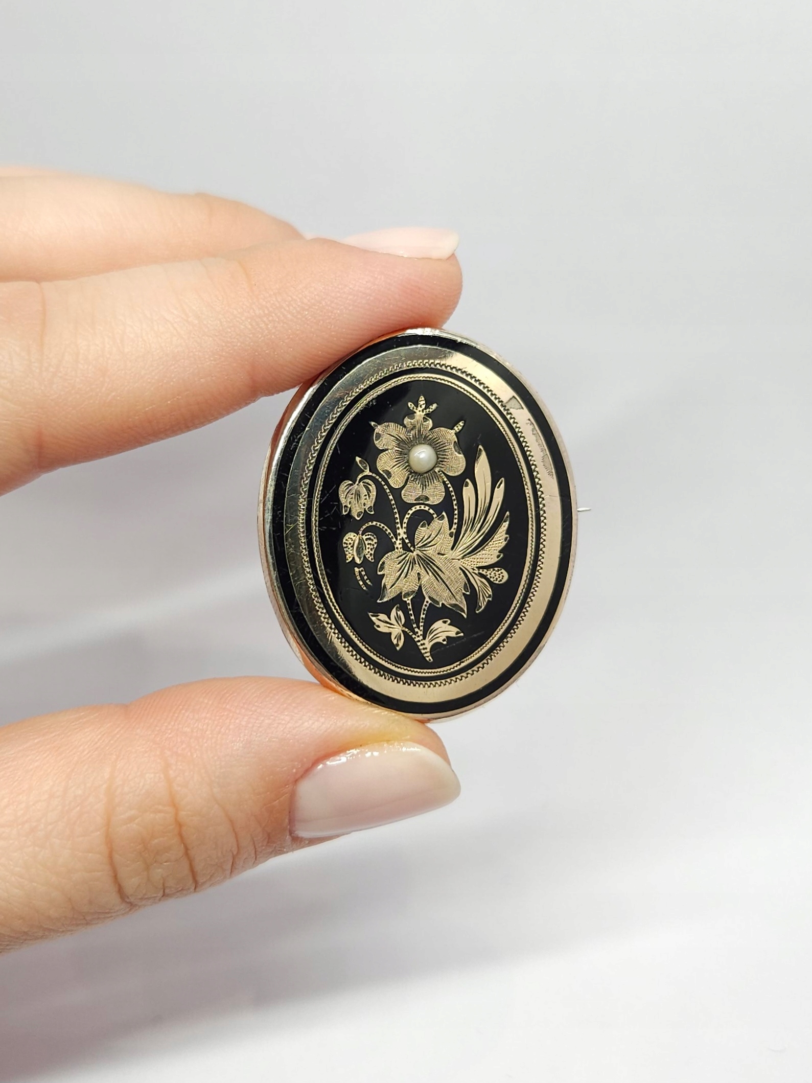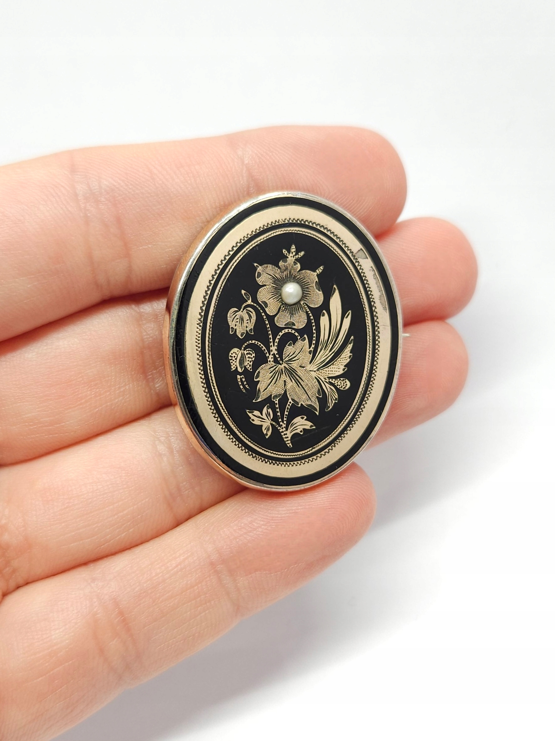 Owalna, pozłacana broszka z 2 poł. XIXw., zdobiona drobną półperłą oraz czarną emalią; przód broszki wykonany z mosiądzu złoconego, tył ze srebra; z racji wieku widoczne przetarcia złoceń i drobne mikroryski