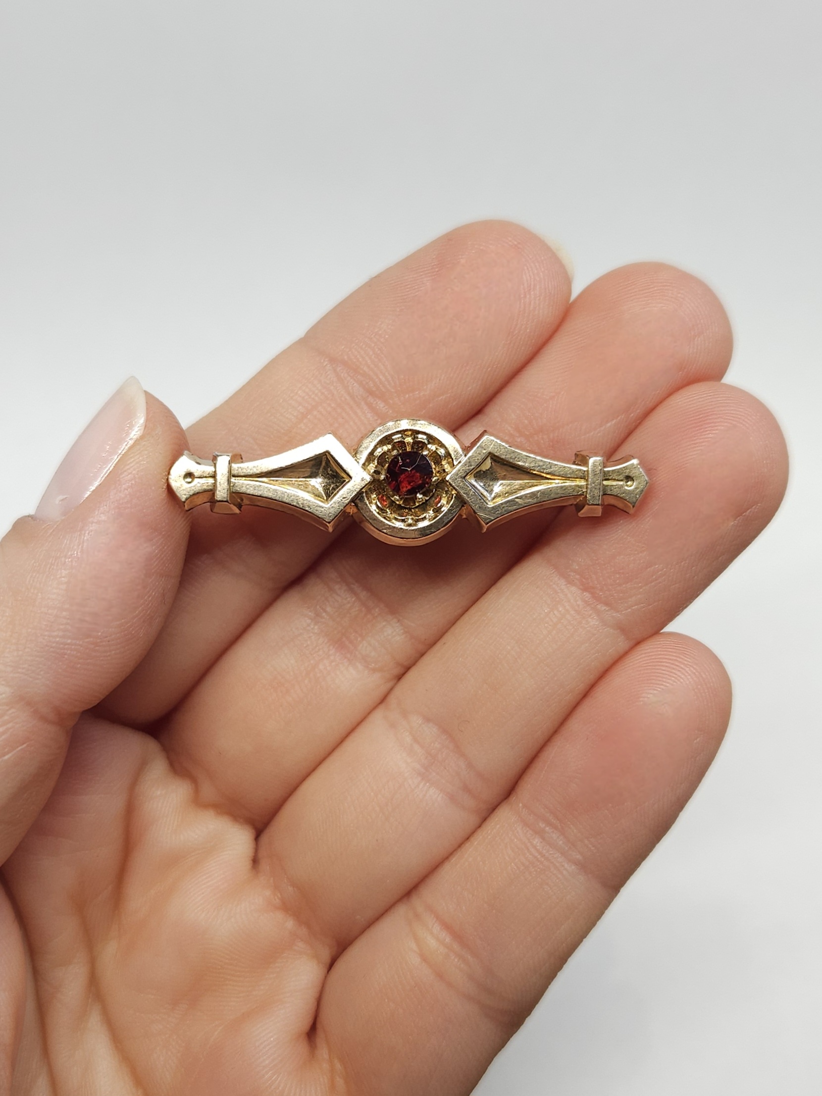 Strona główna » Sklep » Pozłacana broszka z granatem, XIX/XXw., srebro złocone 0,800, mosiądz złoc.