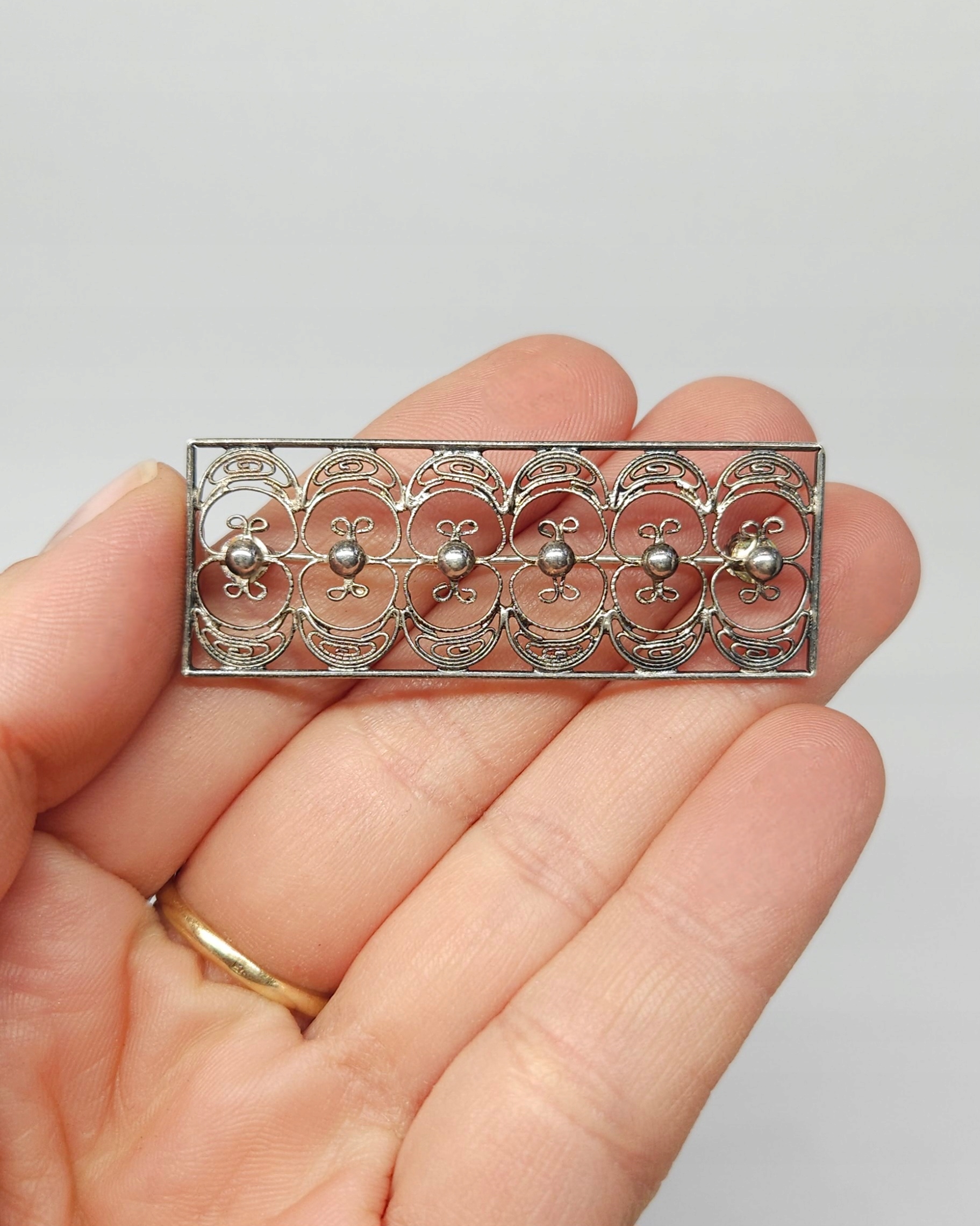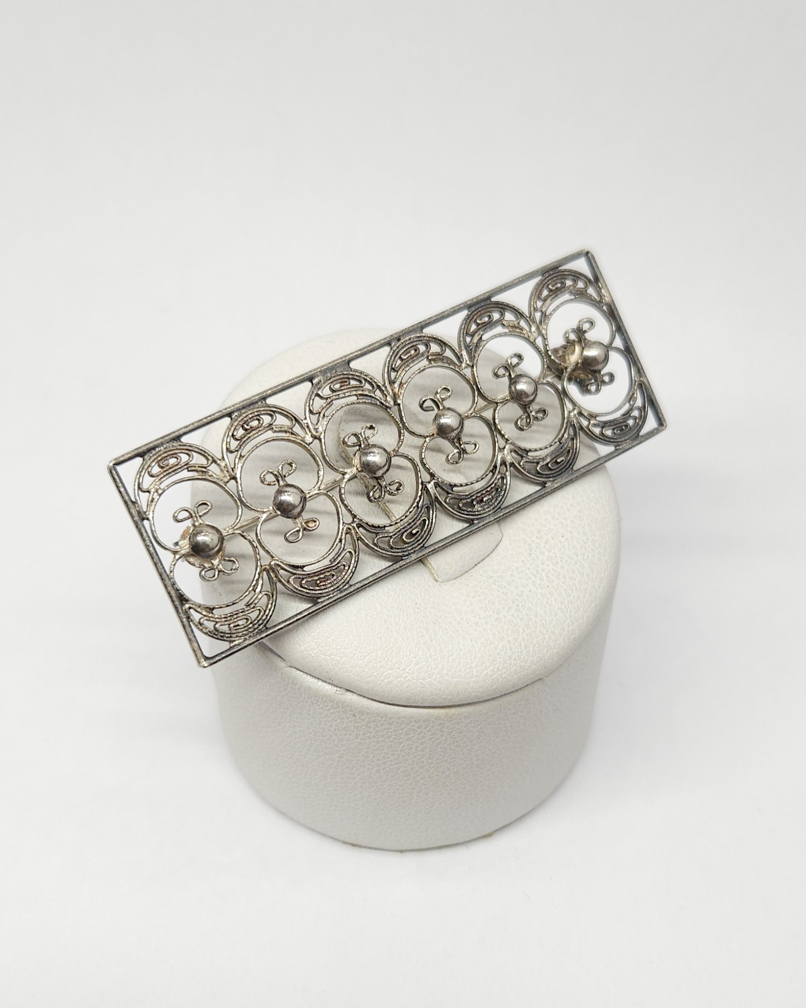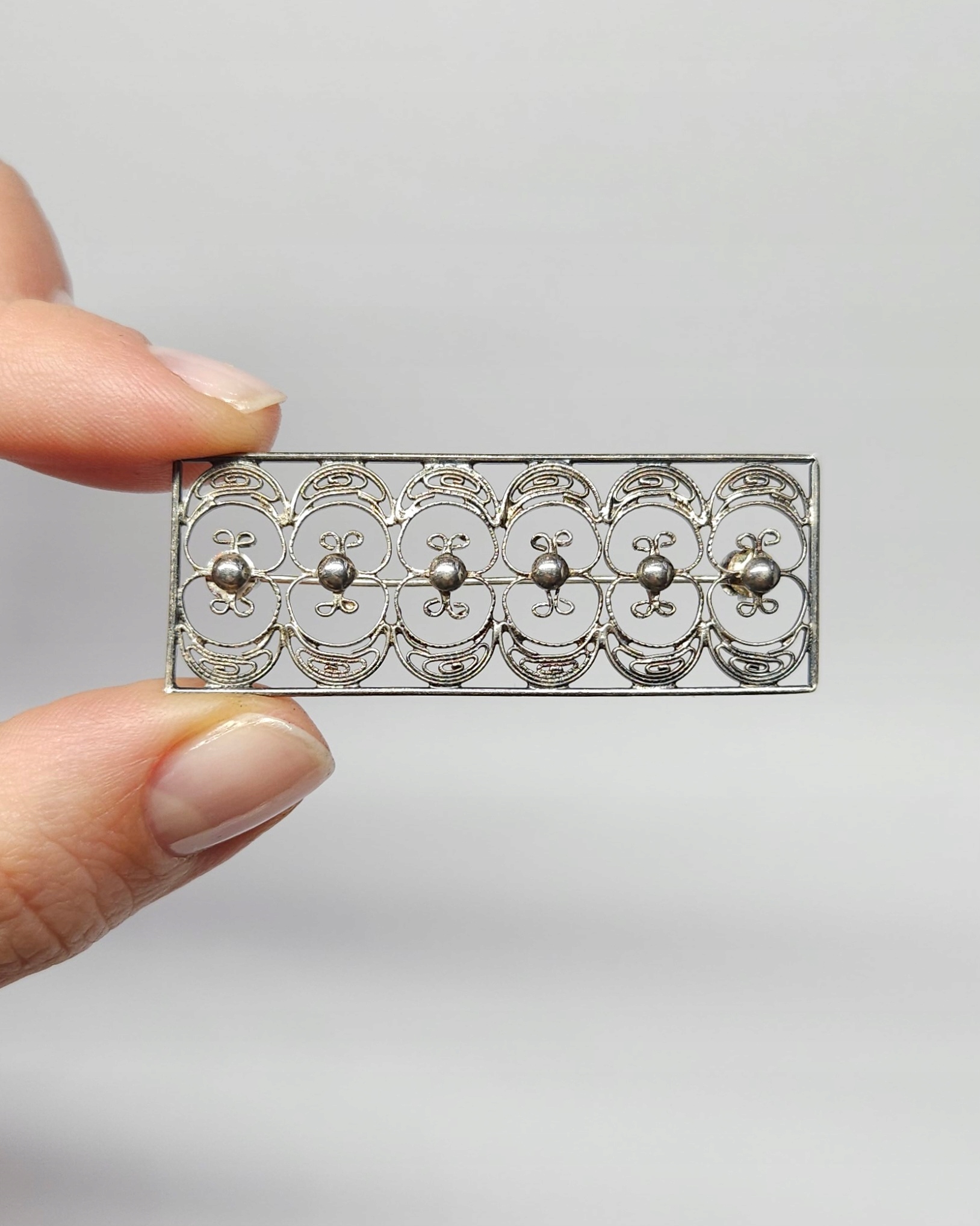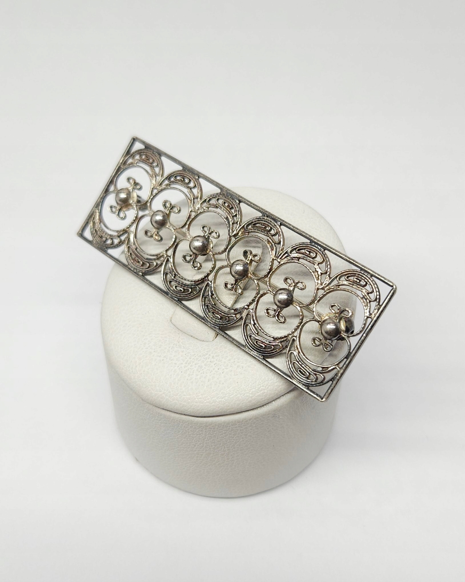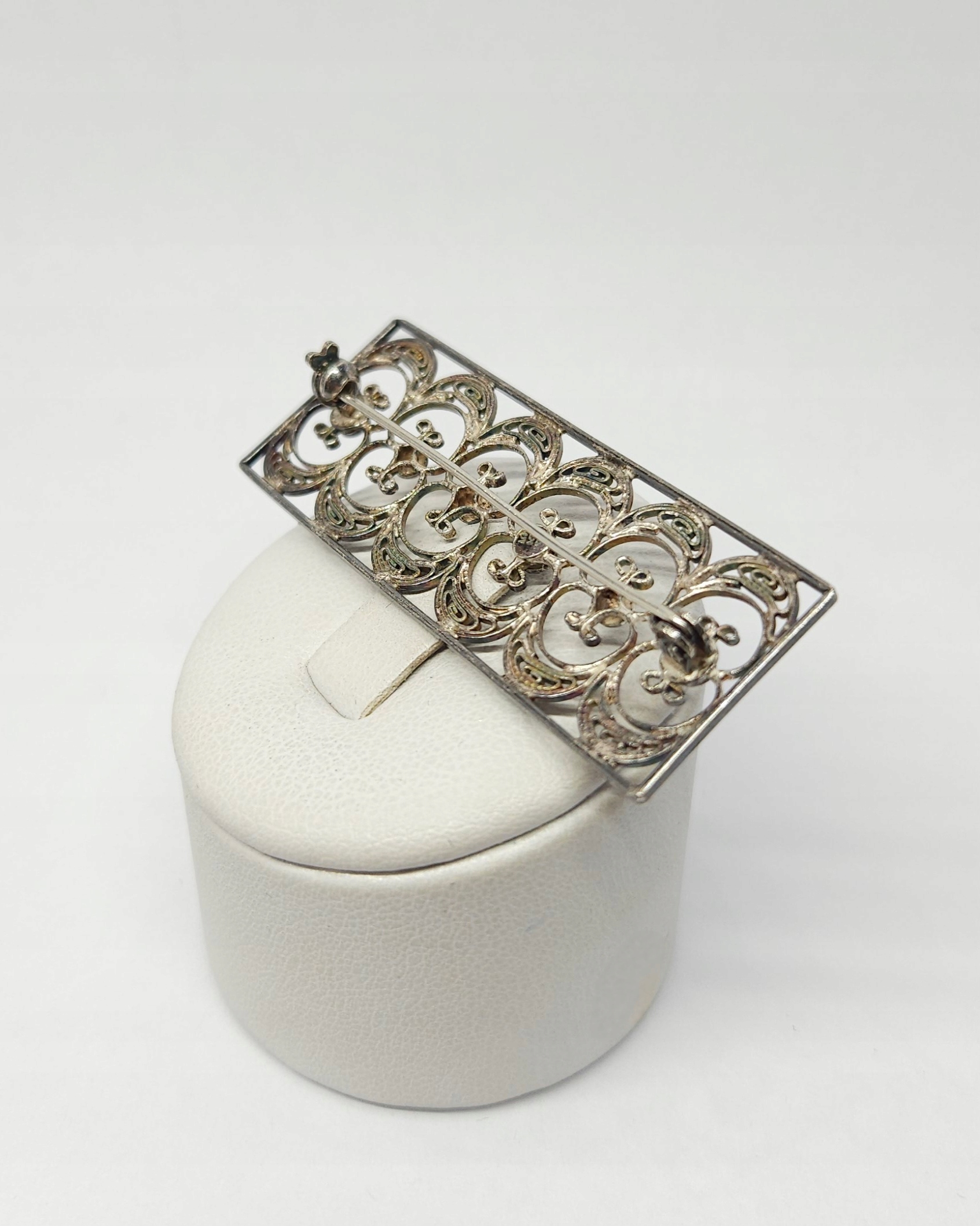 Srebrna, prostokątna, ażurowa broszka, wykonana w technice filigranu