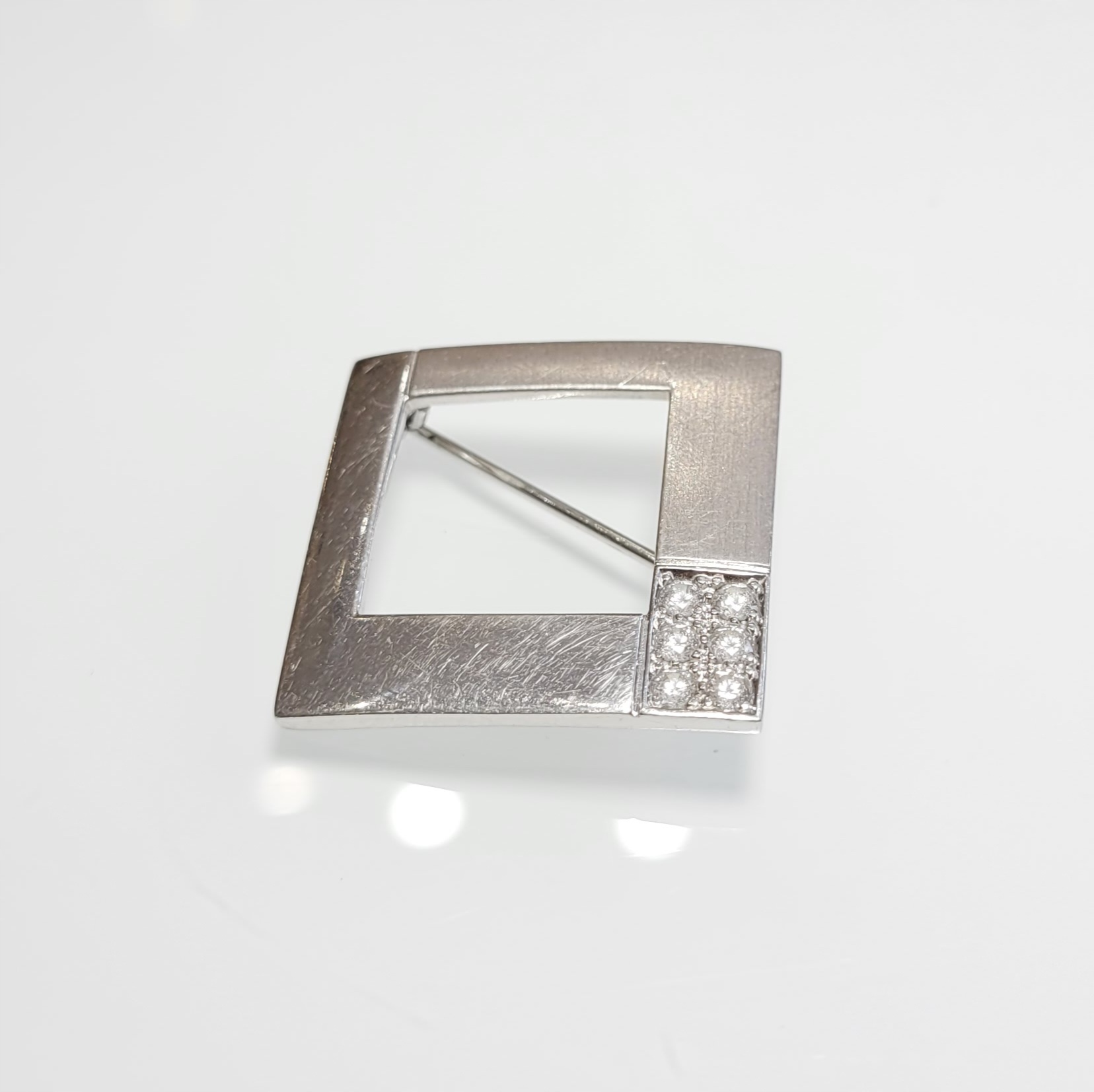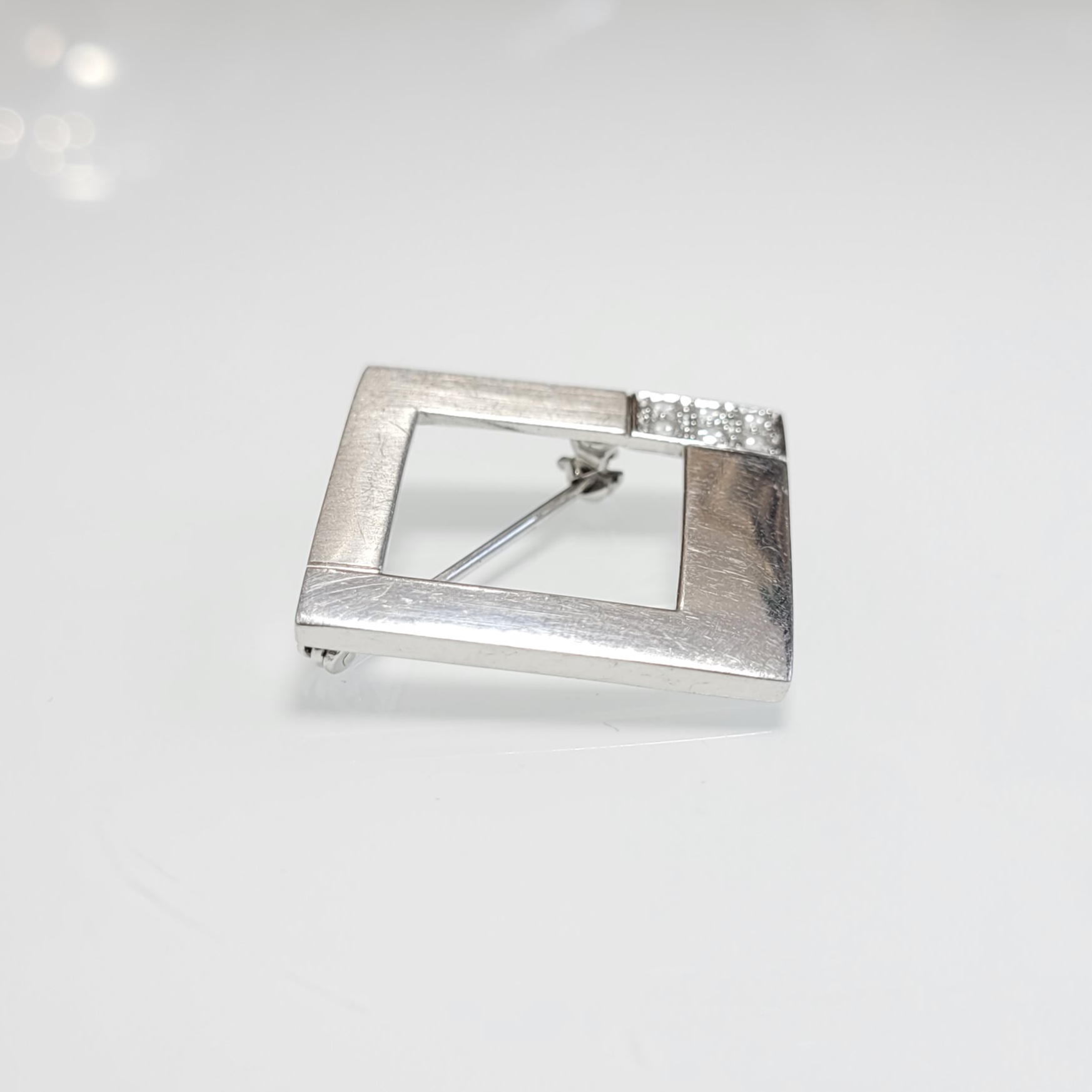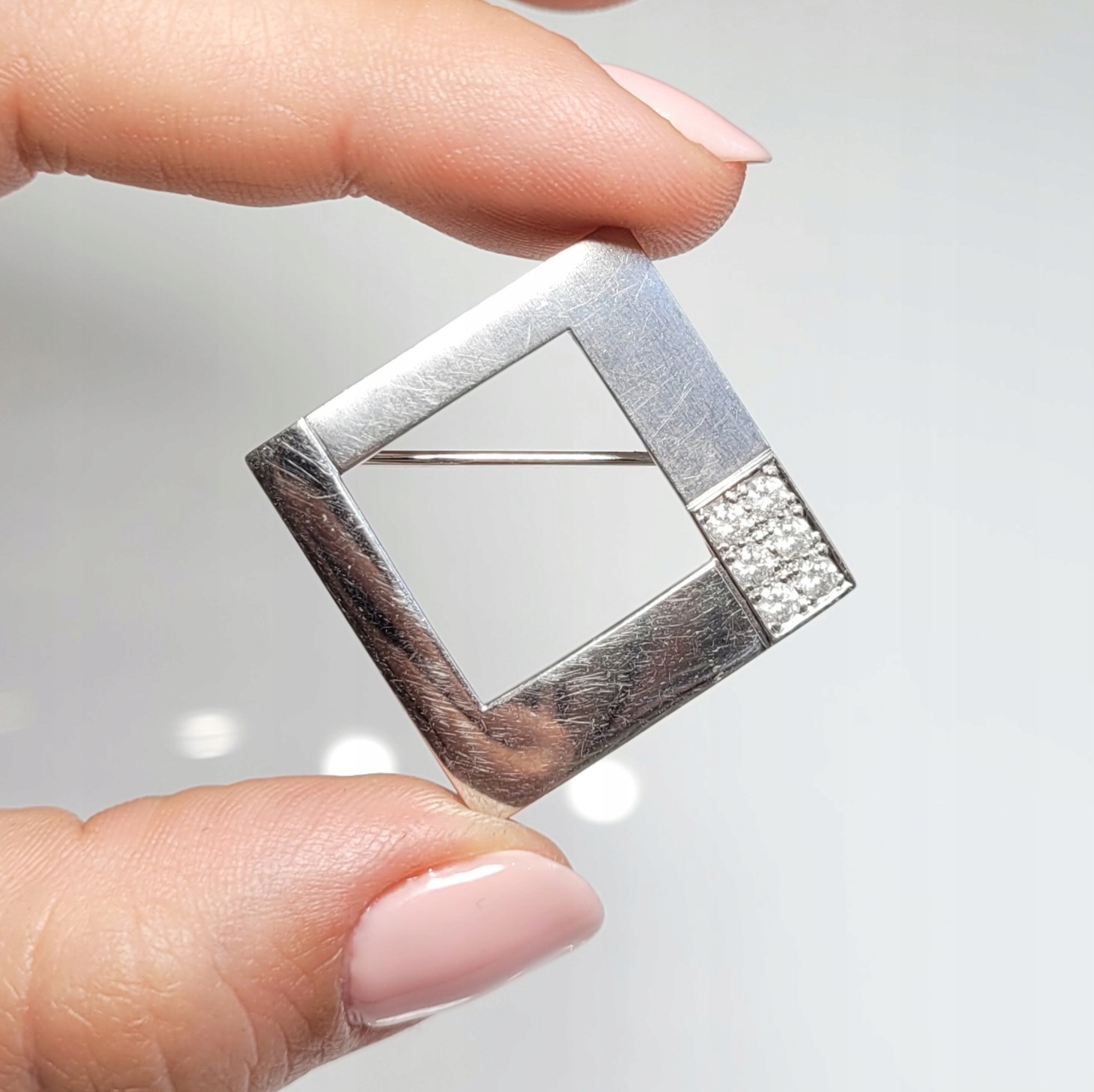 Srebrna, kwadratowa broszka, zdobiona cyrkoniami; powierzchnia broszki jest częściowo polerowana a częściowo matowiona