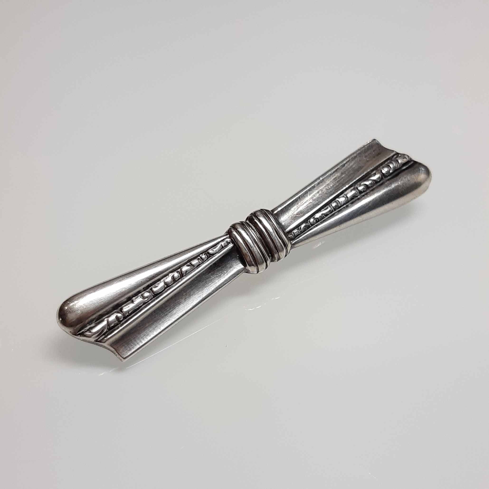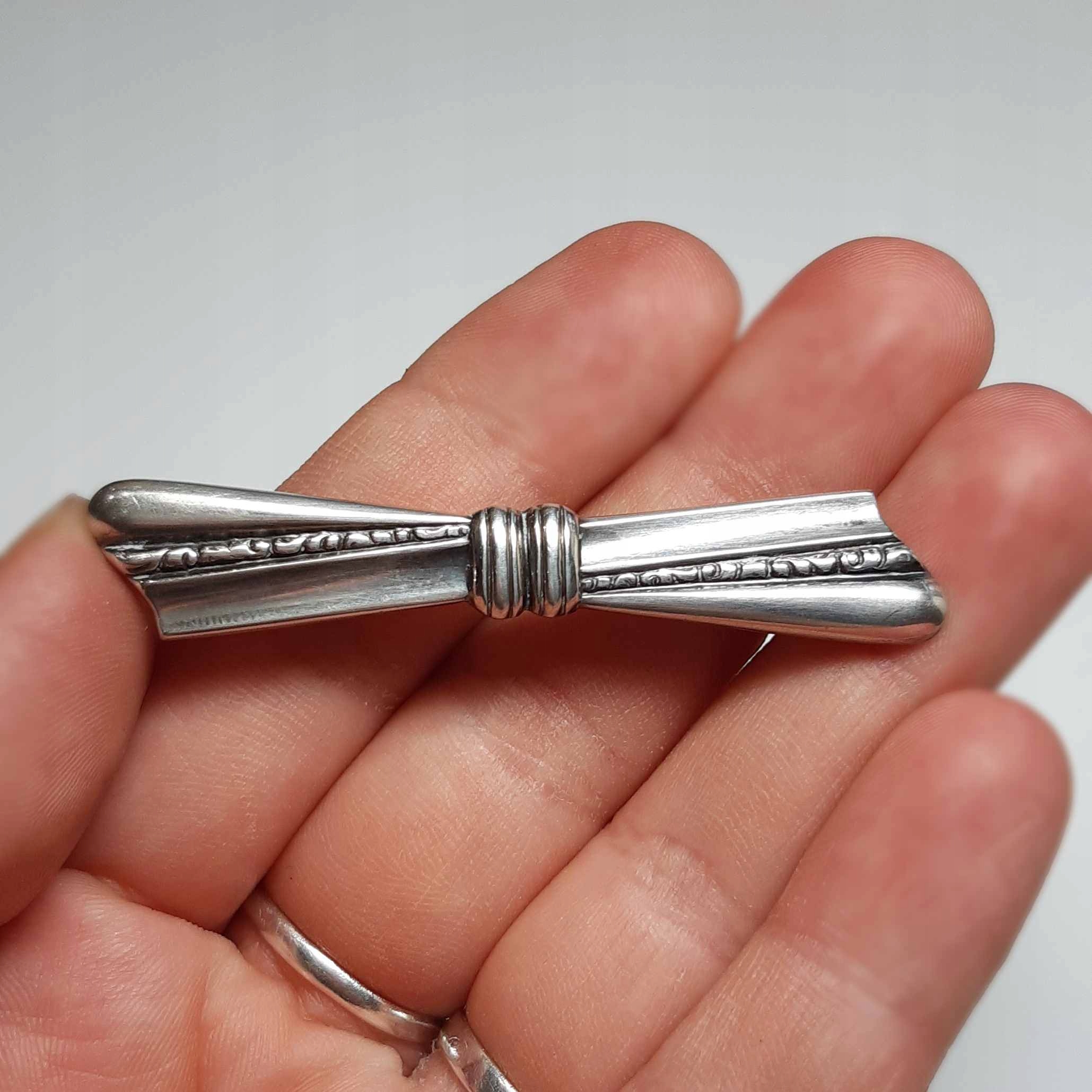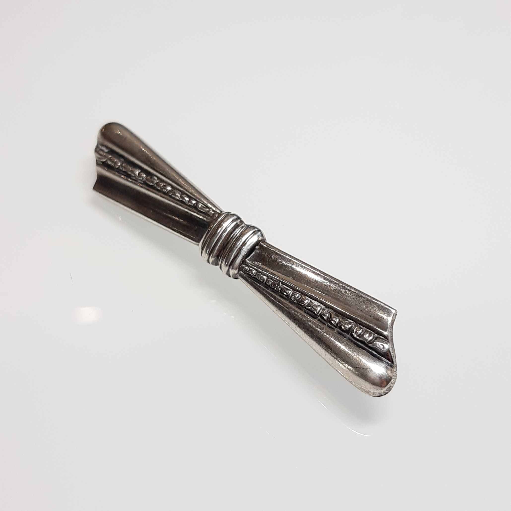 Srebrna broszka w kształcie kokardy, zdobiona delikatnym ornamentem dekoracyjnym