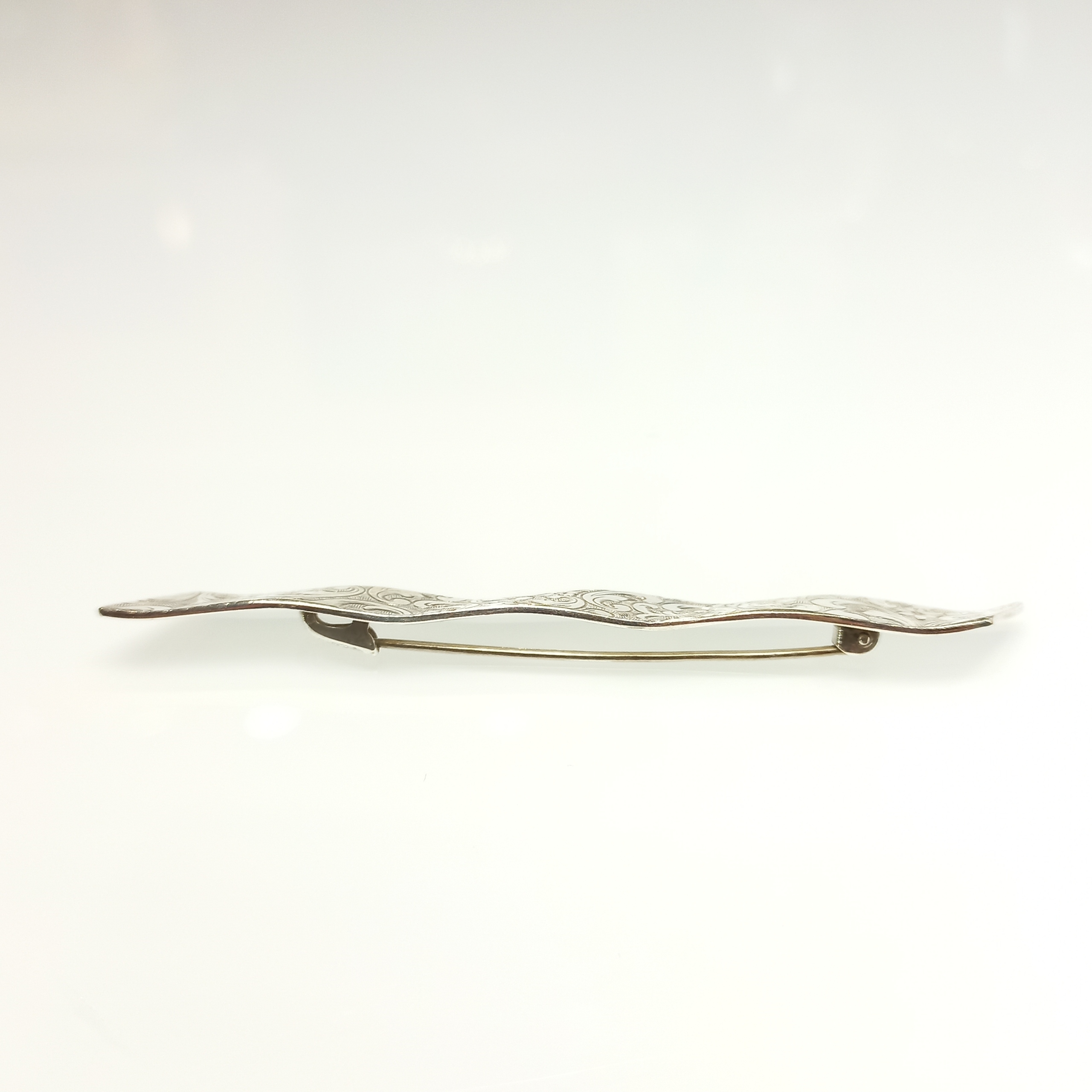 Srebrna, grawerowana, pofalowana broszka