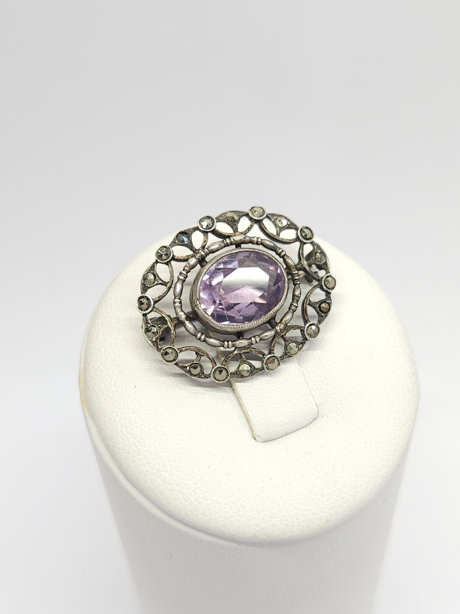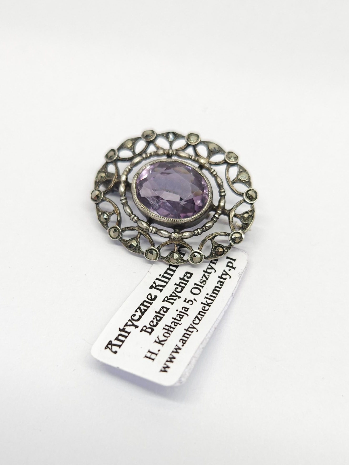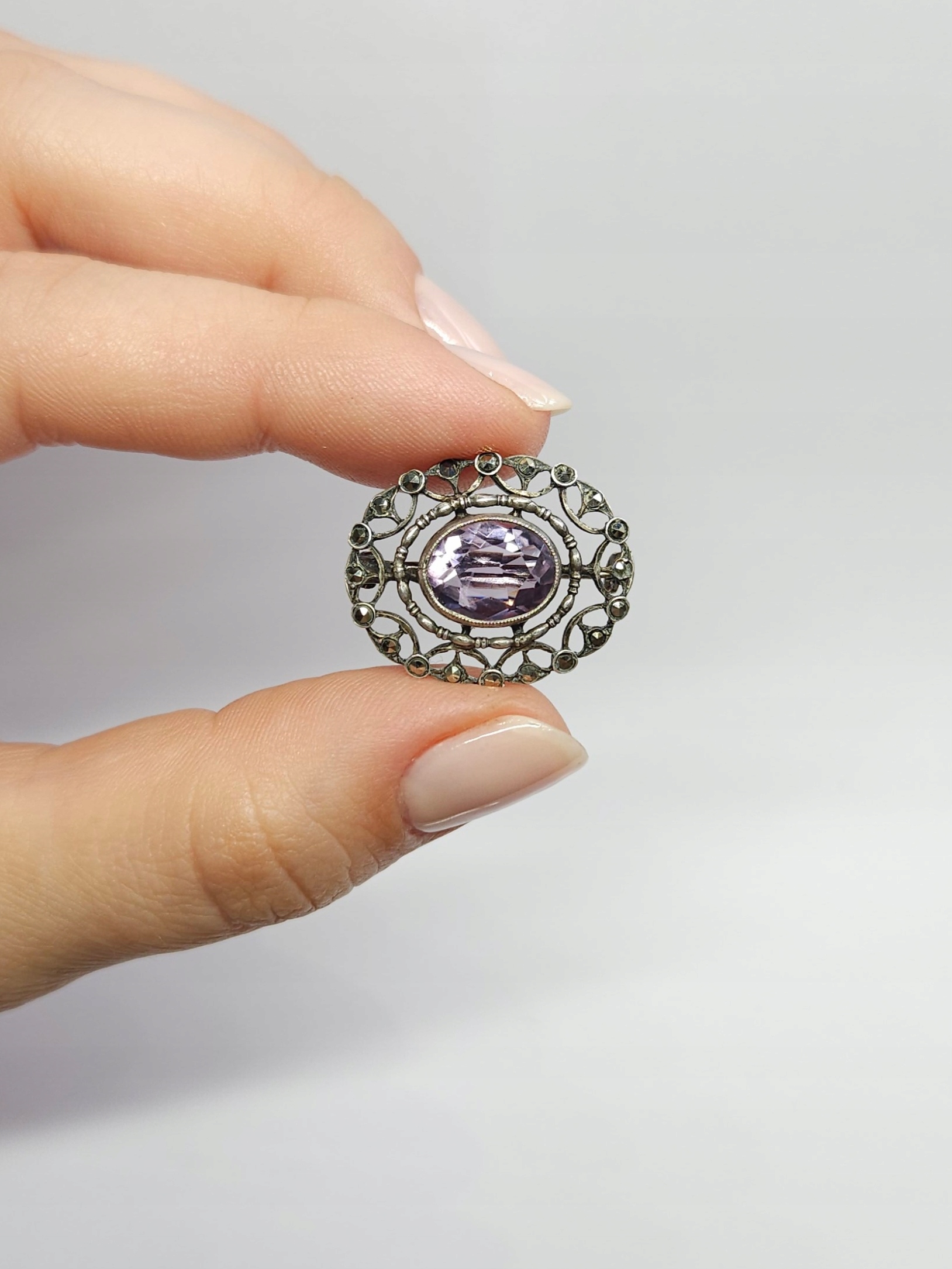 Srebrna, drobna ażurowa broszka z pocz. XXw., zdobiona fasetowanym ametystem i markazytami