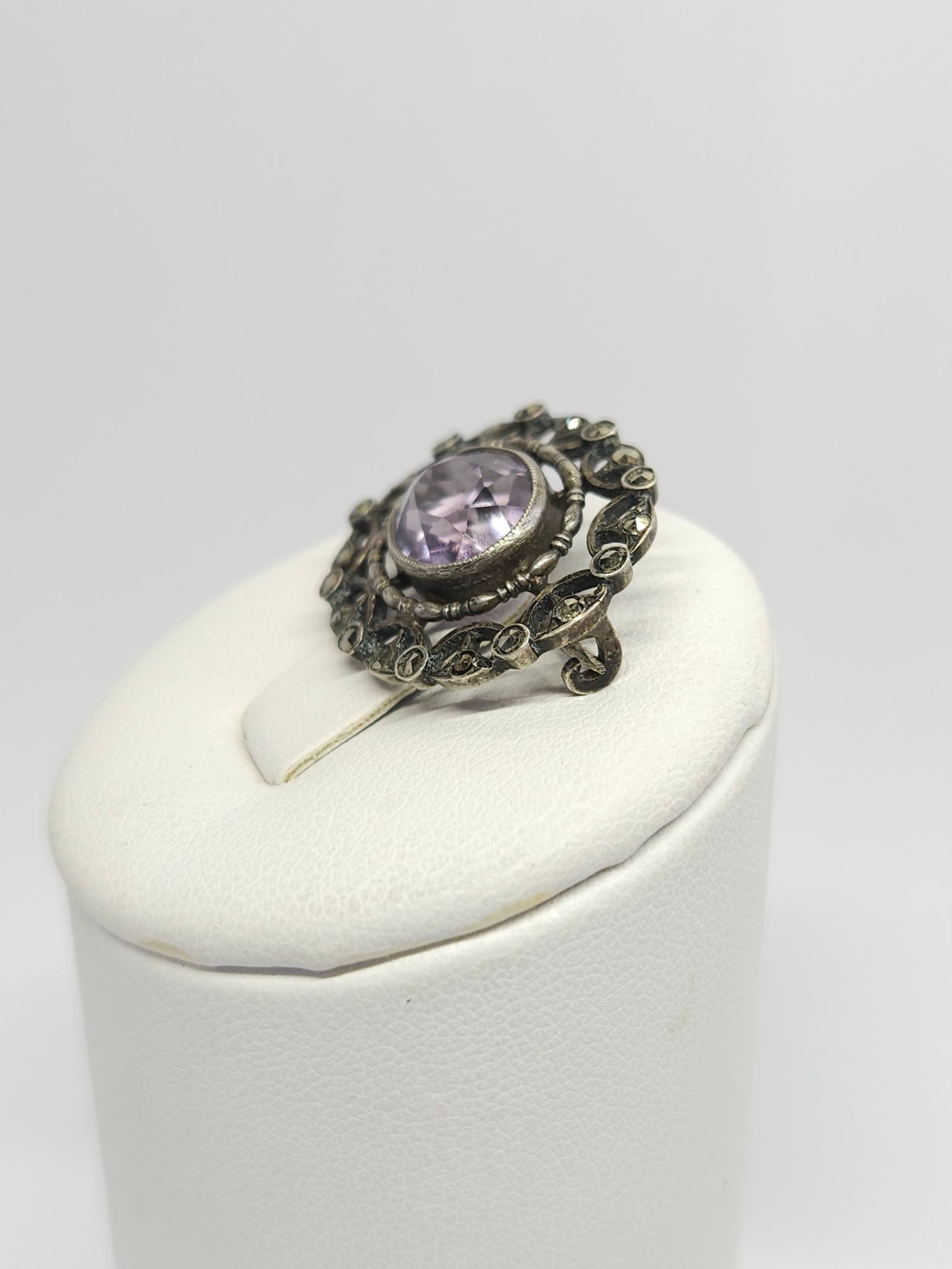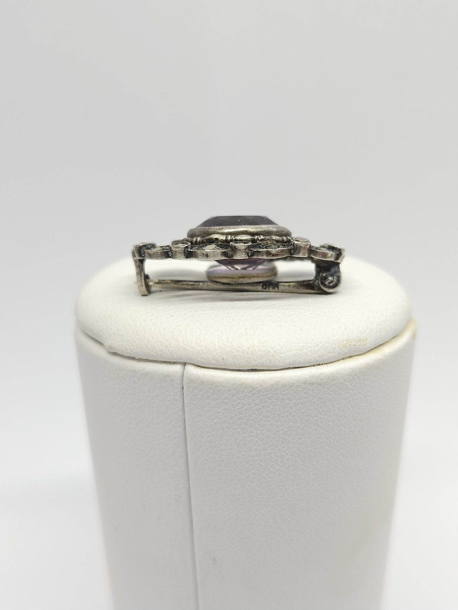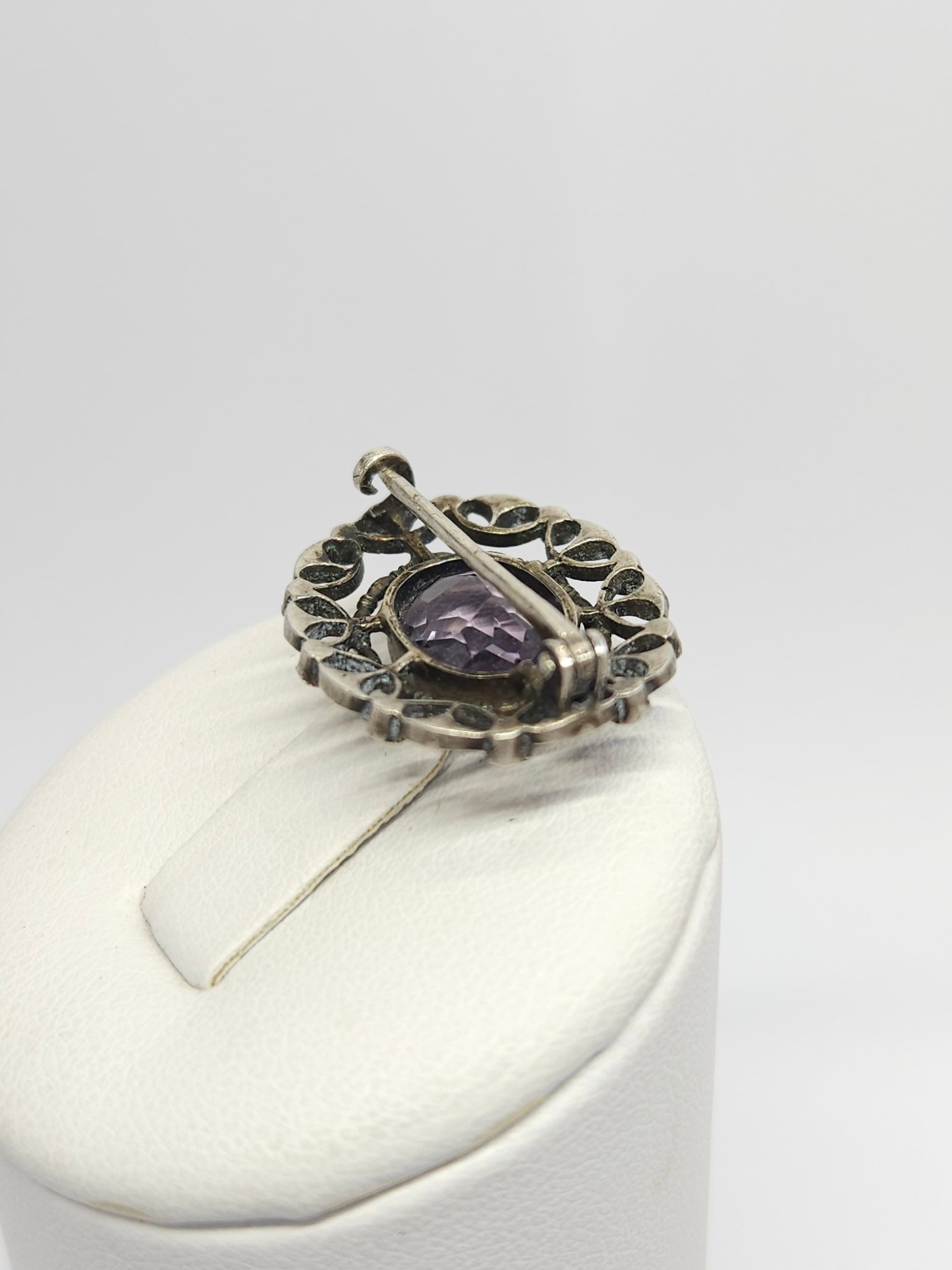 Srebrna, drobna ażurowa broszka z pocz. XXw., zdobiona fasetowanym ametystem i markazytami