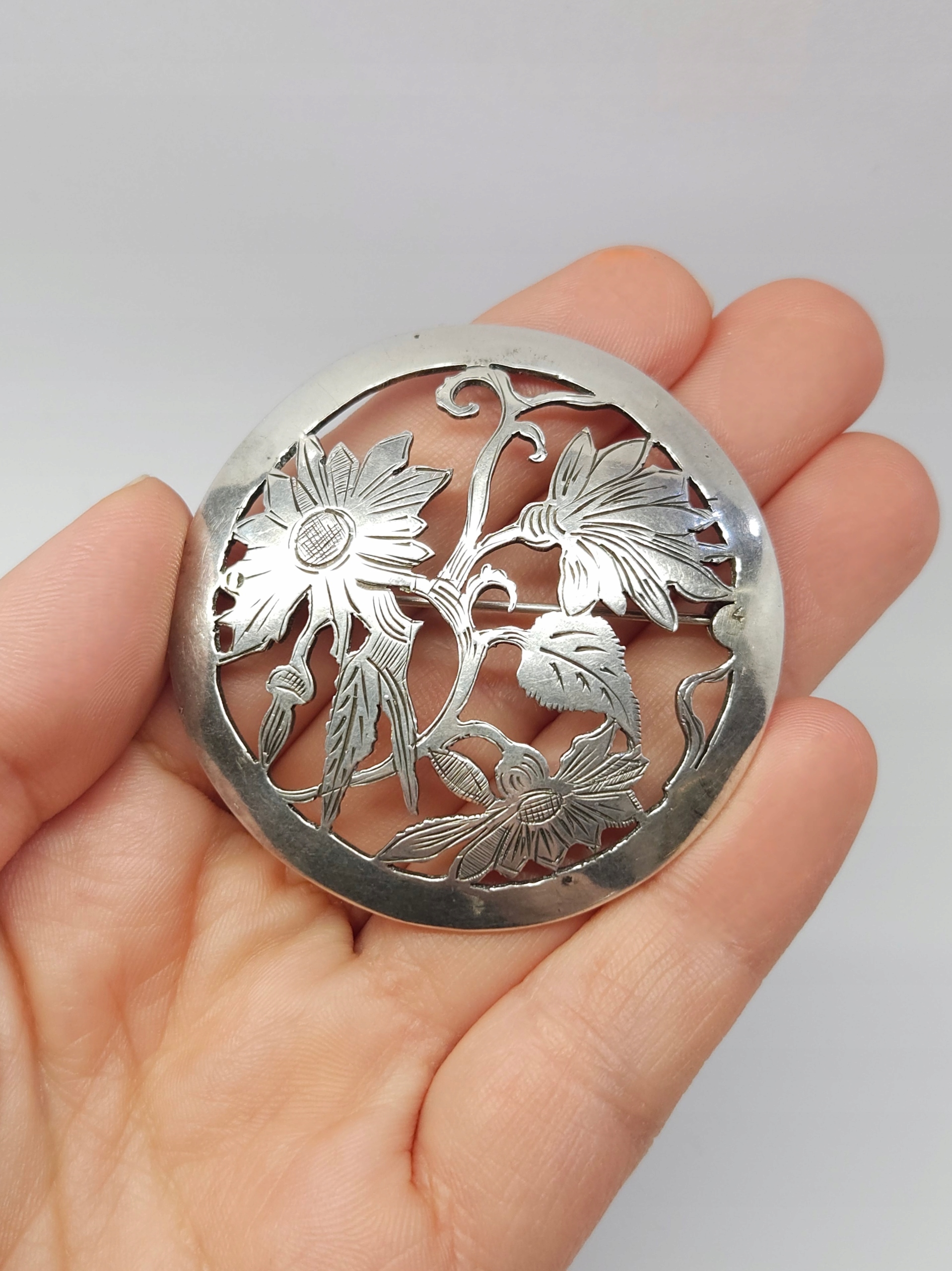 Strona główna » Sklep » Srebrna broszka z ażurowymi kwiatami, srebro pr. 0,900 okrągła