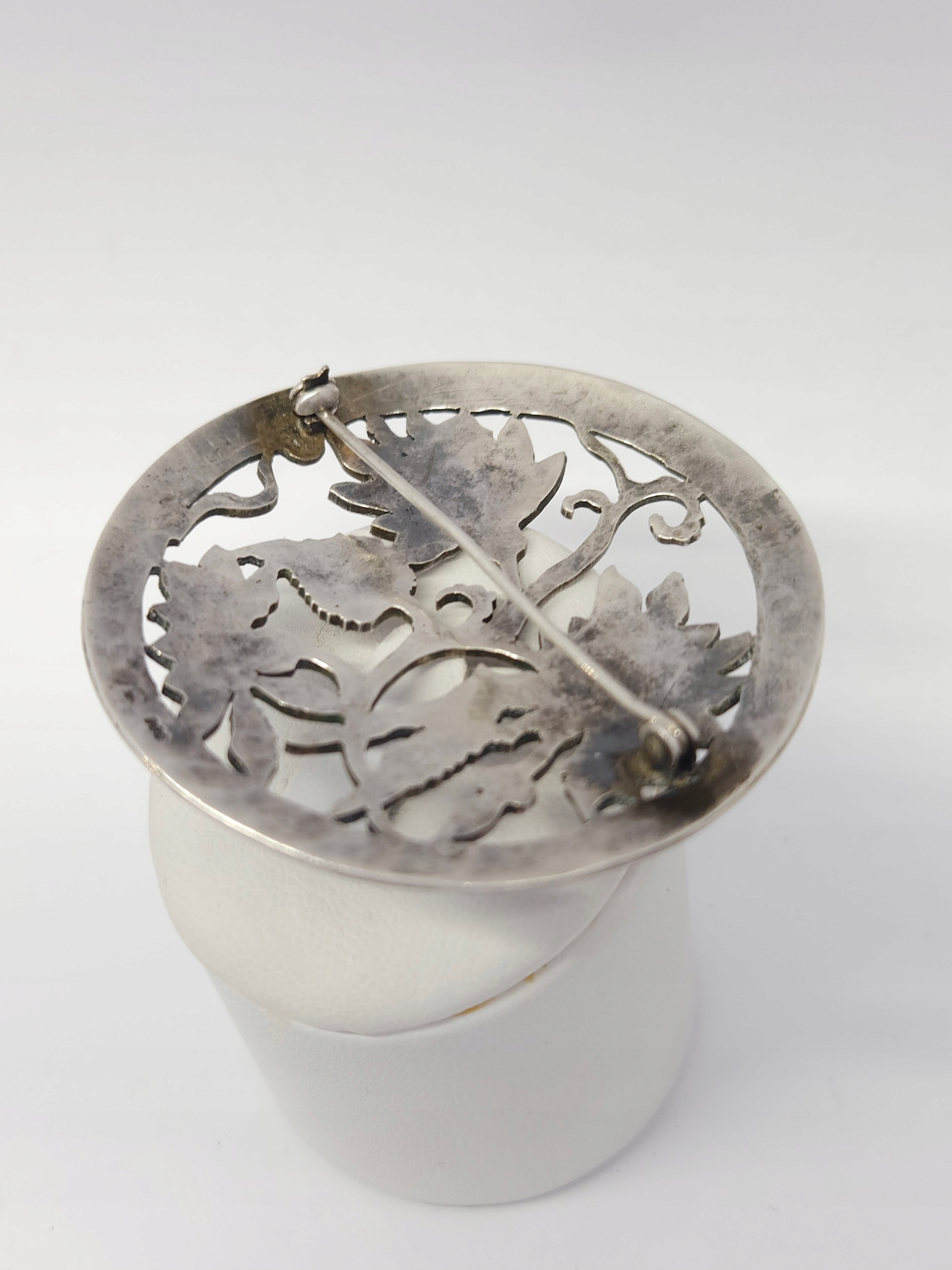 Srebrna, okrągła broszka, zdobiona ażurowym motywem kwiatowym w stylu wycinanki, o uwypuklonej powierzchni; broszka posiada bezpieczne zapięcie z zabezpieczeniem