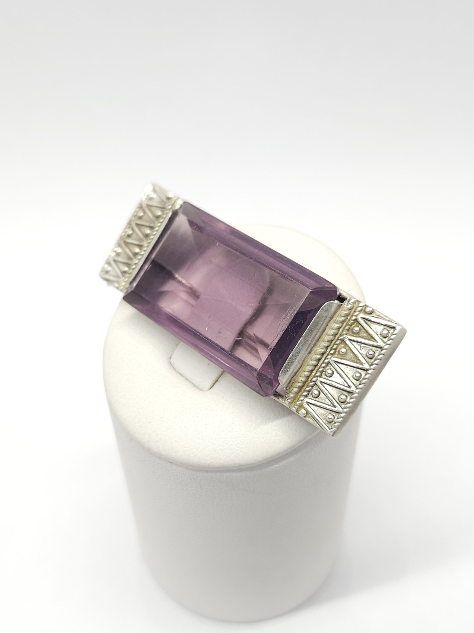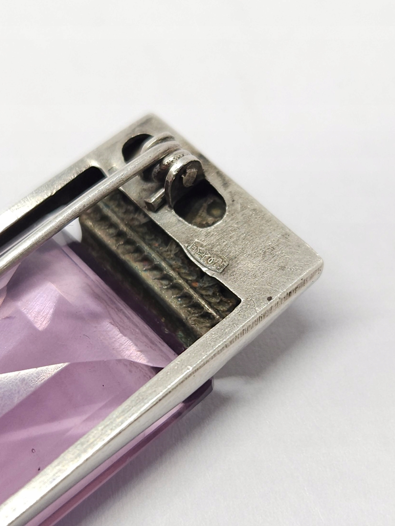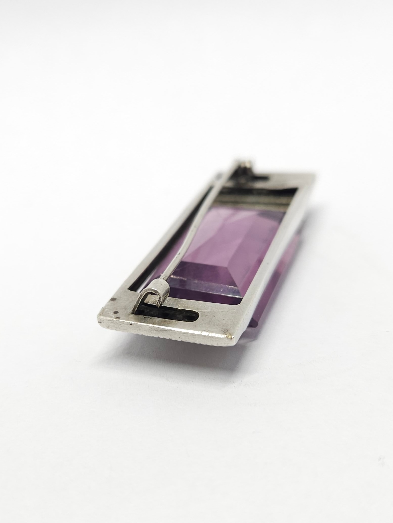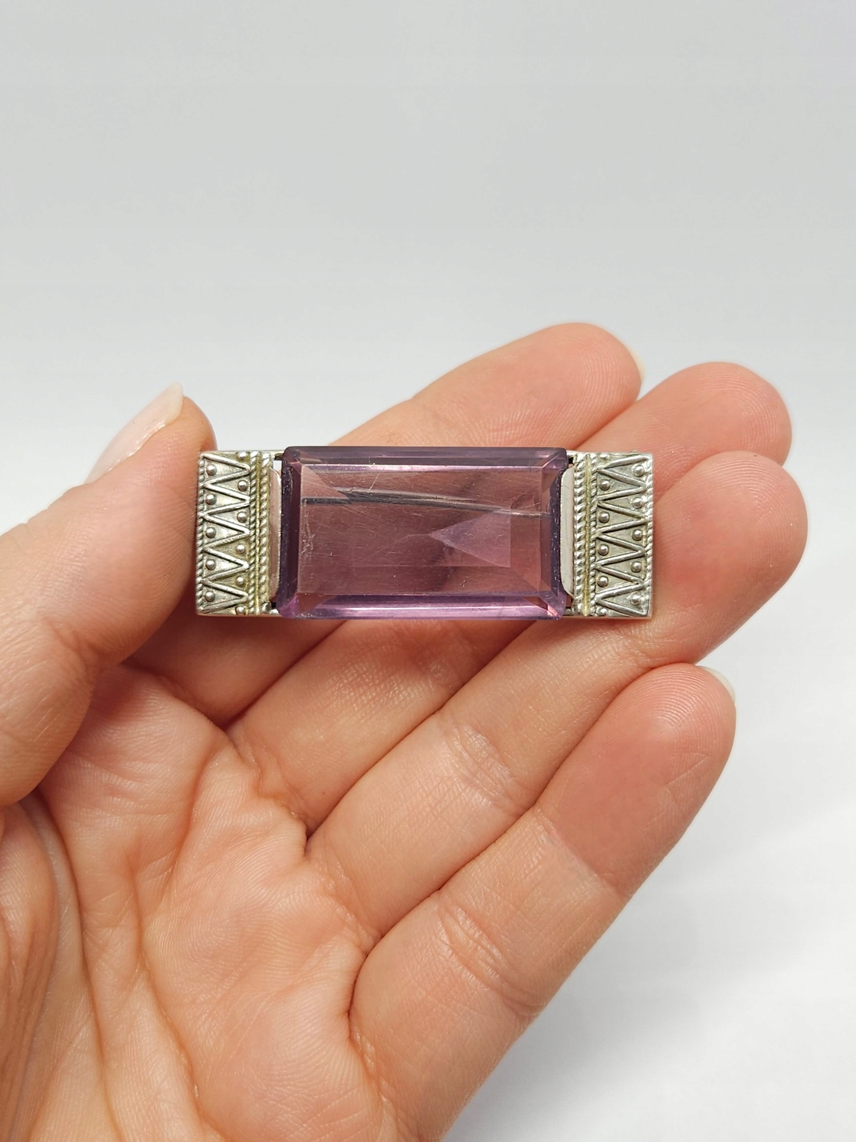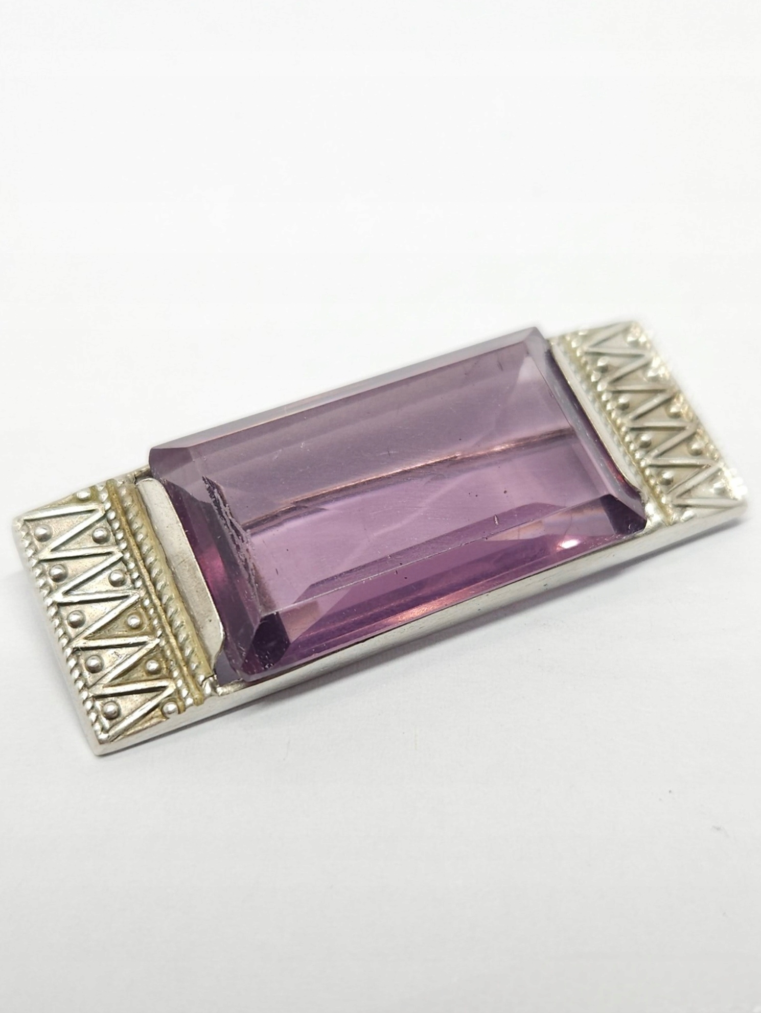 Geometryczna, srebrna broszka z dużym, fioletowym kamieniem ze szkła barwionego; z racji wieku możliwe drobne mikroryski