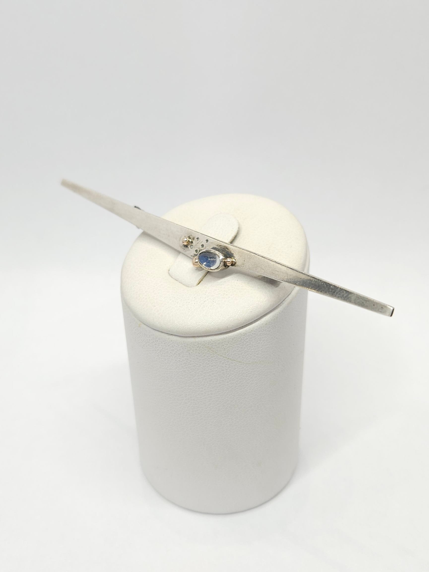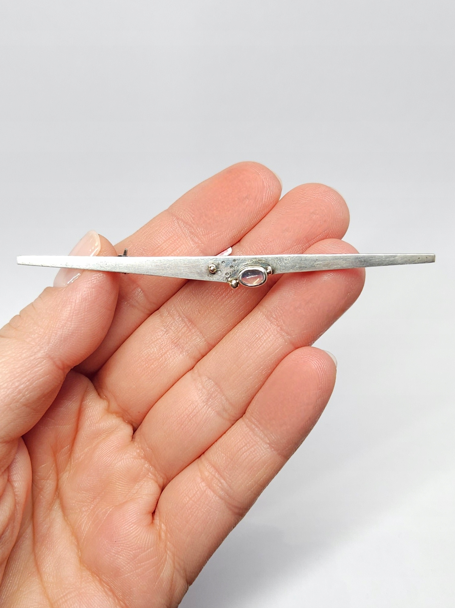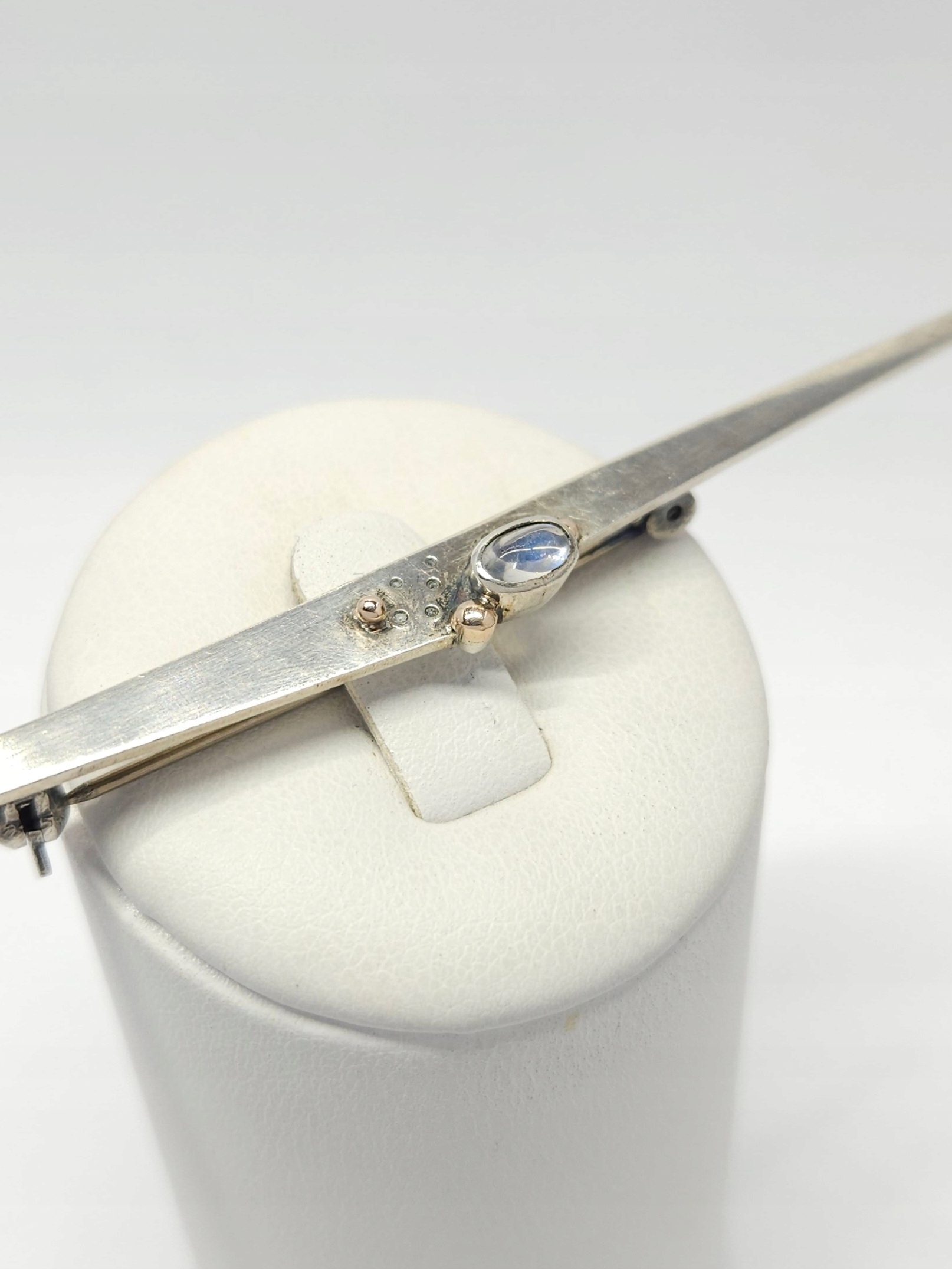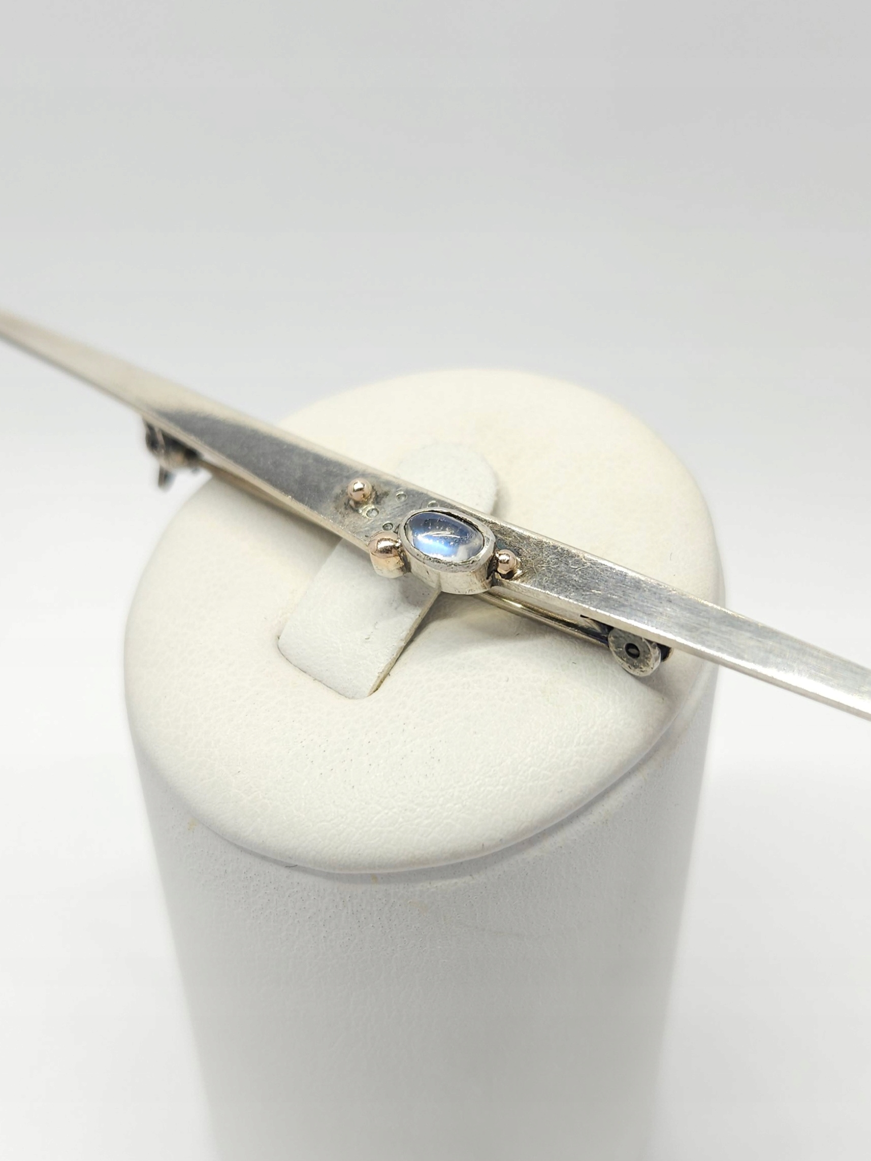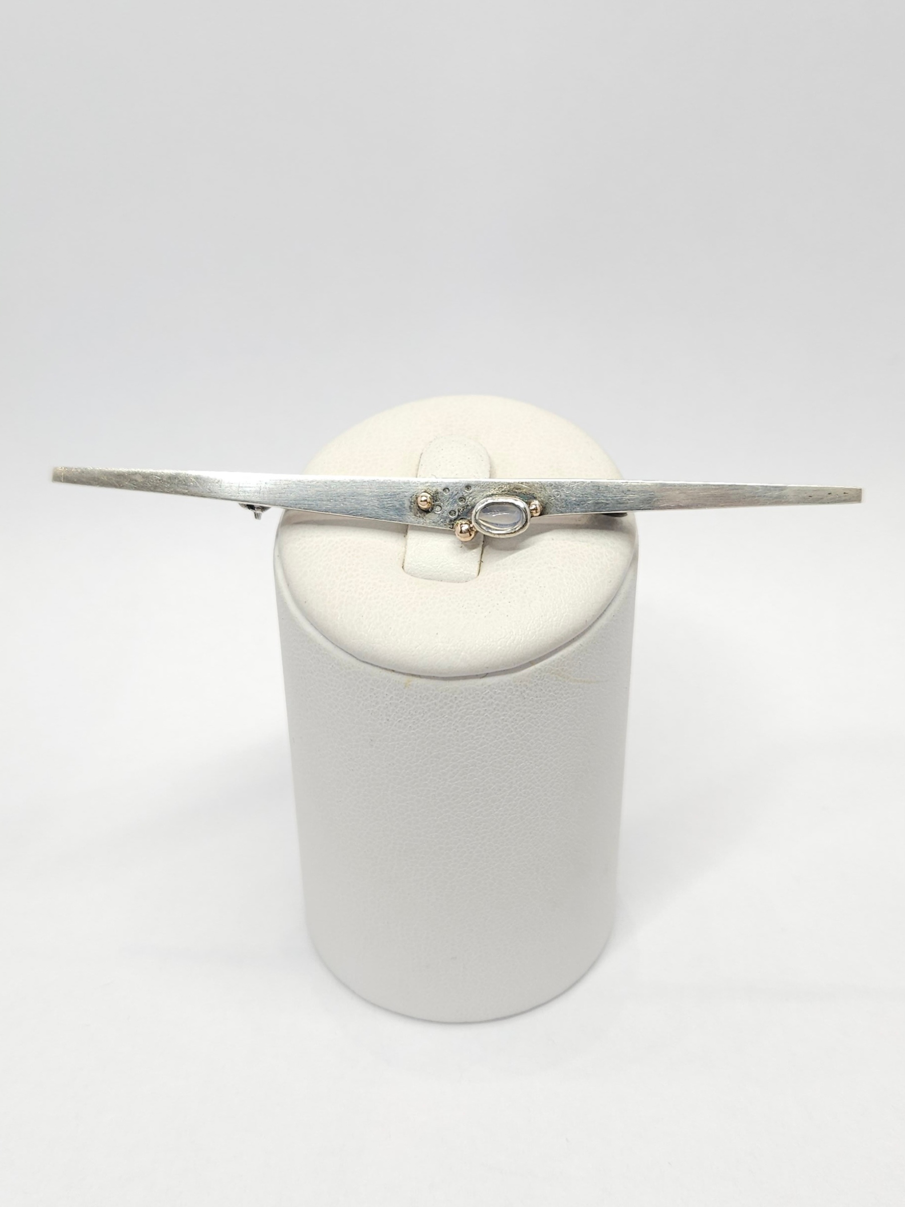 Podłużna, smukła broszka w geometrycznej formie, z kamieniem księżycowym w szlifie kaboszonowym oraz pozłacanymi kuleczkami