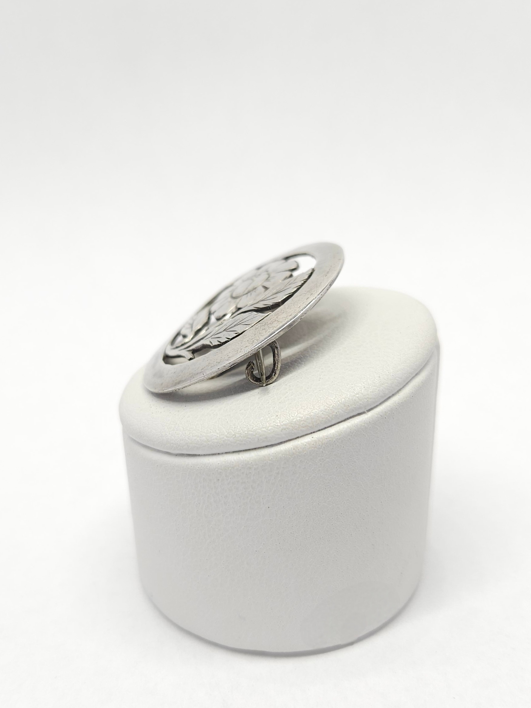 Okrągła, srebrna, ażurowa broszka z grawerowanym motywem kwiatowym