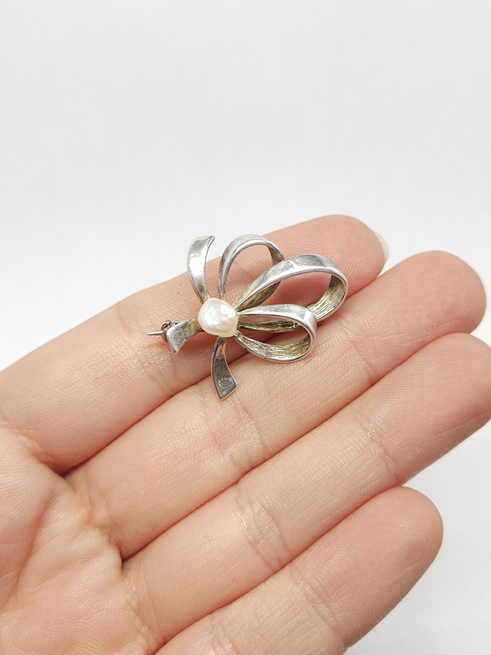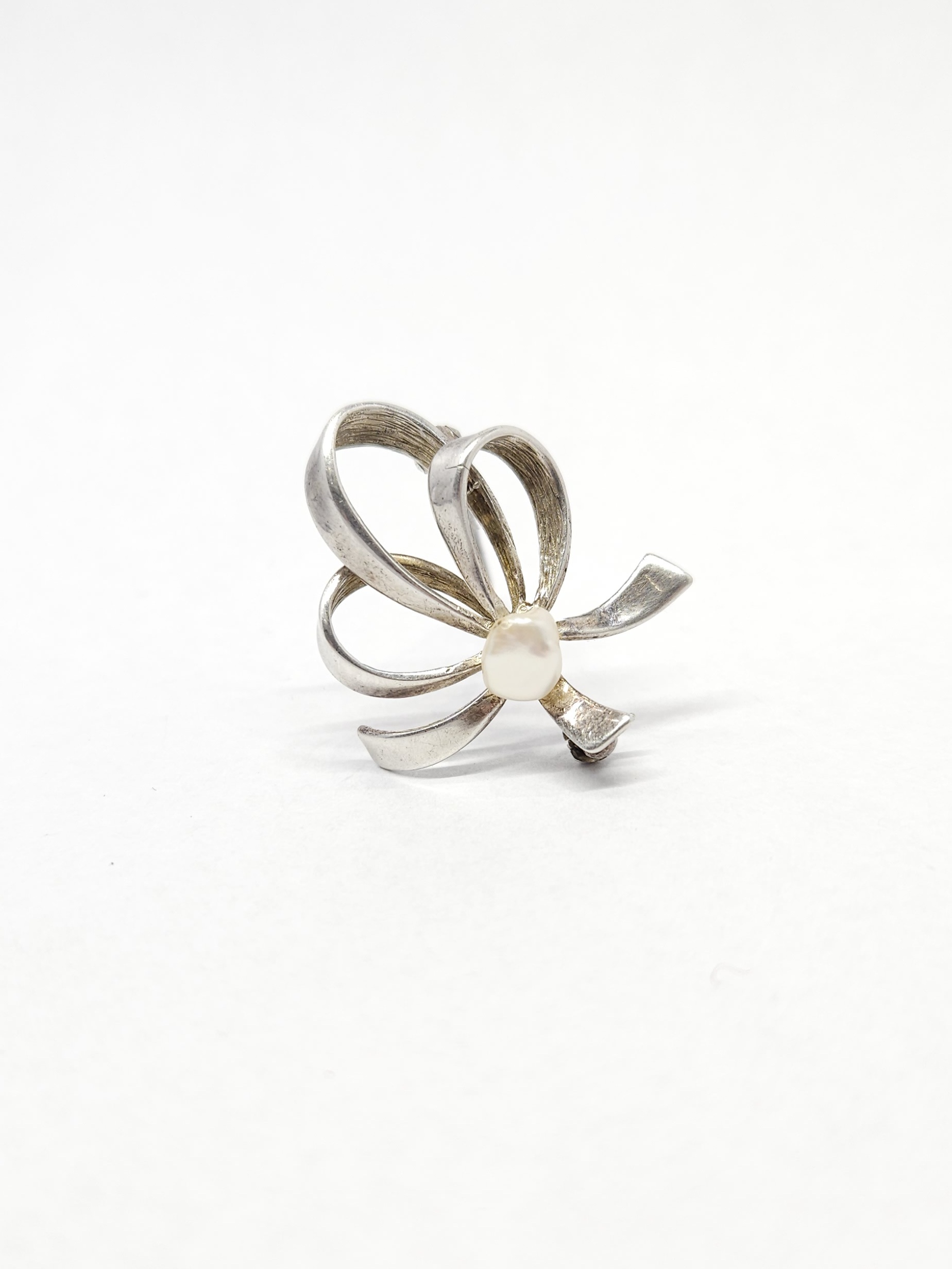 Srebrna broszka w formie kokardy, zdobiona pojedynczą perłą hodowaną