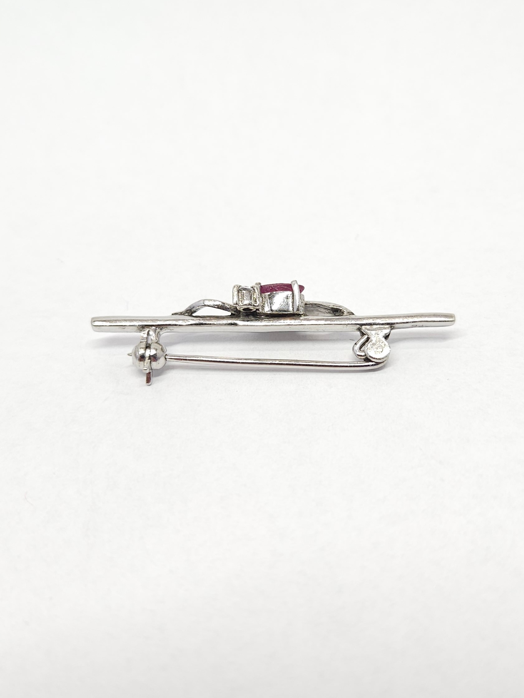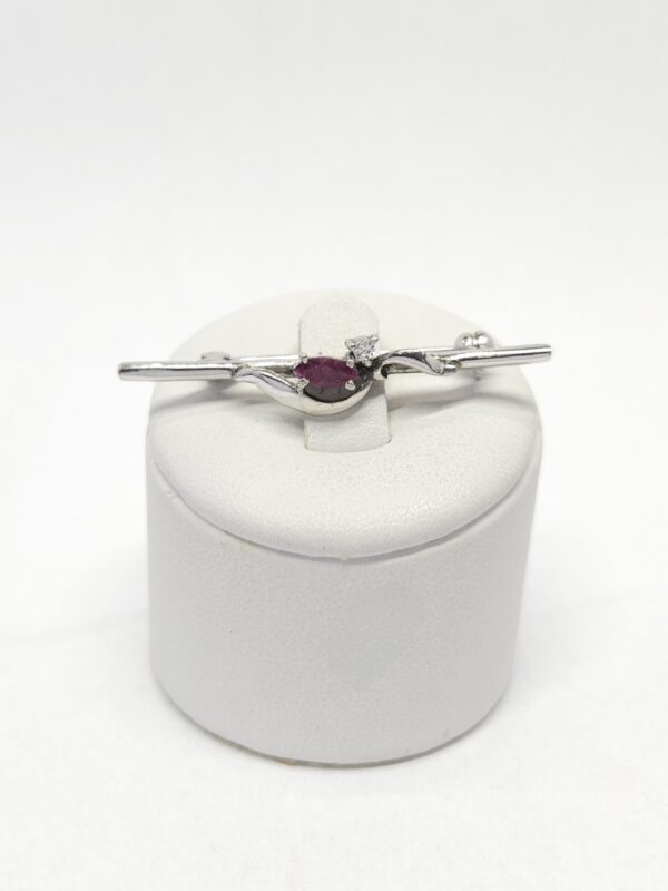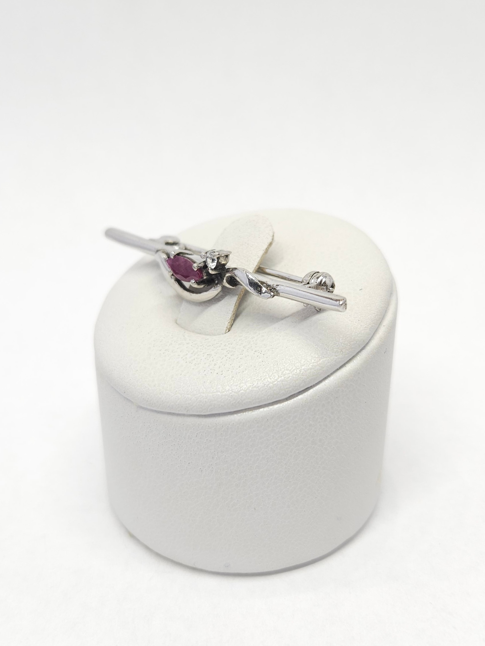 Srebrna, rodowana broszka, zdobiona pojedynczą cyrkonią i rubinem fasetowanym