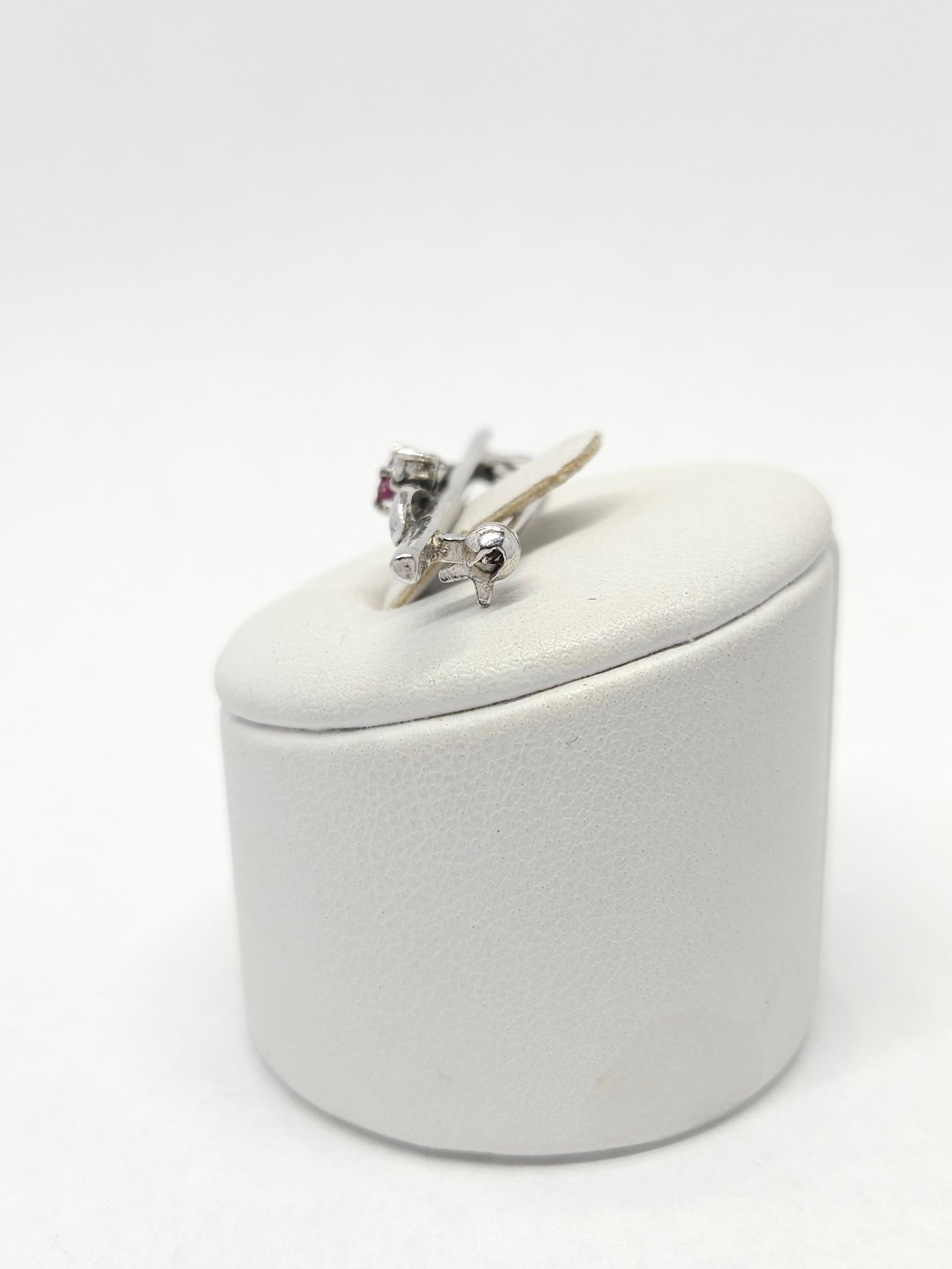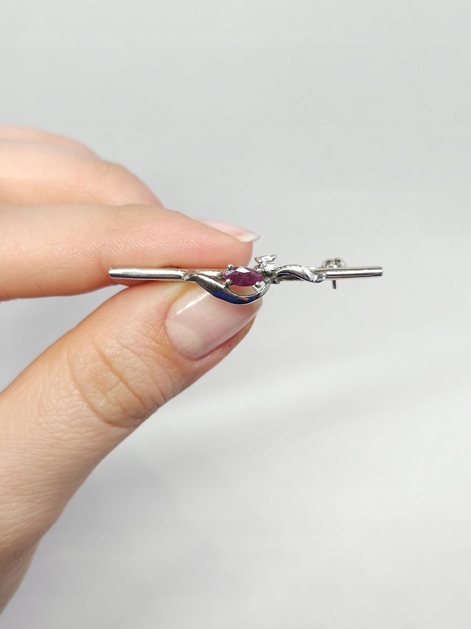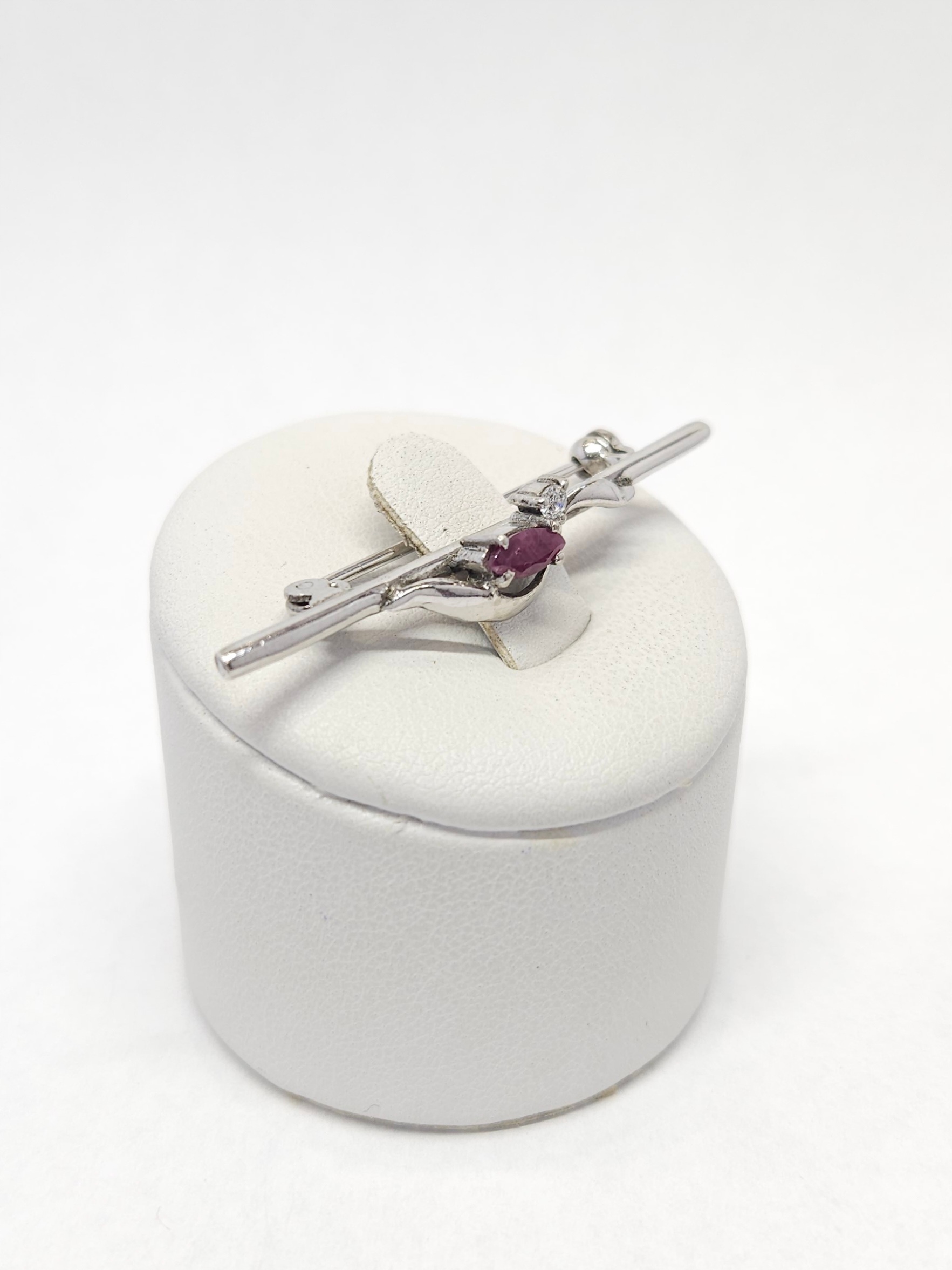 Srebrna, rodowana broszka, zdobiona pojedynczą cyrkonią i rubinem fasetowanym