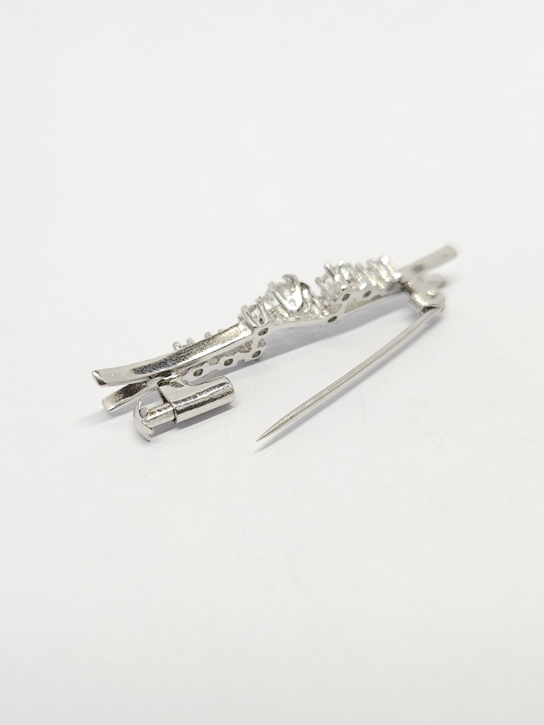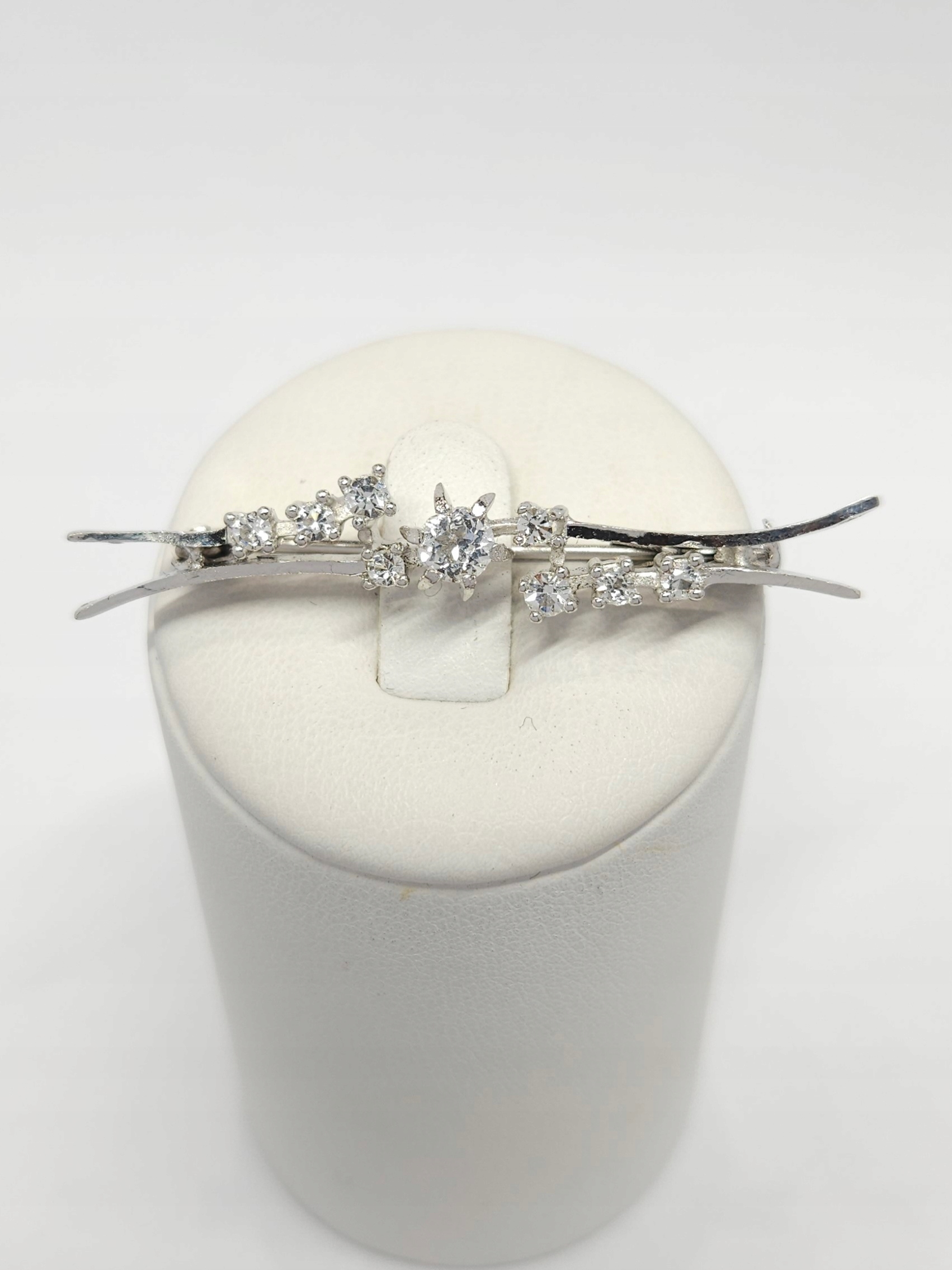 Srebrna, rodowana broszka, wysadzana strasami- kamieniami z fasetowanego szkła, mocno się błyszczy 🙂