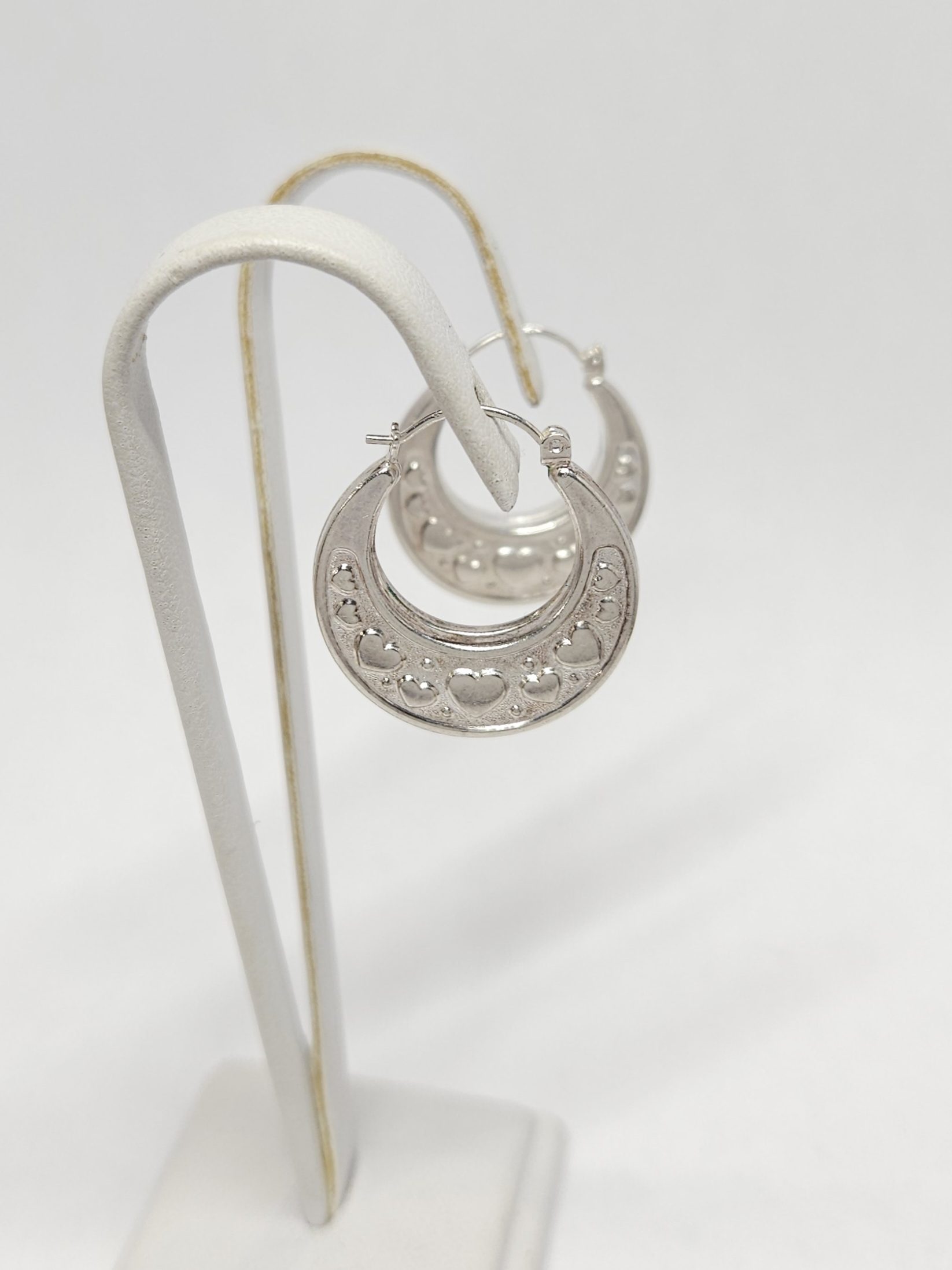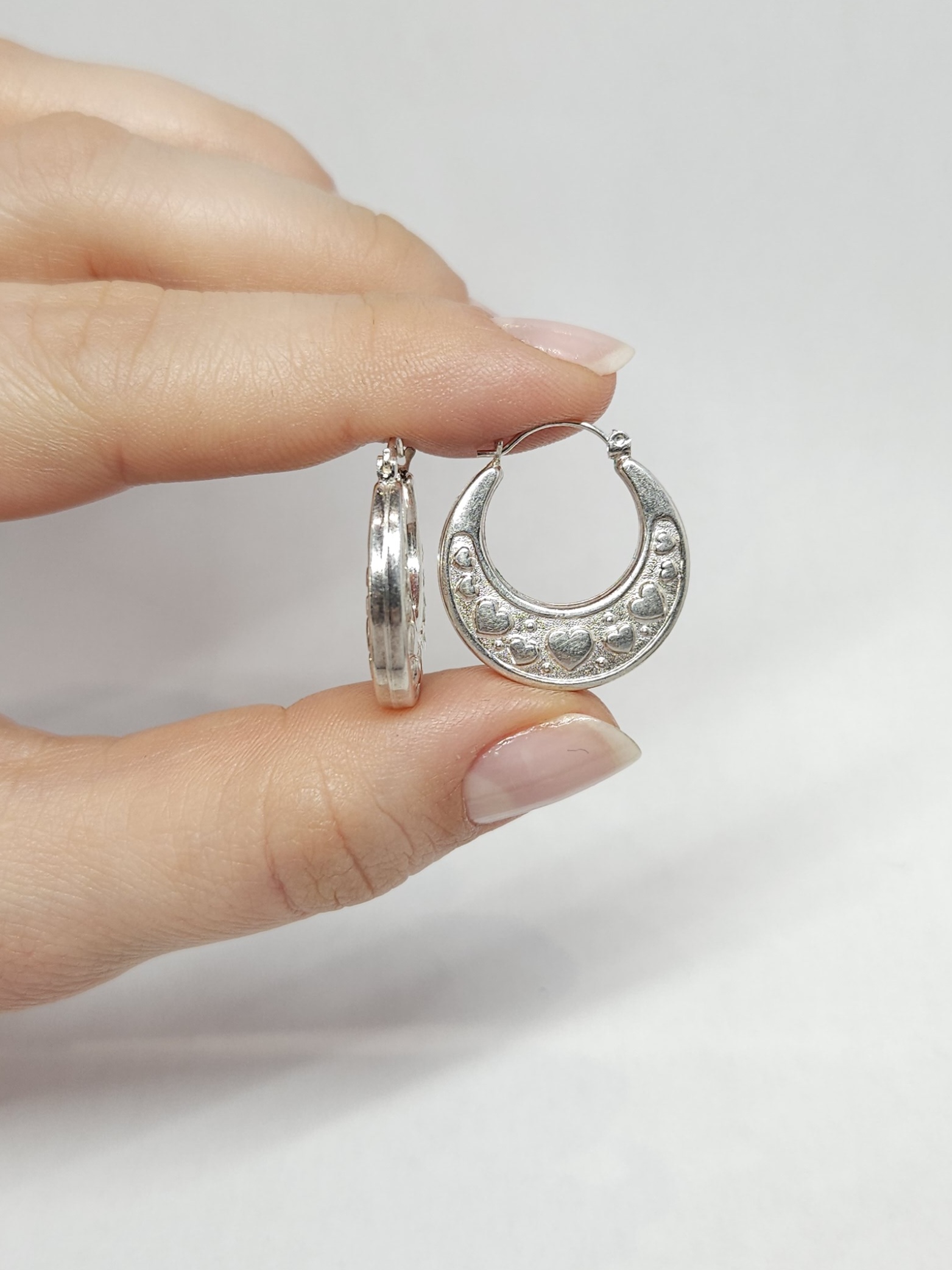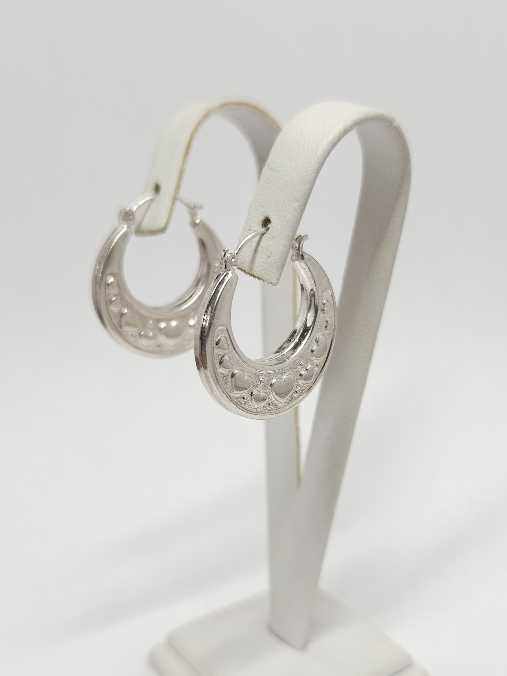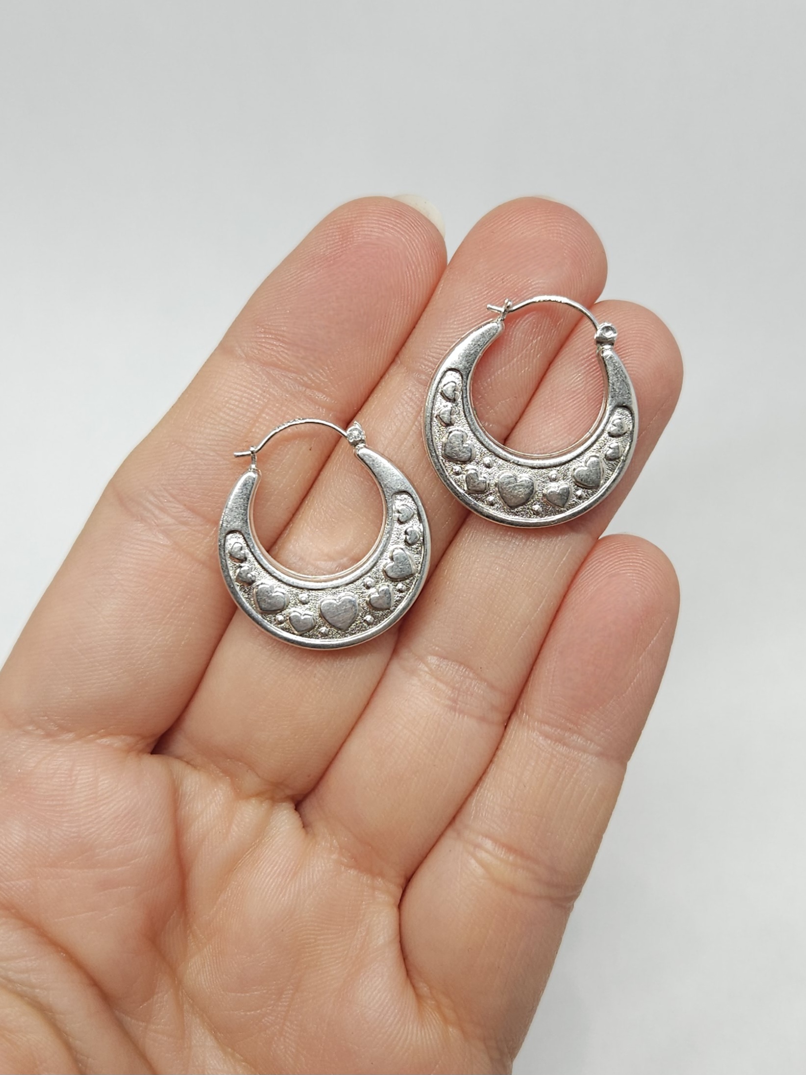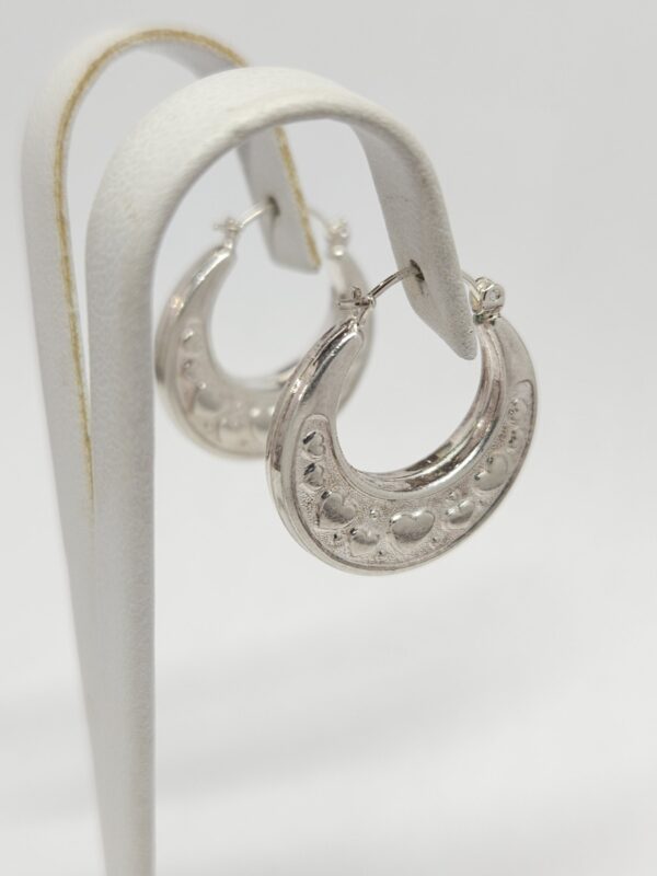 Srebrne, wiszące kolczyki – kółka, dwustronnie zdobione wytłoczonym motywem serc