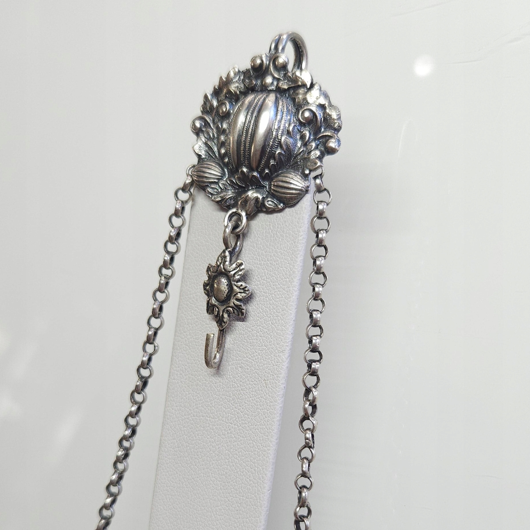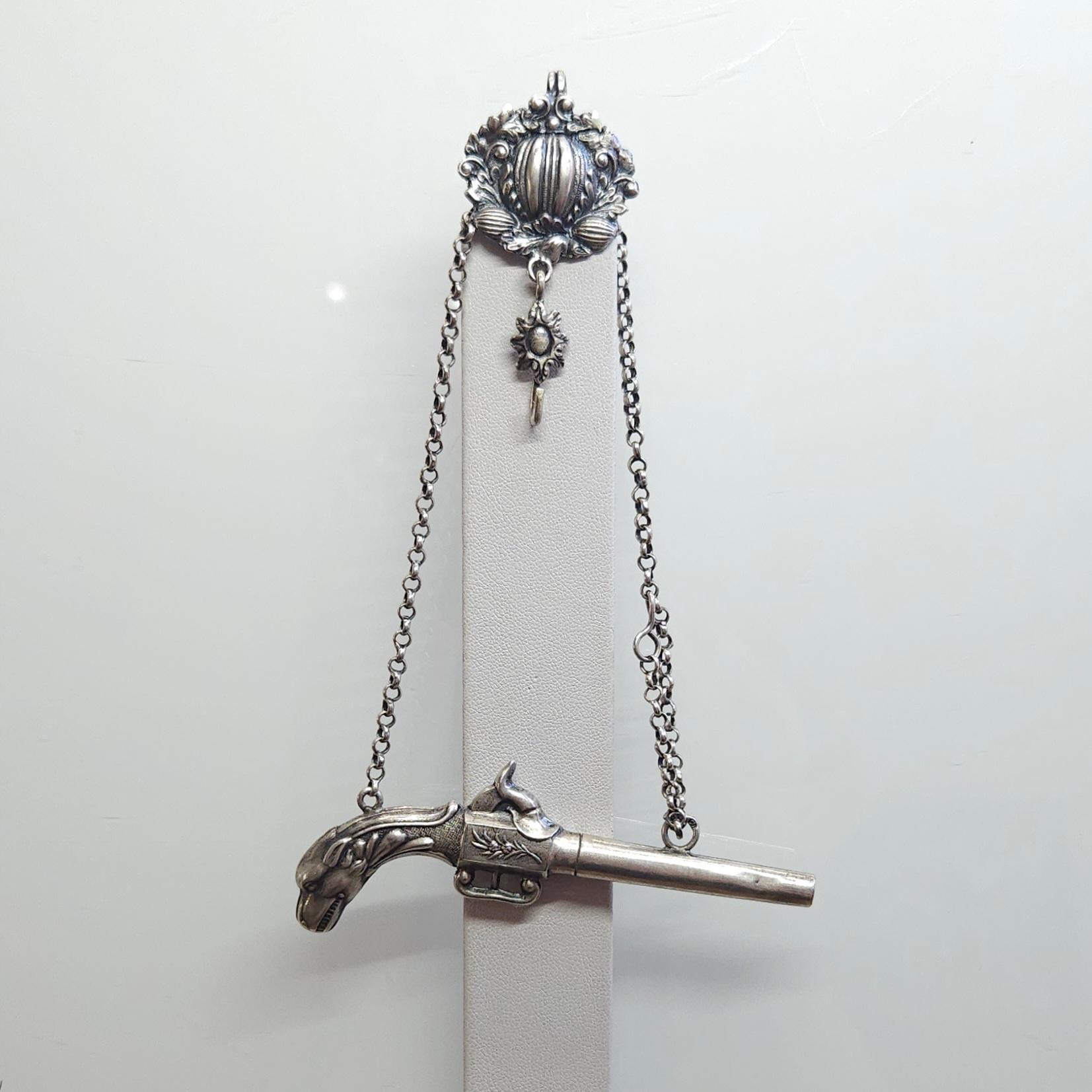 Ozdobny chetelaine – z łańcuszkami do zahaczenia o pasek, z dolnym elementem ozdobnym w formie pistoletu skałkowego