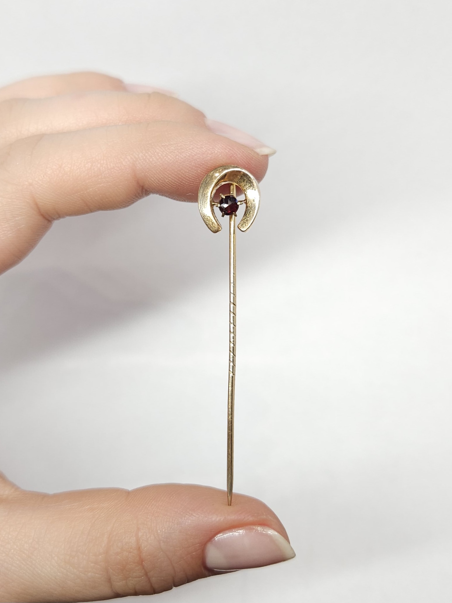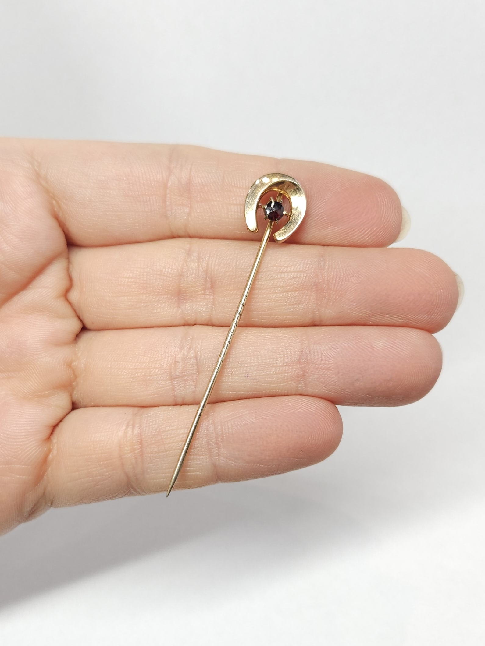 Szpilka z pocz. XXw., z elementem ozdobnym w kształcie podkowy, dekorowana pojedynczym granatem