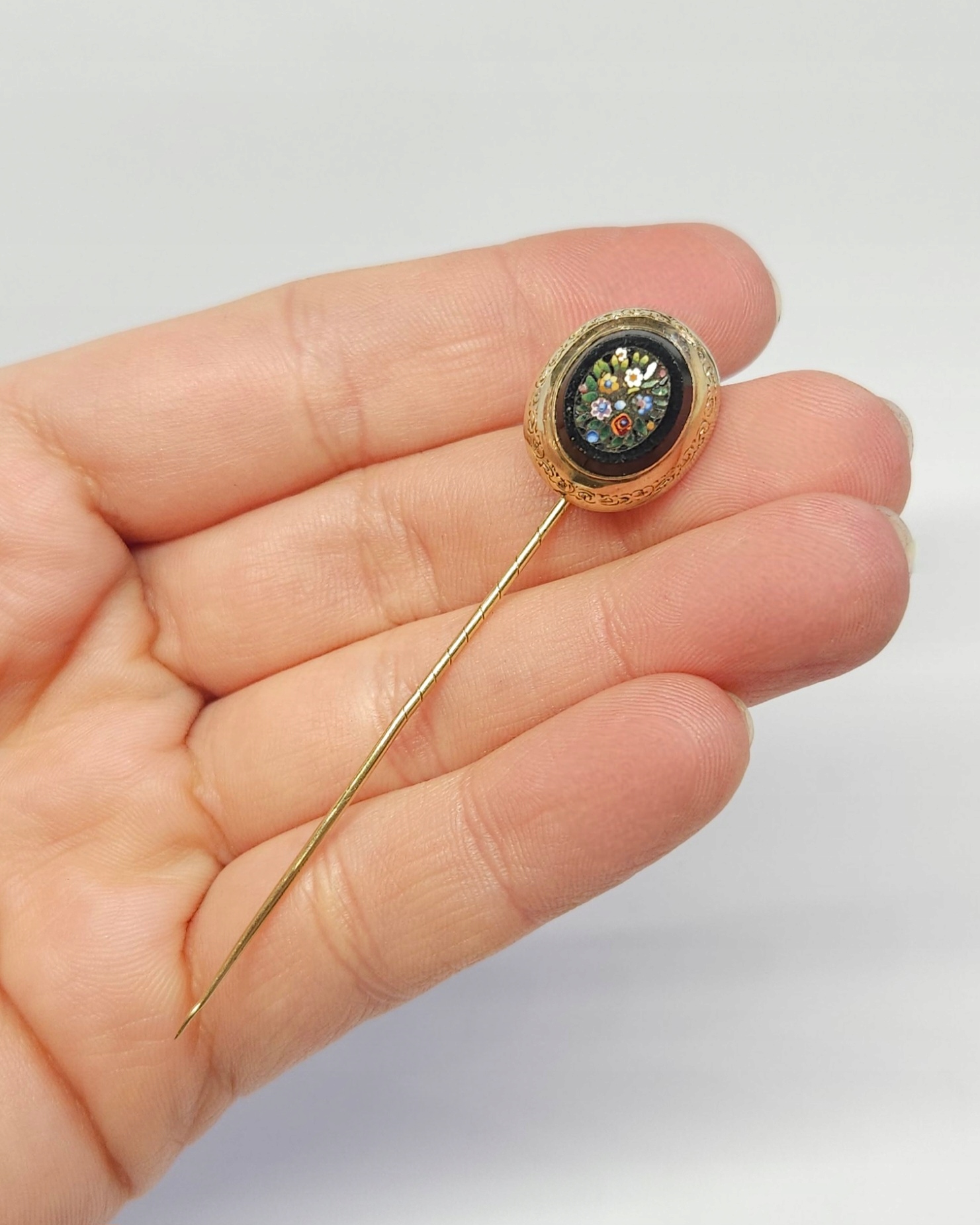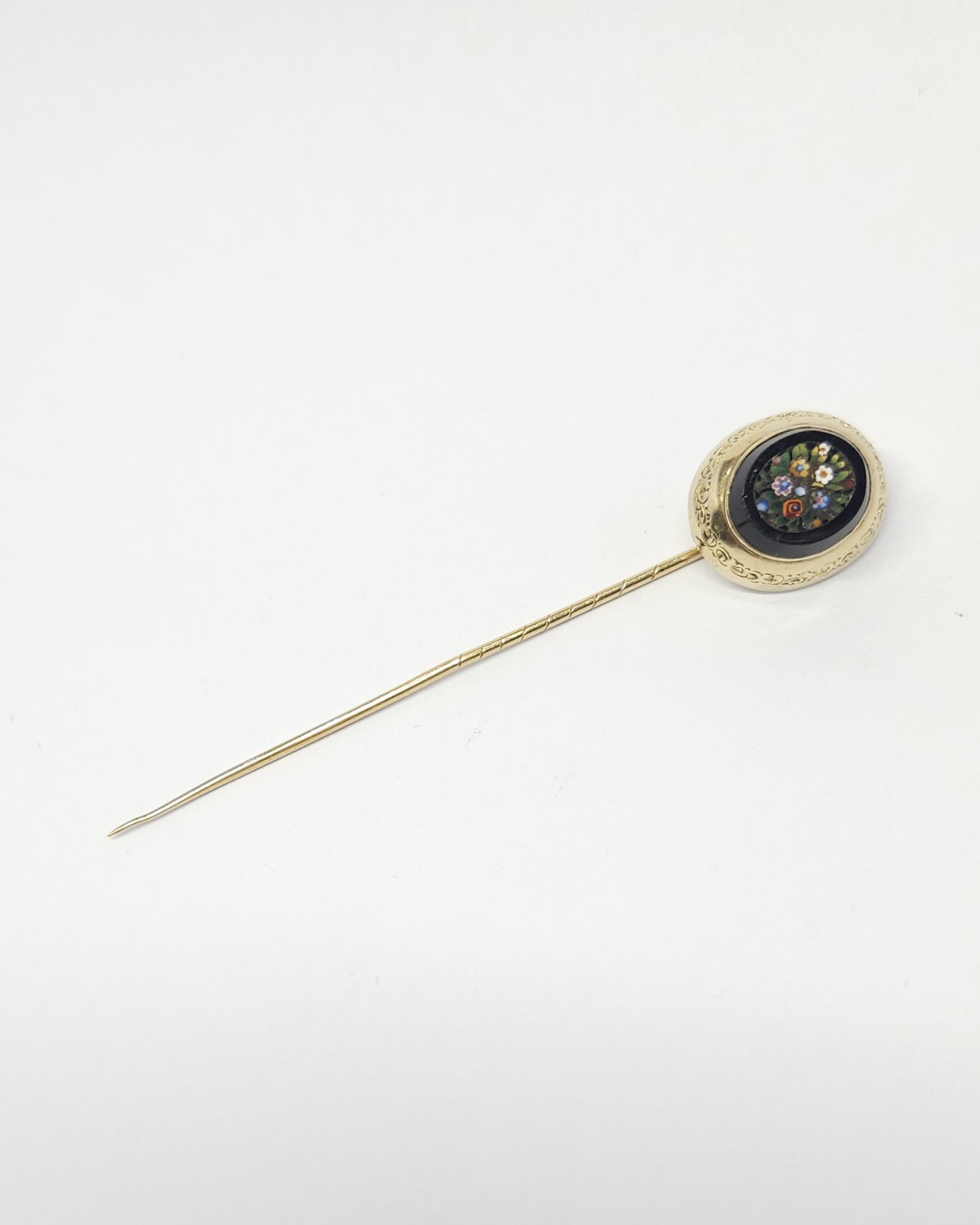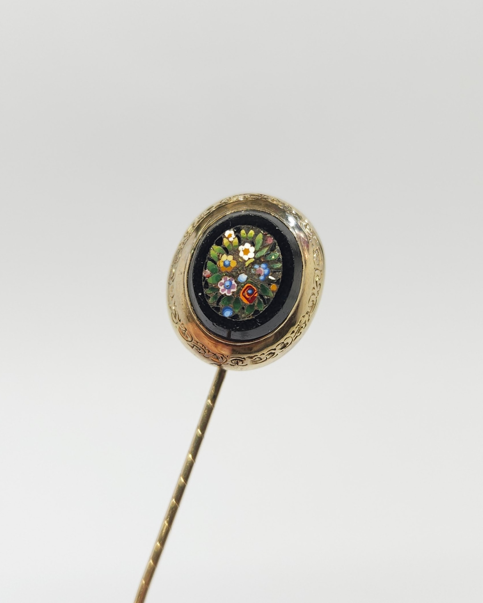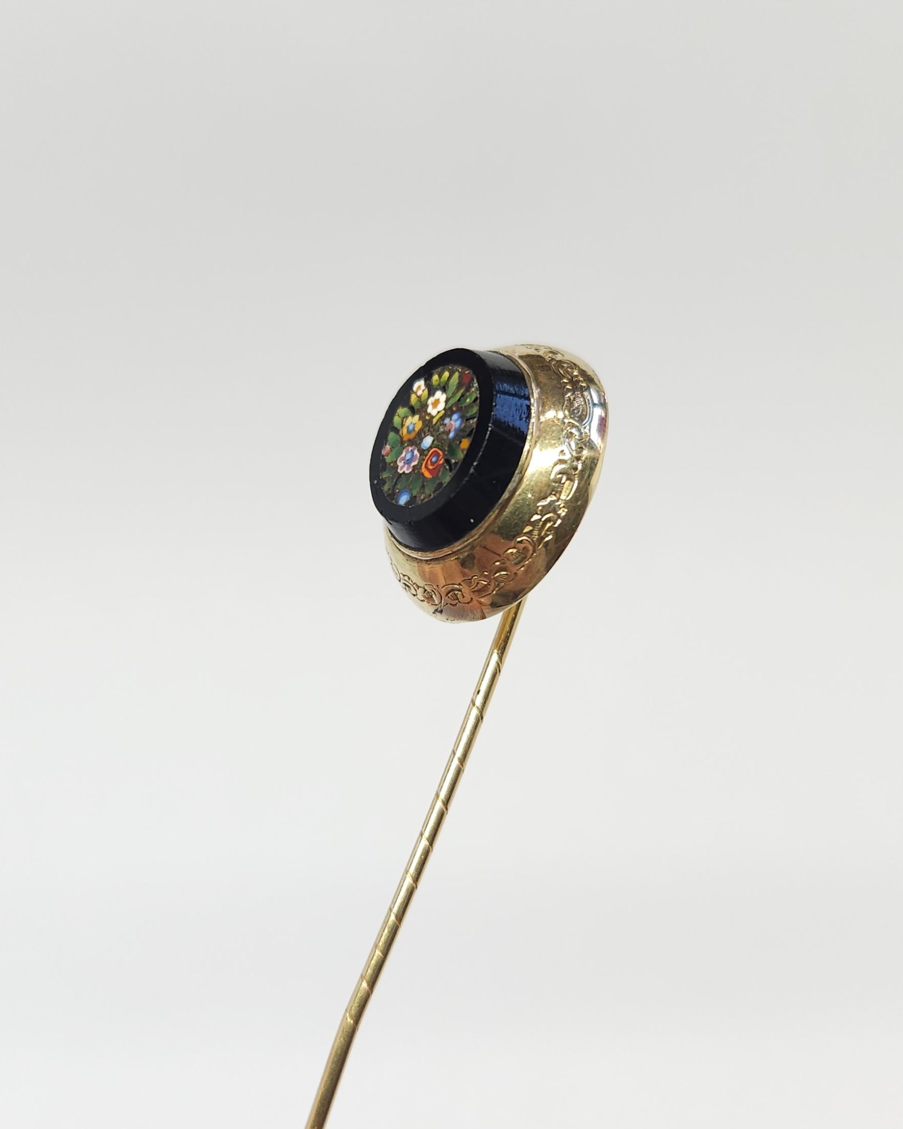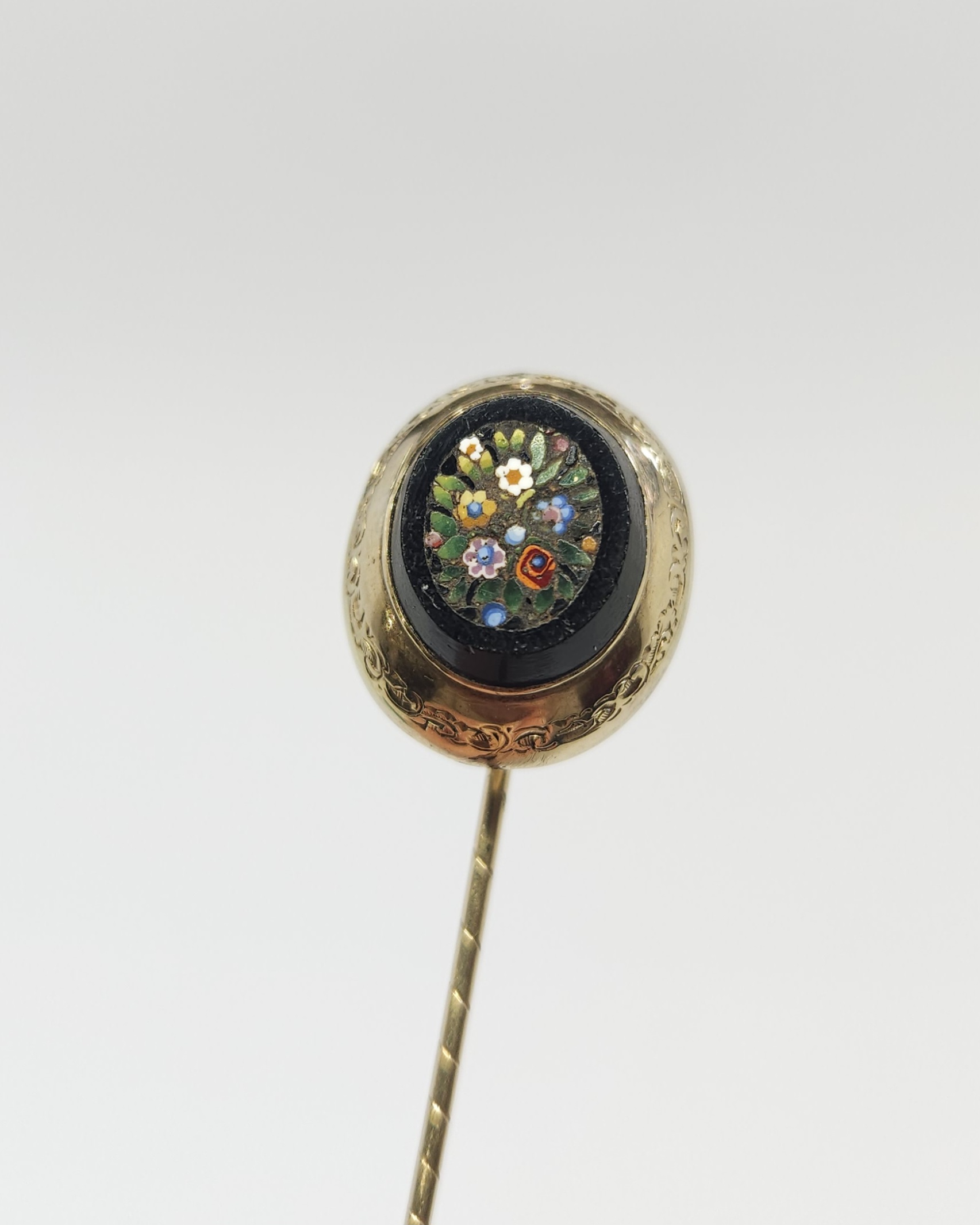 Pozłacana szpilka do krawata, żakietu… klapy marynarki… Włochy, XIXw., wykonana z mosiądzu złoconego, z elementem ozdobnym zdobionym kwiatową mikromozaiką na onyksie oraz delikatnym, grawerowanym ornamentem