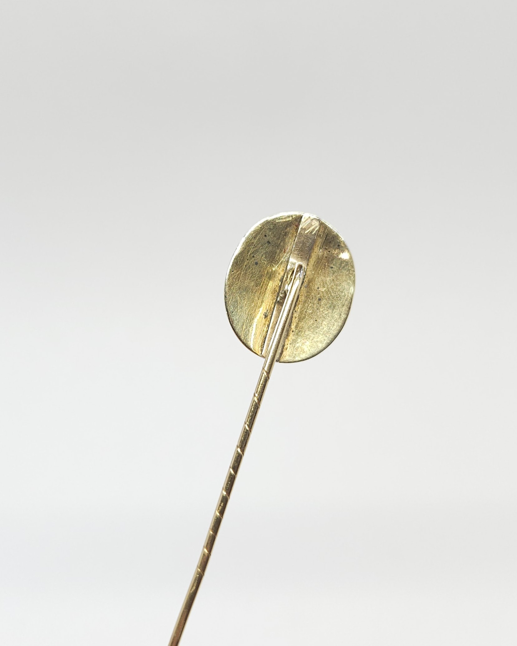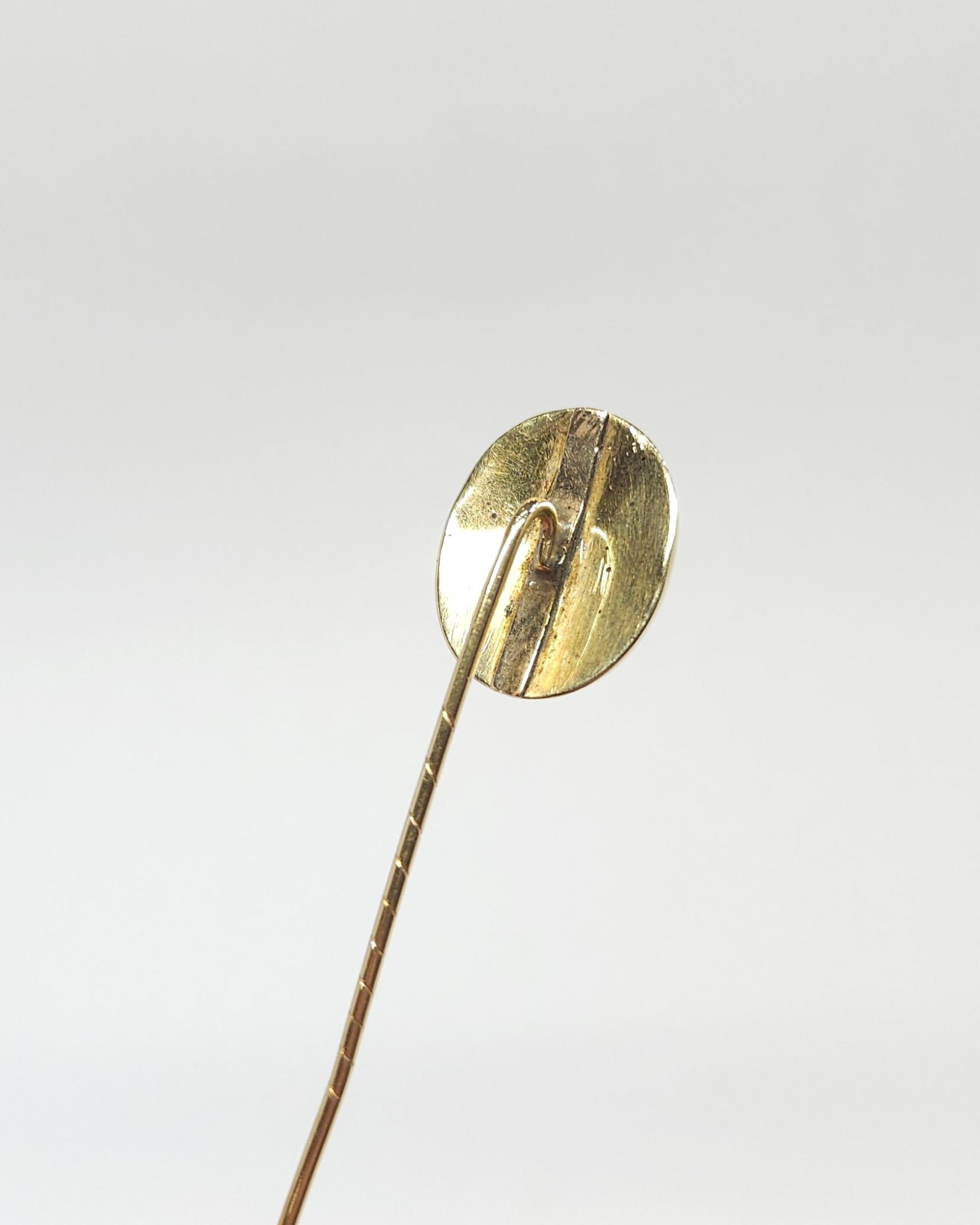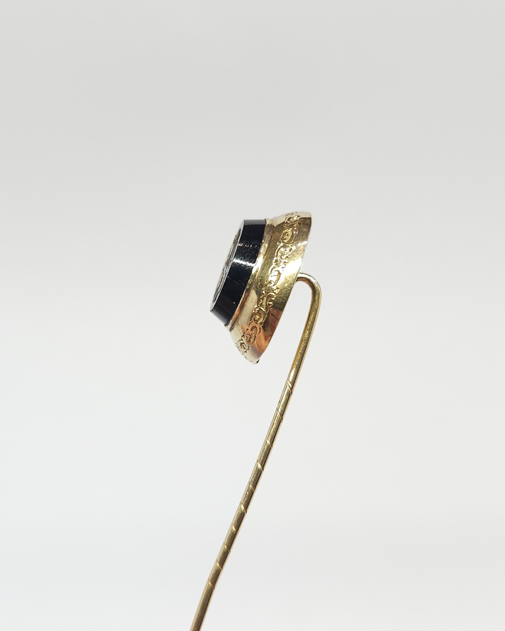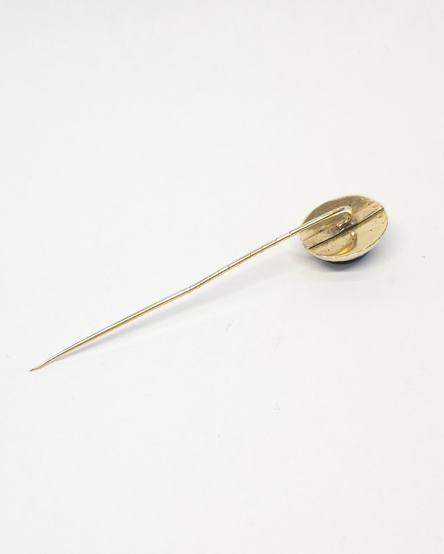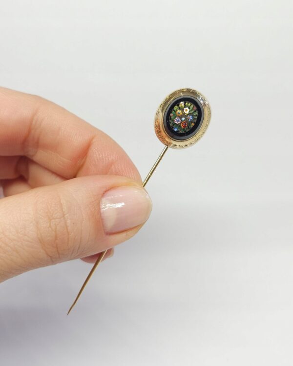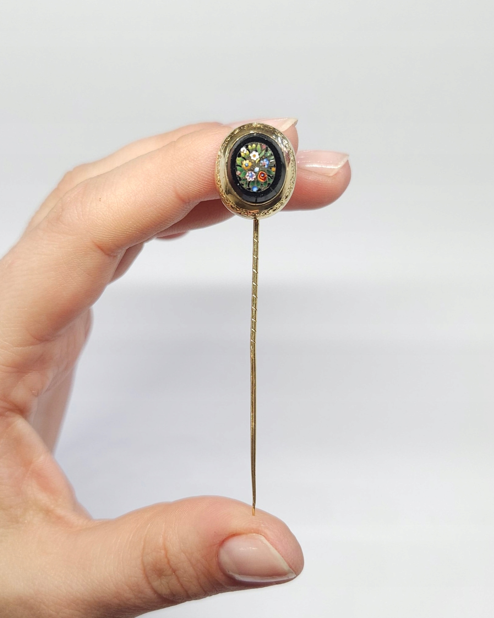 Pozłacana szpilka do krawata, żakietu… klapy marynarki… Włochy, XIXw., wykonana z mosiądzu złoconego, z elementem ozdobnym zdobionym kwiatową mikromozaiką na onyksie oraz delikatnym, grawerowanym ornamentem
