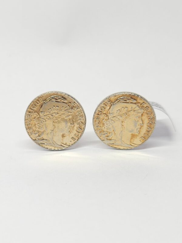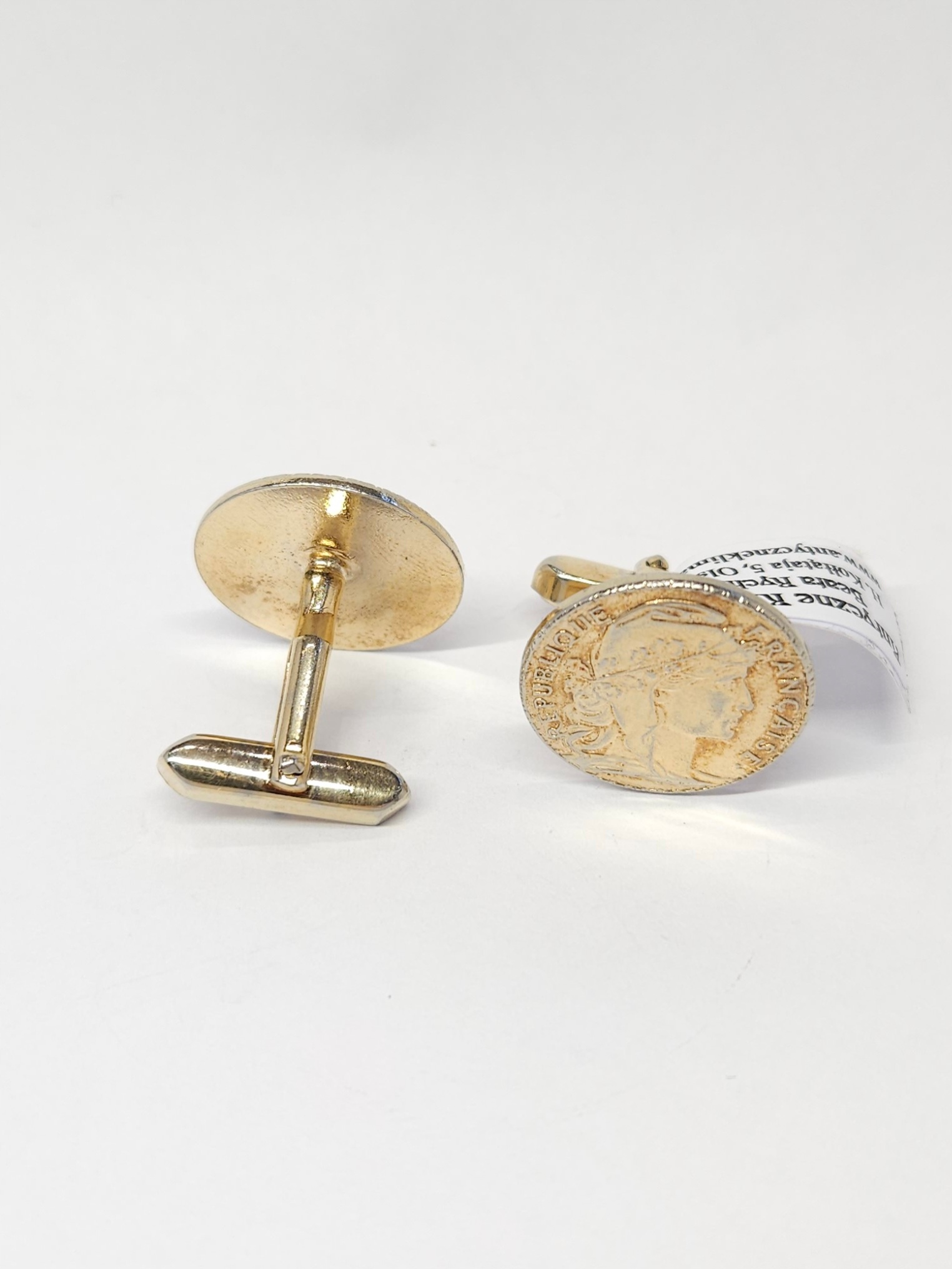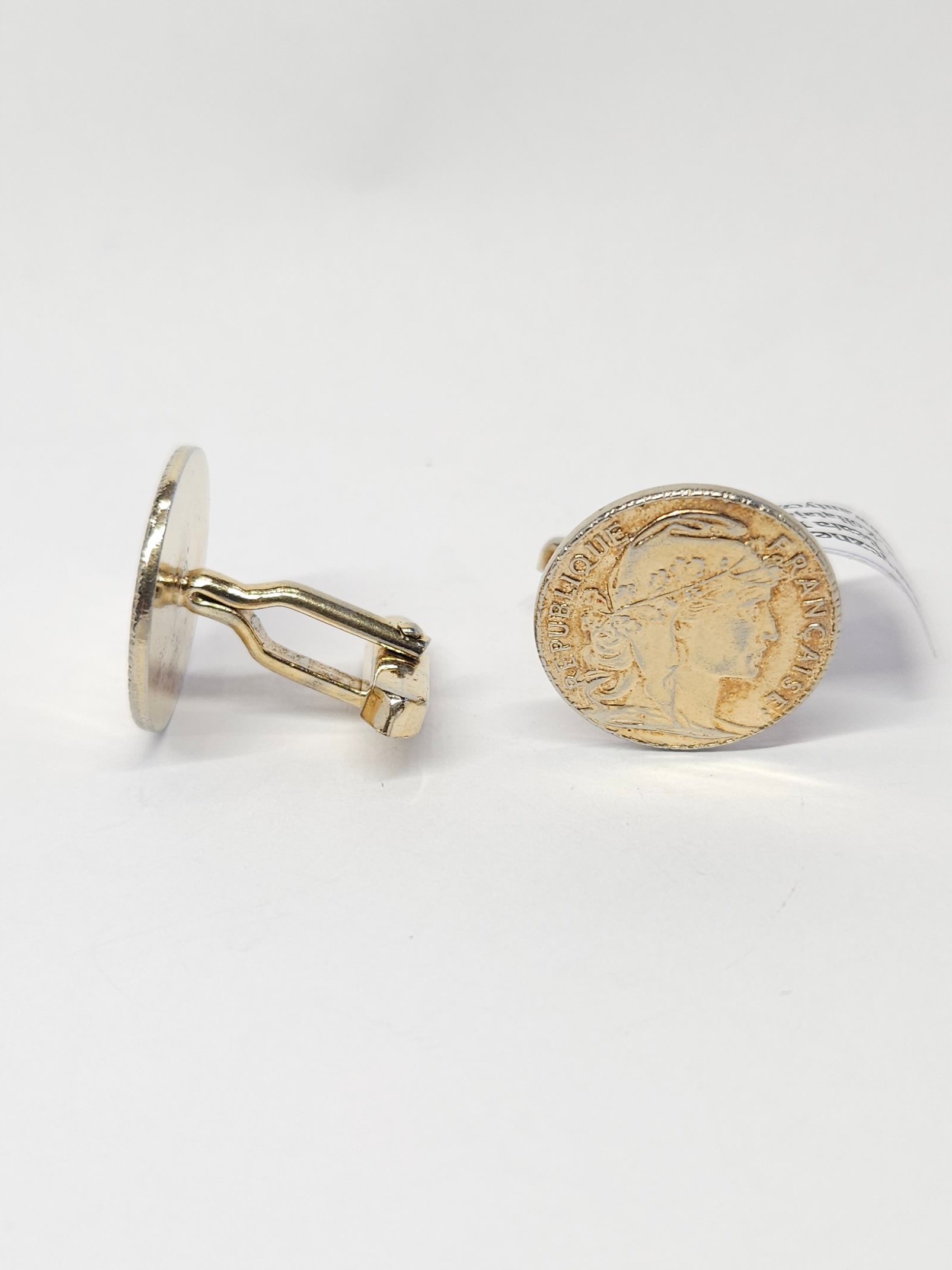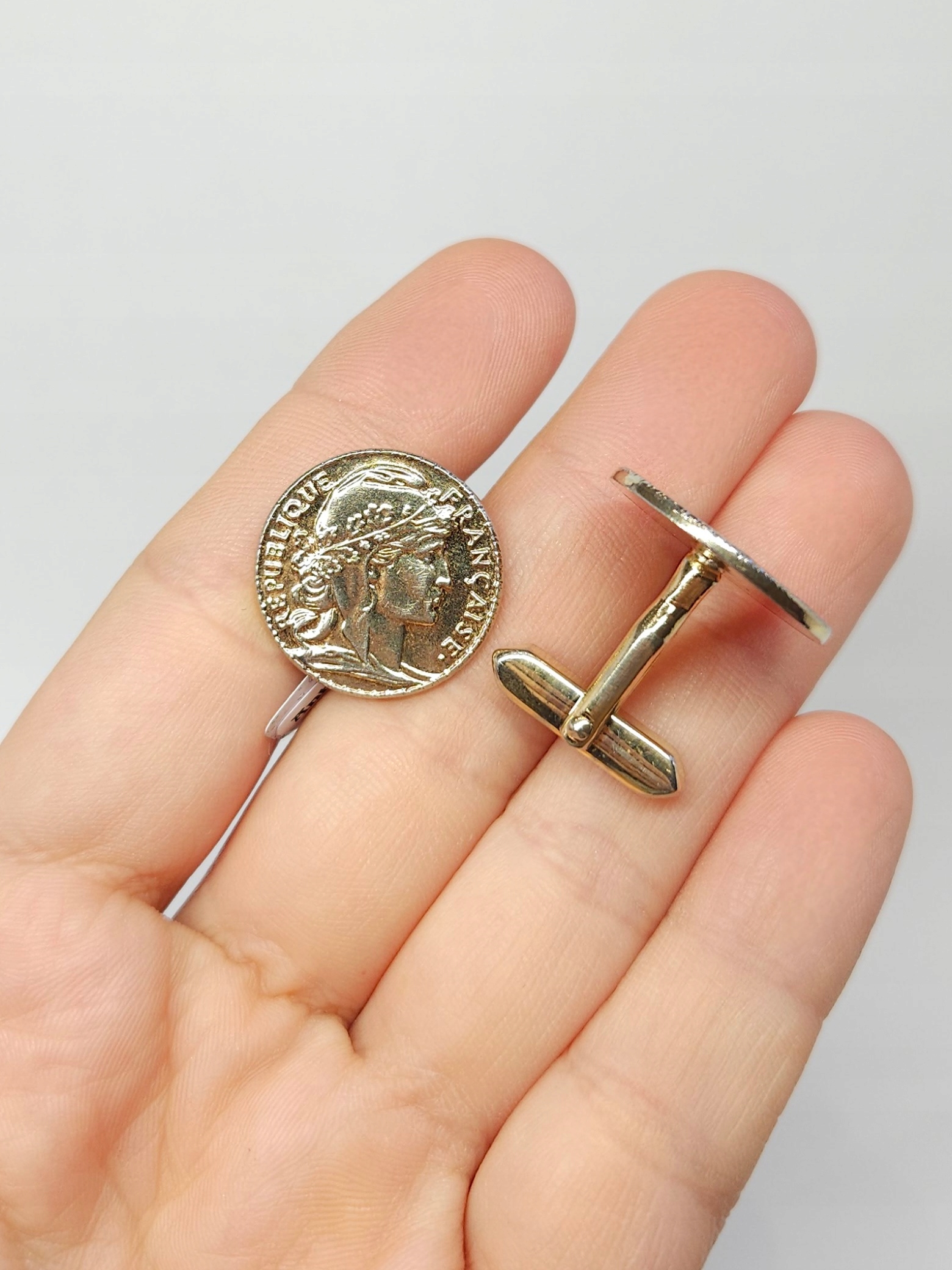 Spinki do mankietów, wykonane z metalu złoconego, zdobione imitacją francuskich monet