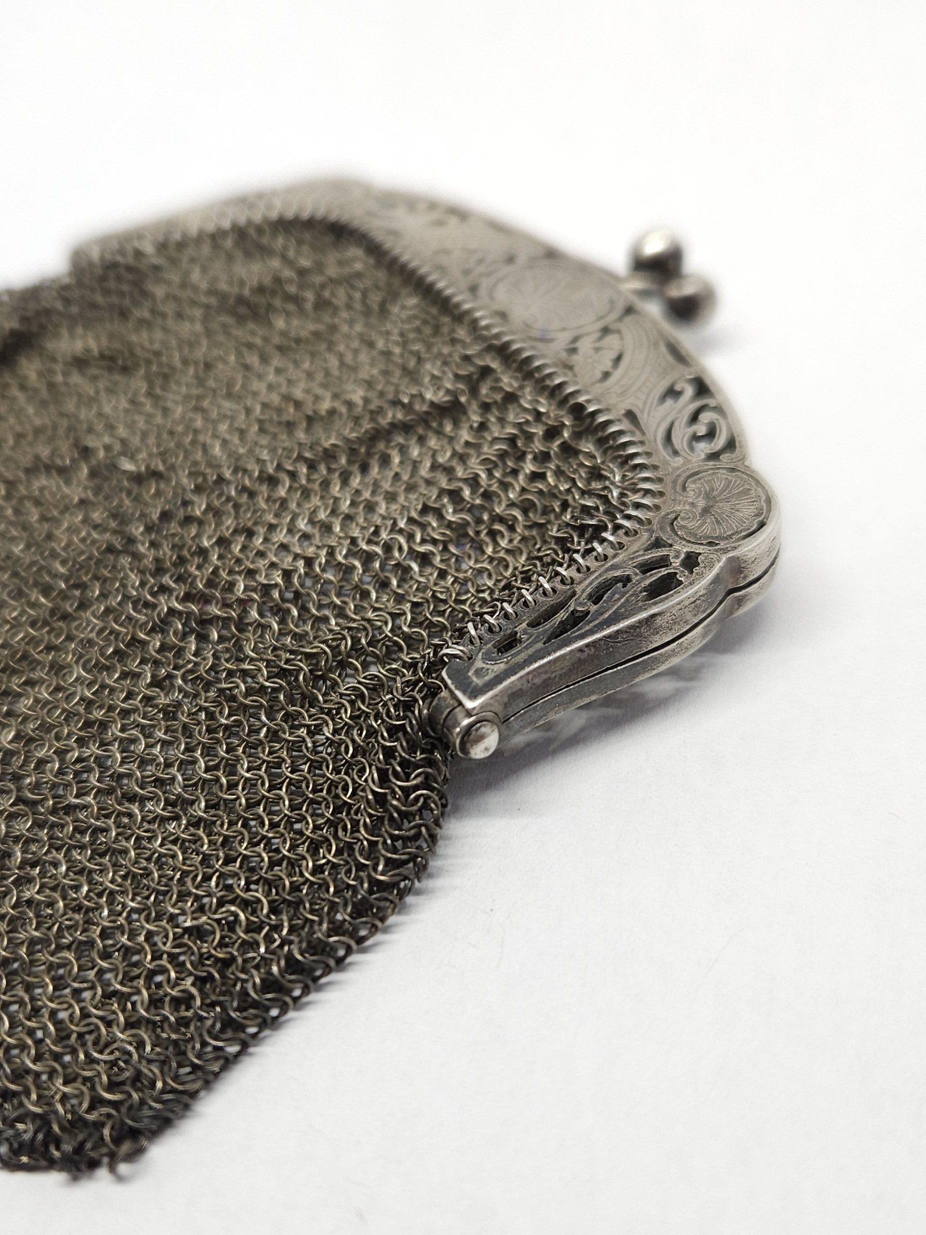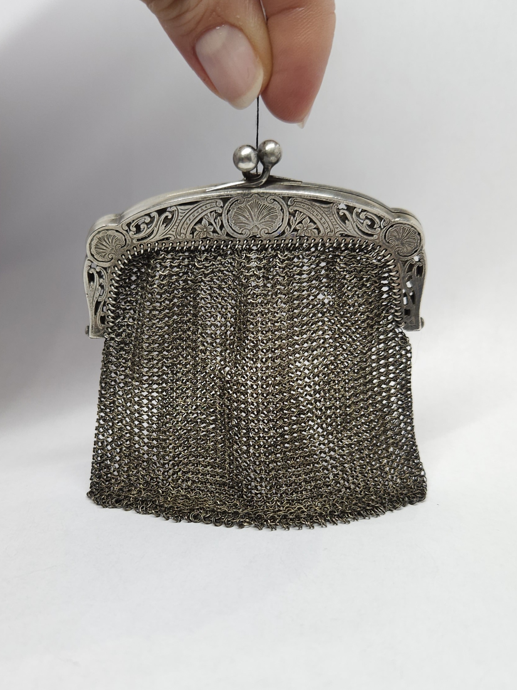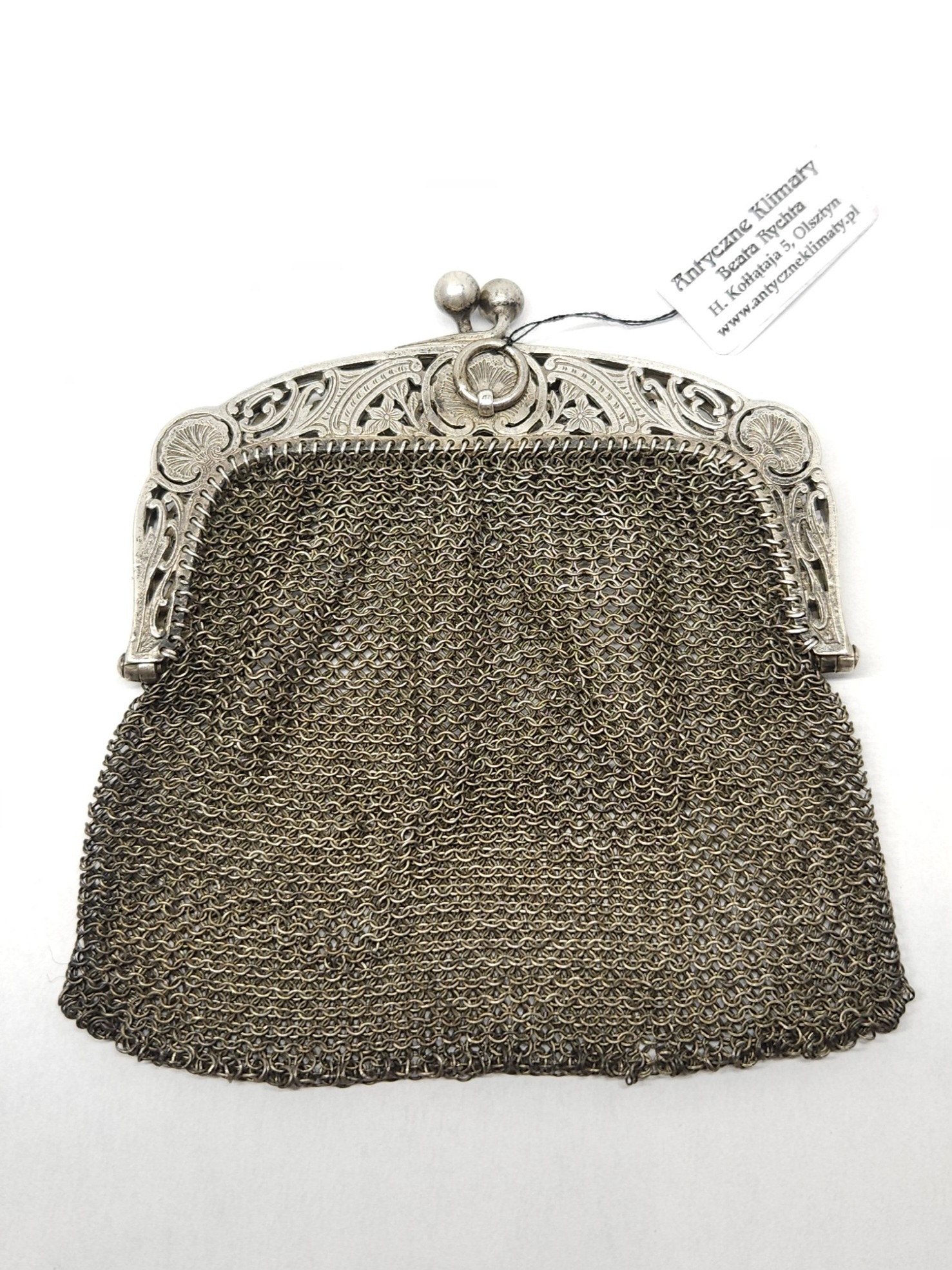 Srebrna torebeczka – portfelik, element tzw. chatelaine, w górnej części zdobiony ażurowym ornamentem dekoracyjnym, z ogniwkiem do zawieszenia i mocnym zamknięciem na zatrzask; z racji wieku widoczne drobne ubytki w ogniwkach