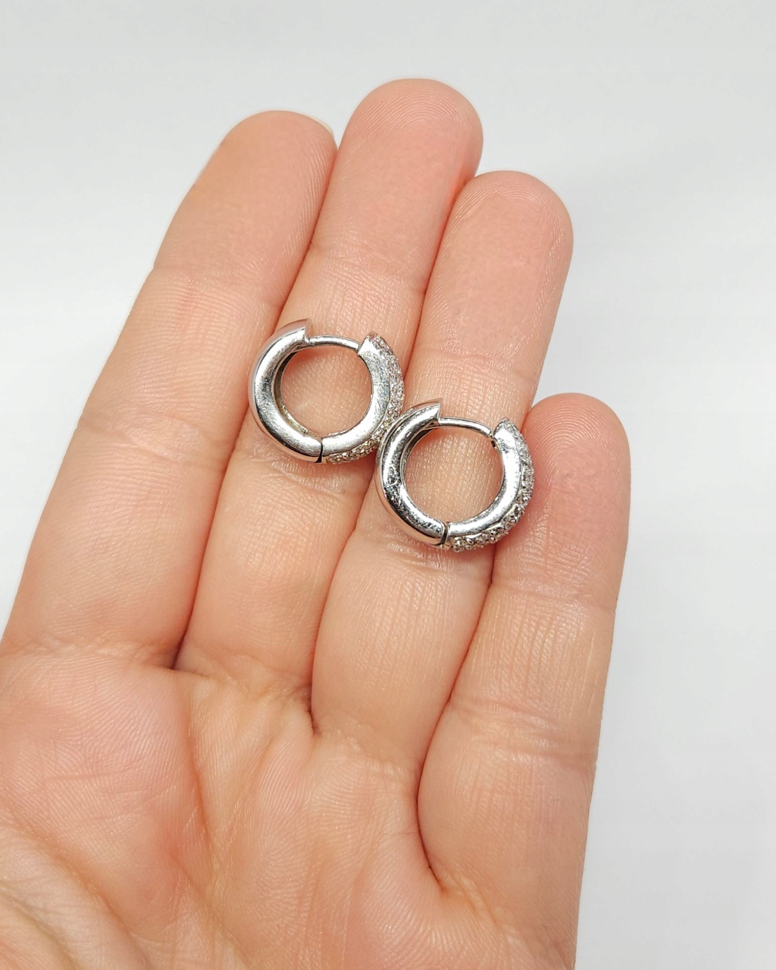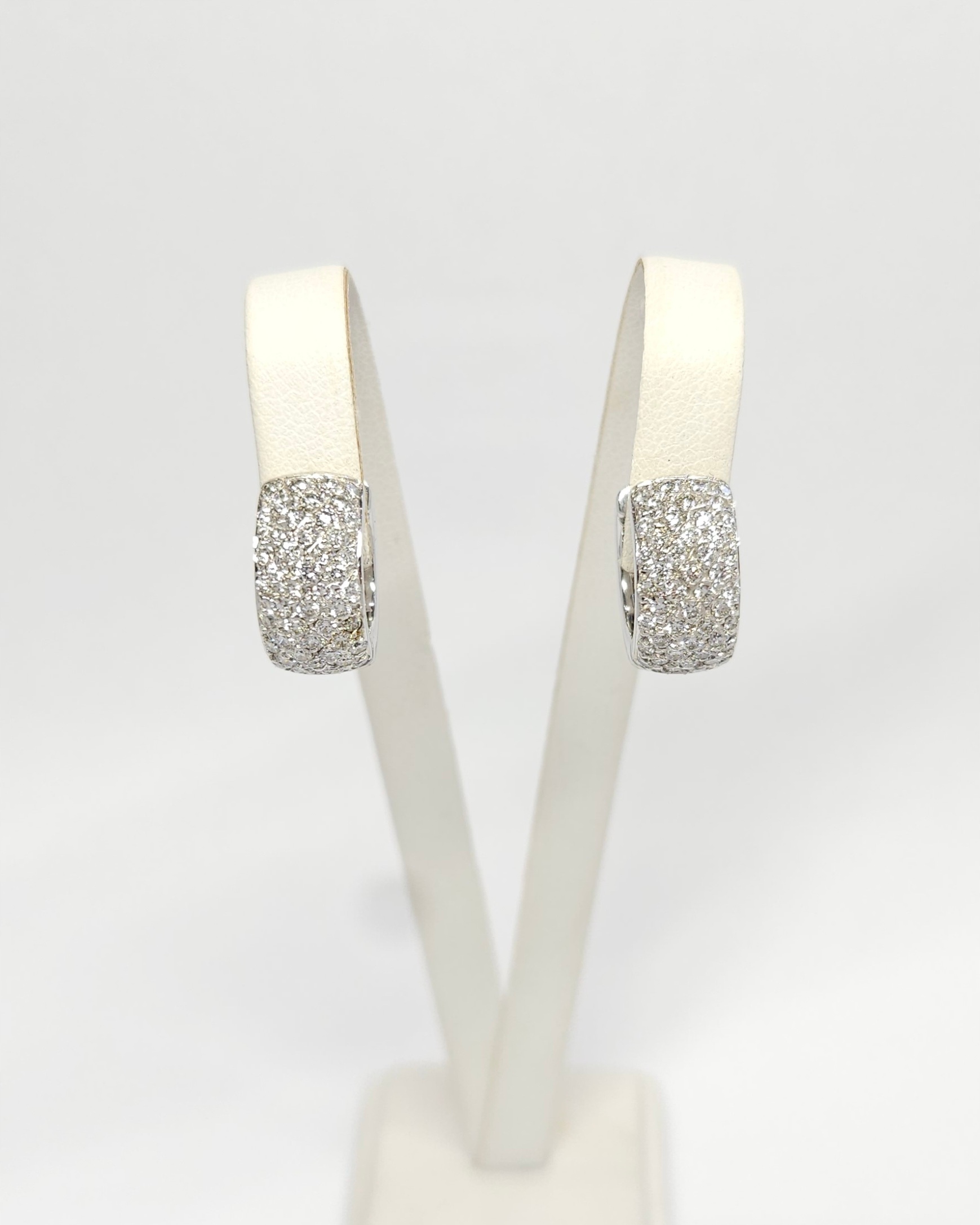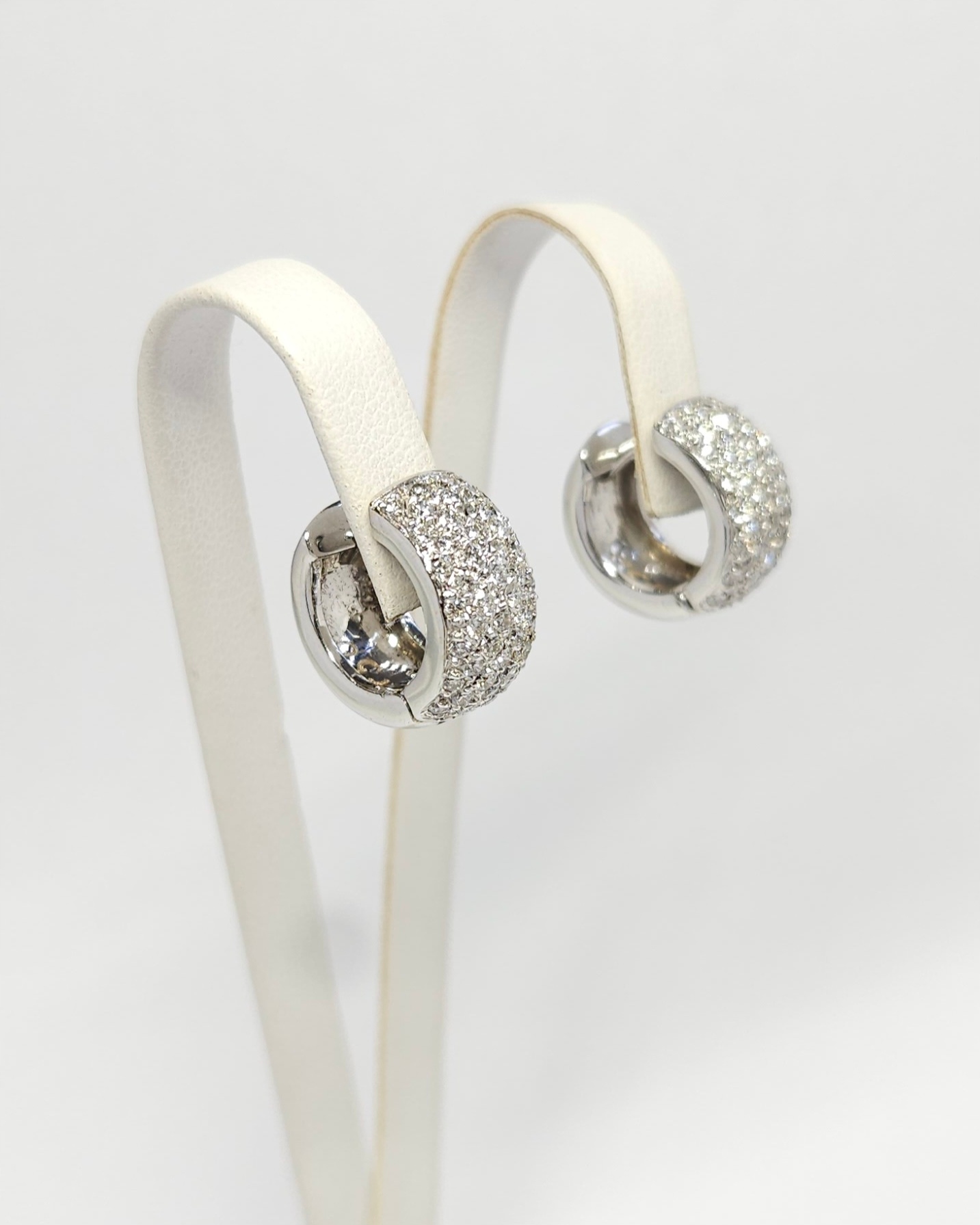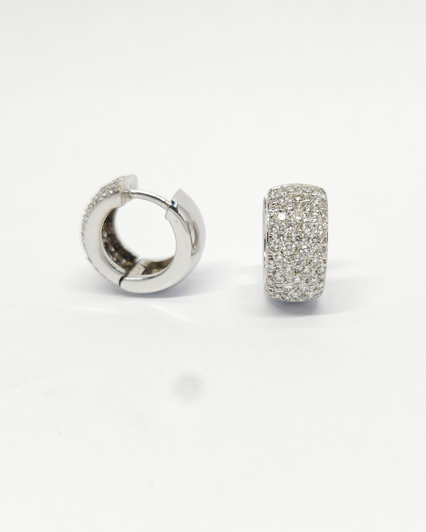 Kolczyki – kółka, koła – wykonane z białego złota, zapinane na zatrzask, w przedniej części wysadzane diamentami w szlifie brylantowym: 92szt. o łącznej masie ~1,30ct
