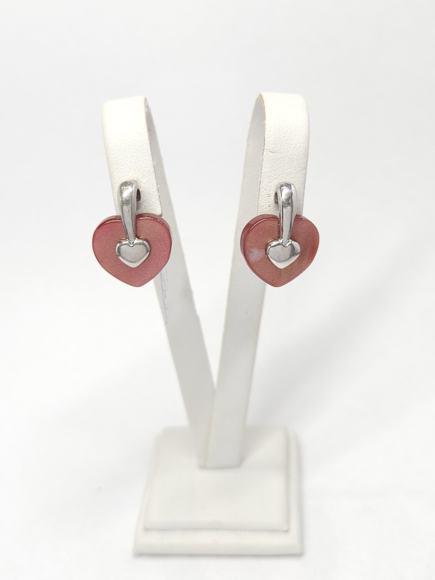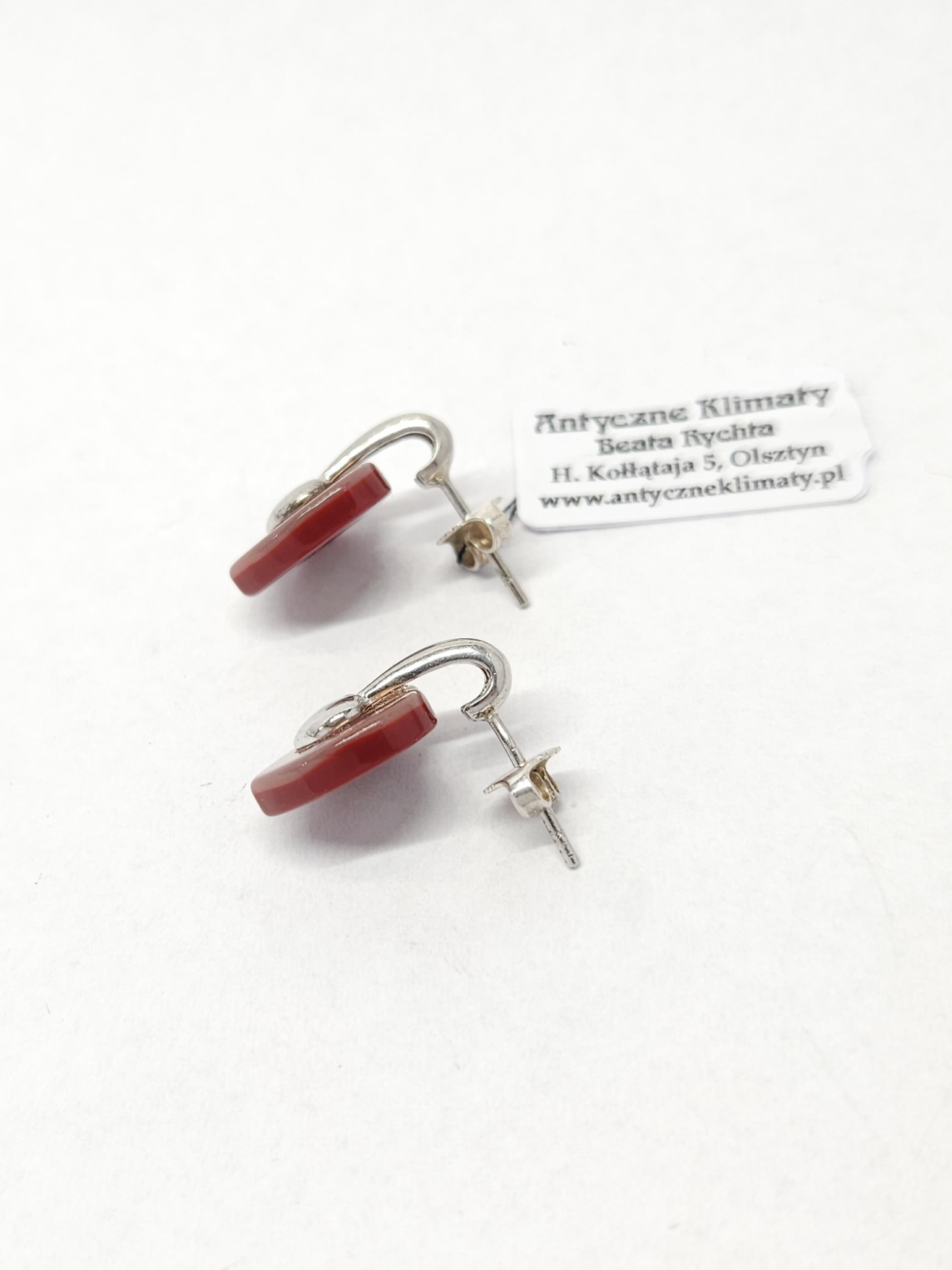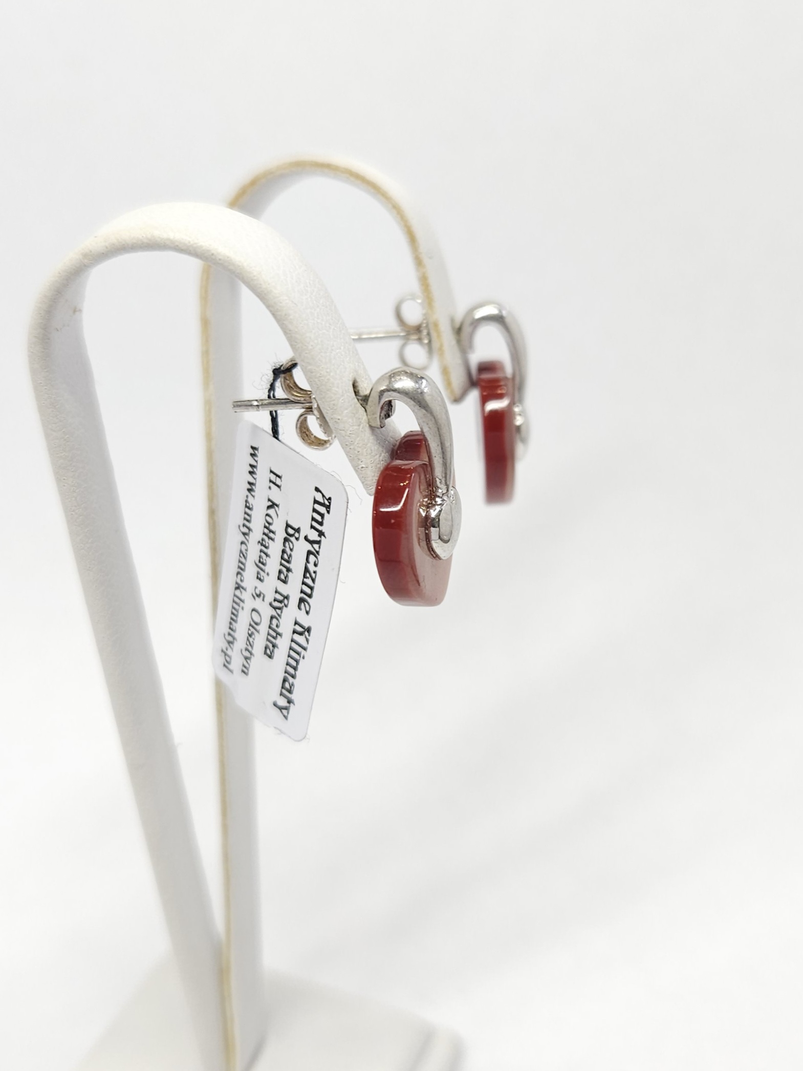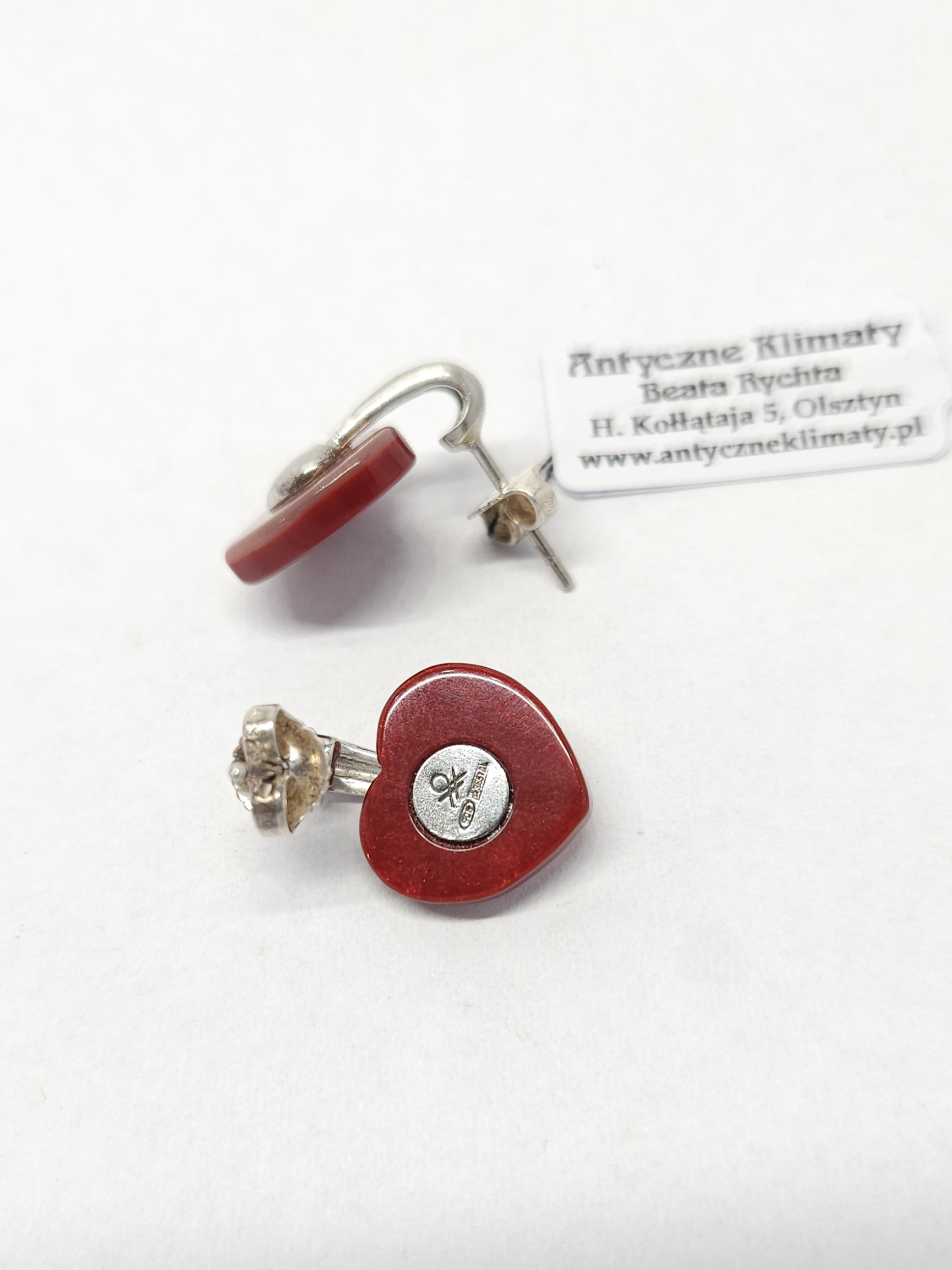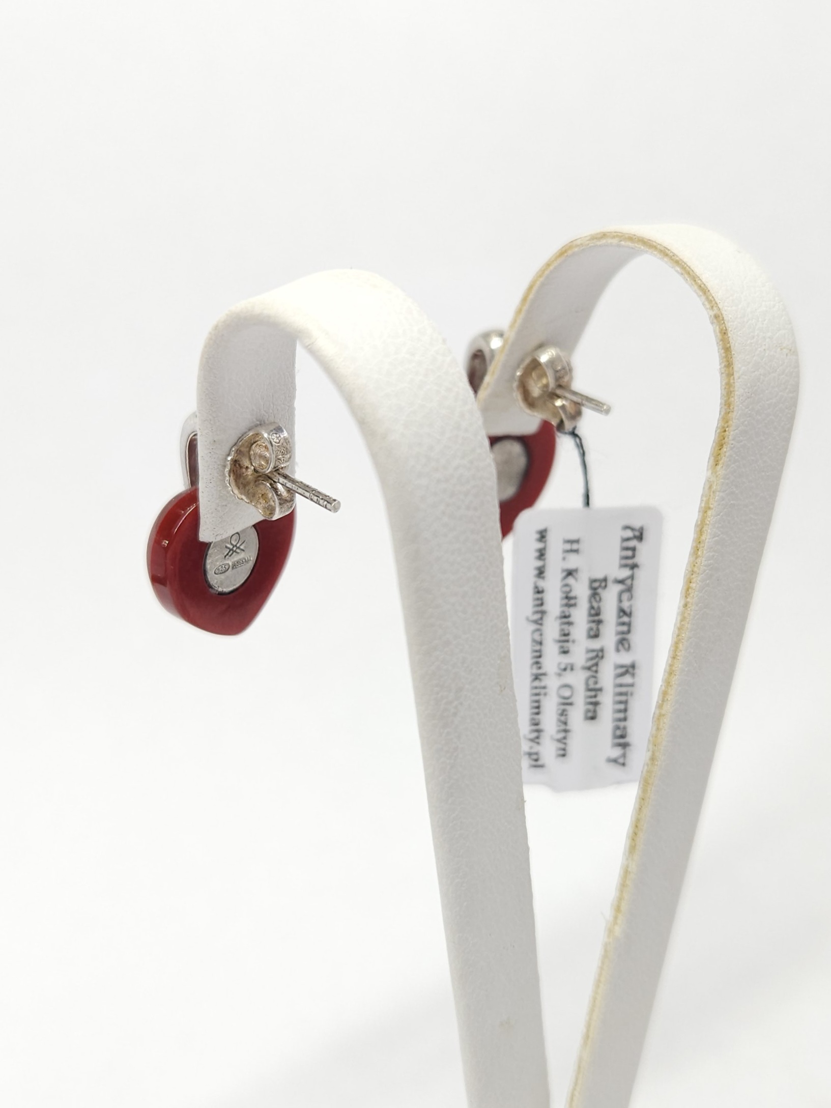 Srebrne kolczyki – sztyfty, z elementem ozdobnym w kształcie serc, wykonanym z czerwonej, perłowej masy jubilerskiej