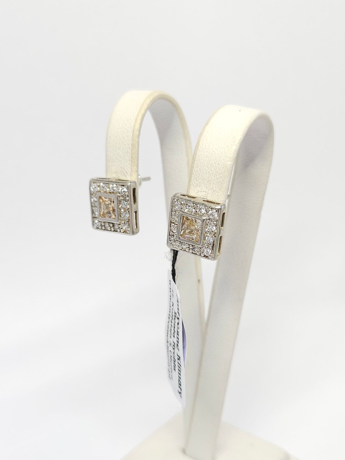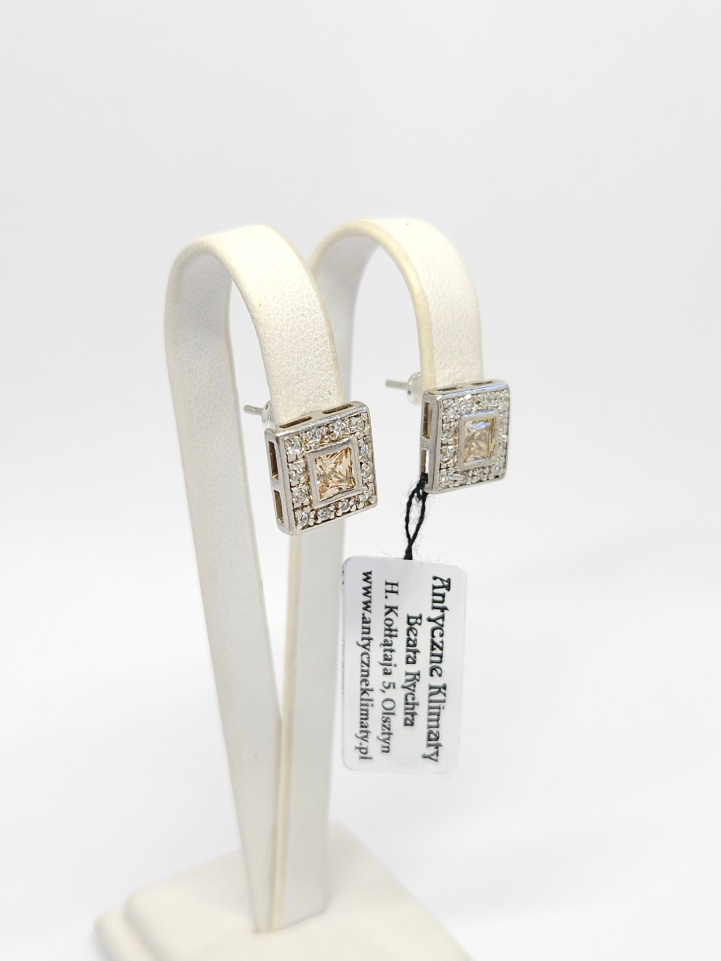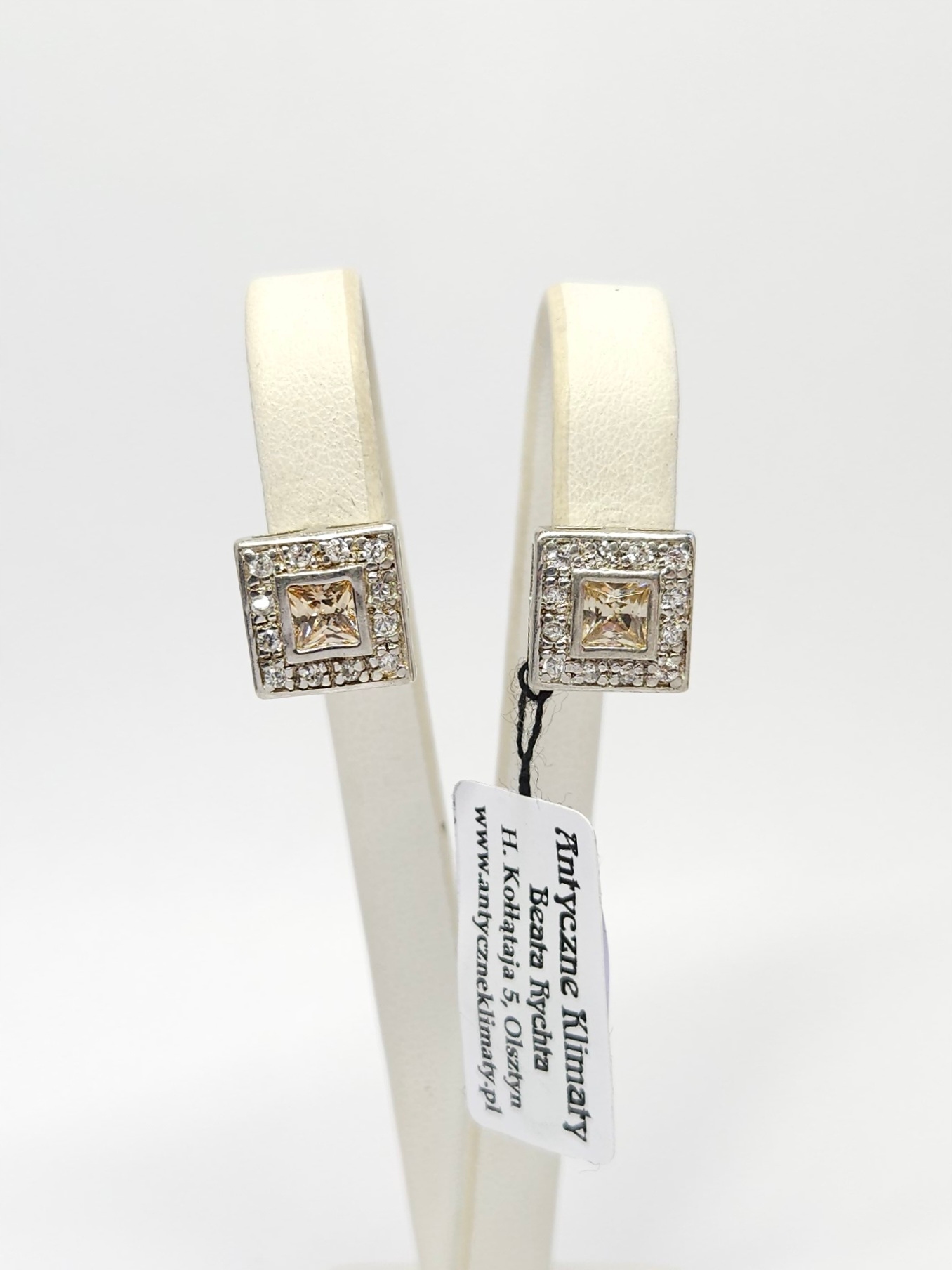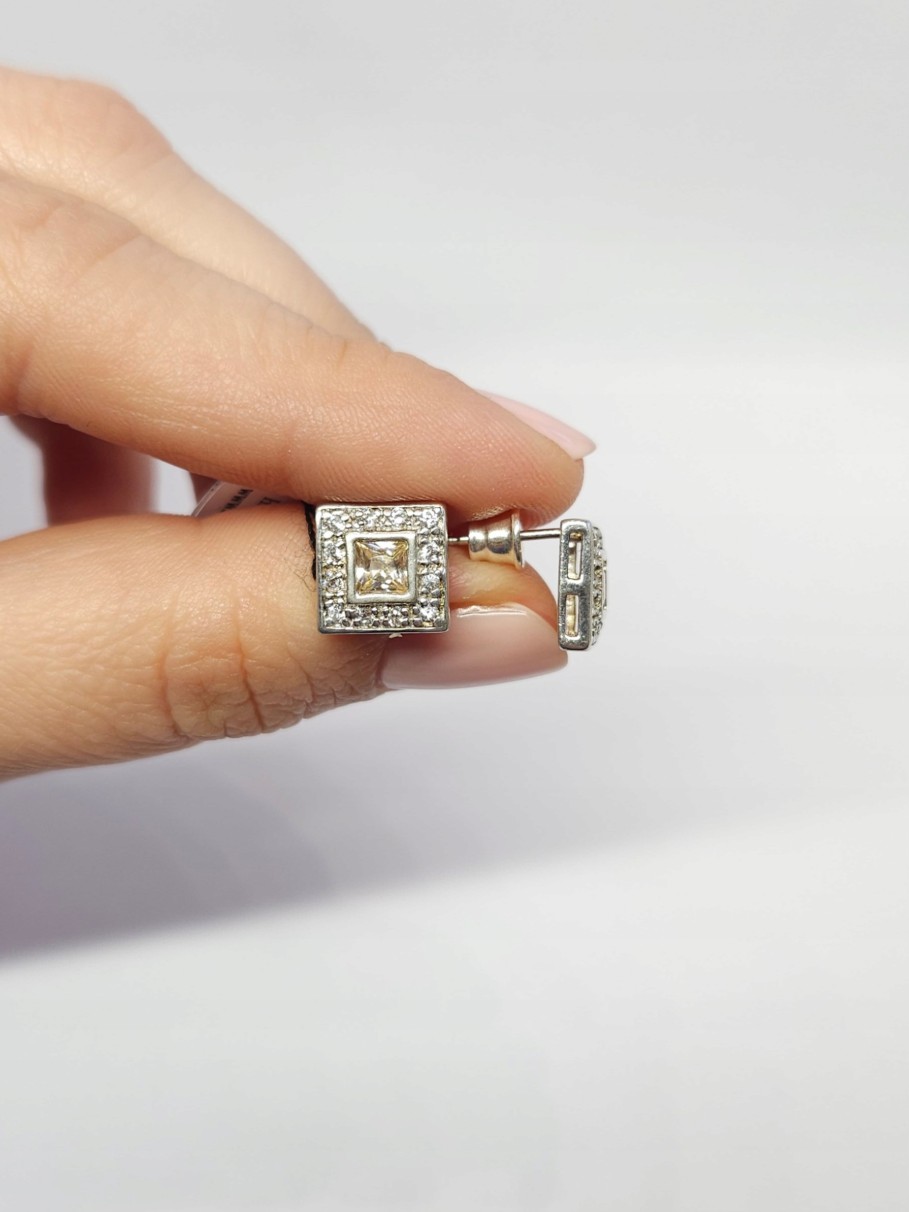 Srebrne, kwadratowe kolczyki – sztyfty z cyrkoniami i centralnymi cyrkoniami barwionymi w kolorze żółtym