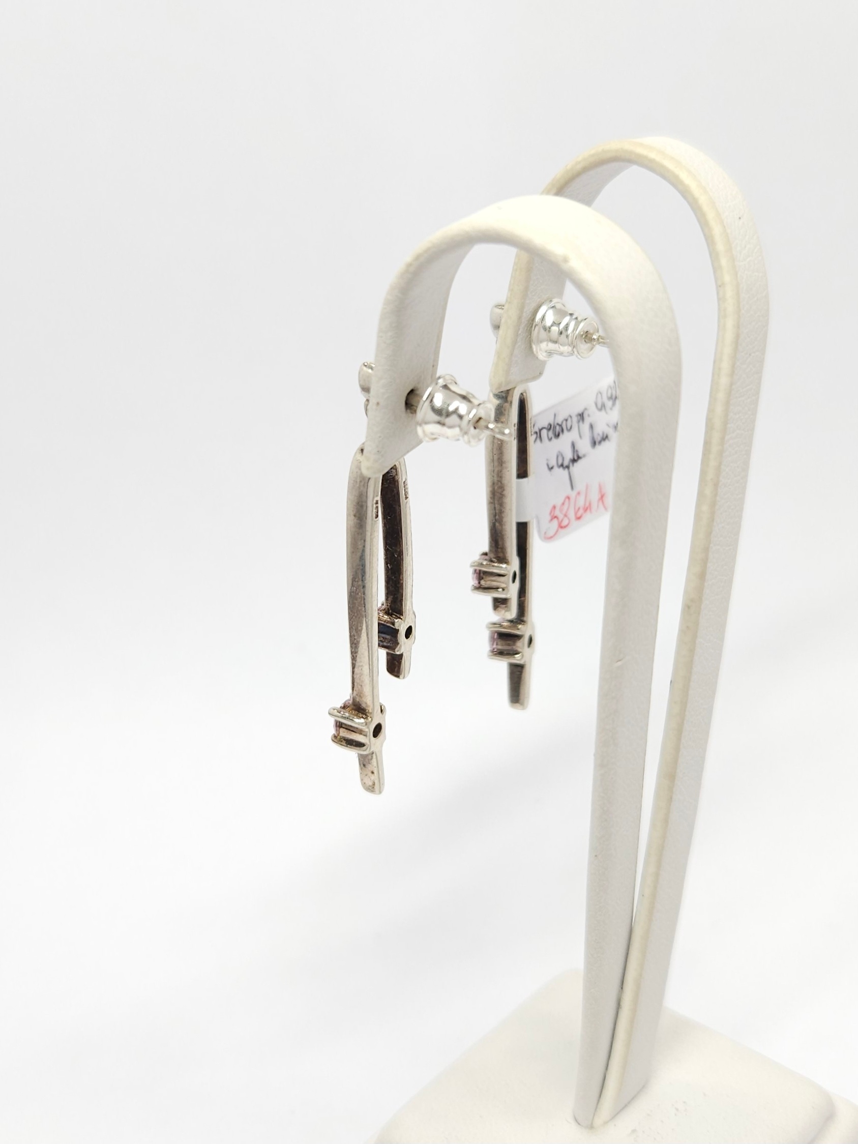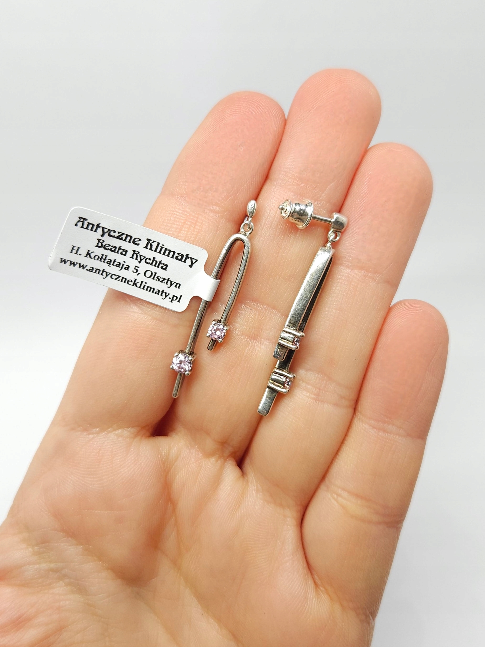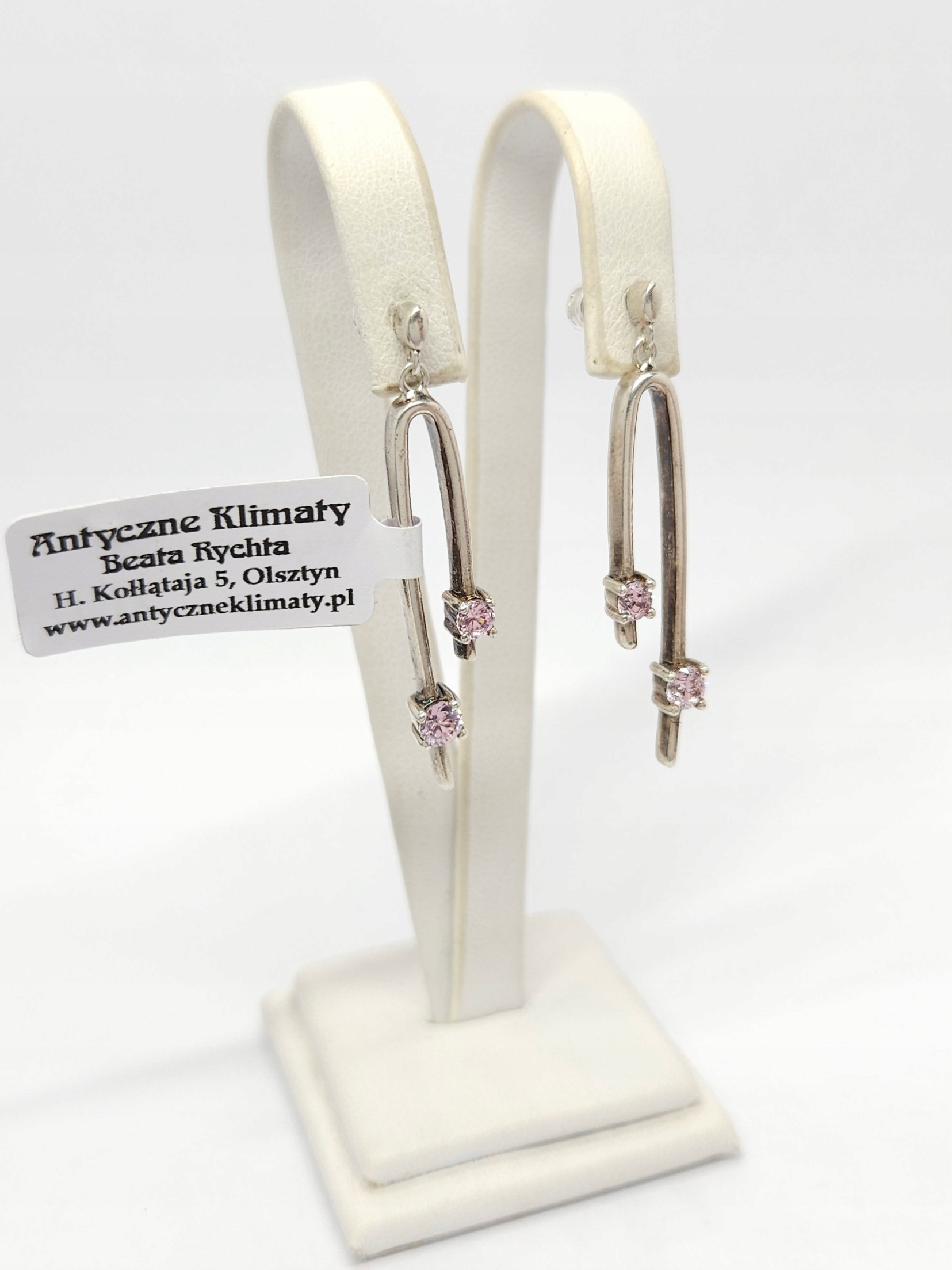 Srebrne, wiszące kolczyki – sztyfty, zdobione drobnymi, różowymi cyrkoniami barwionymi