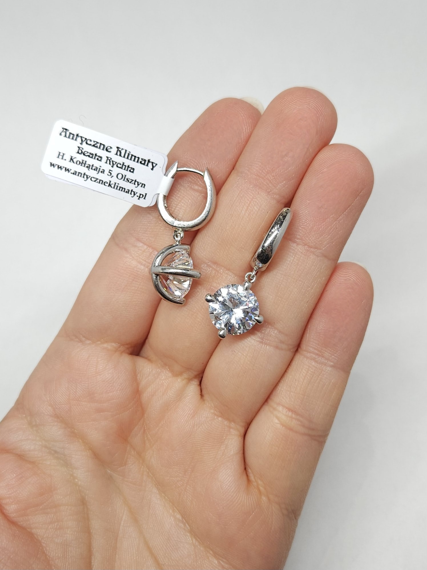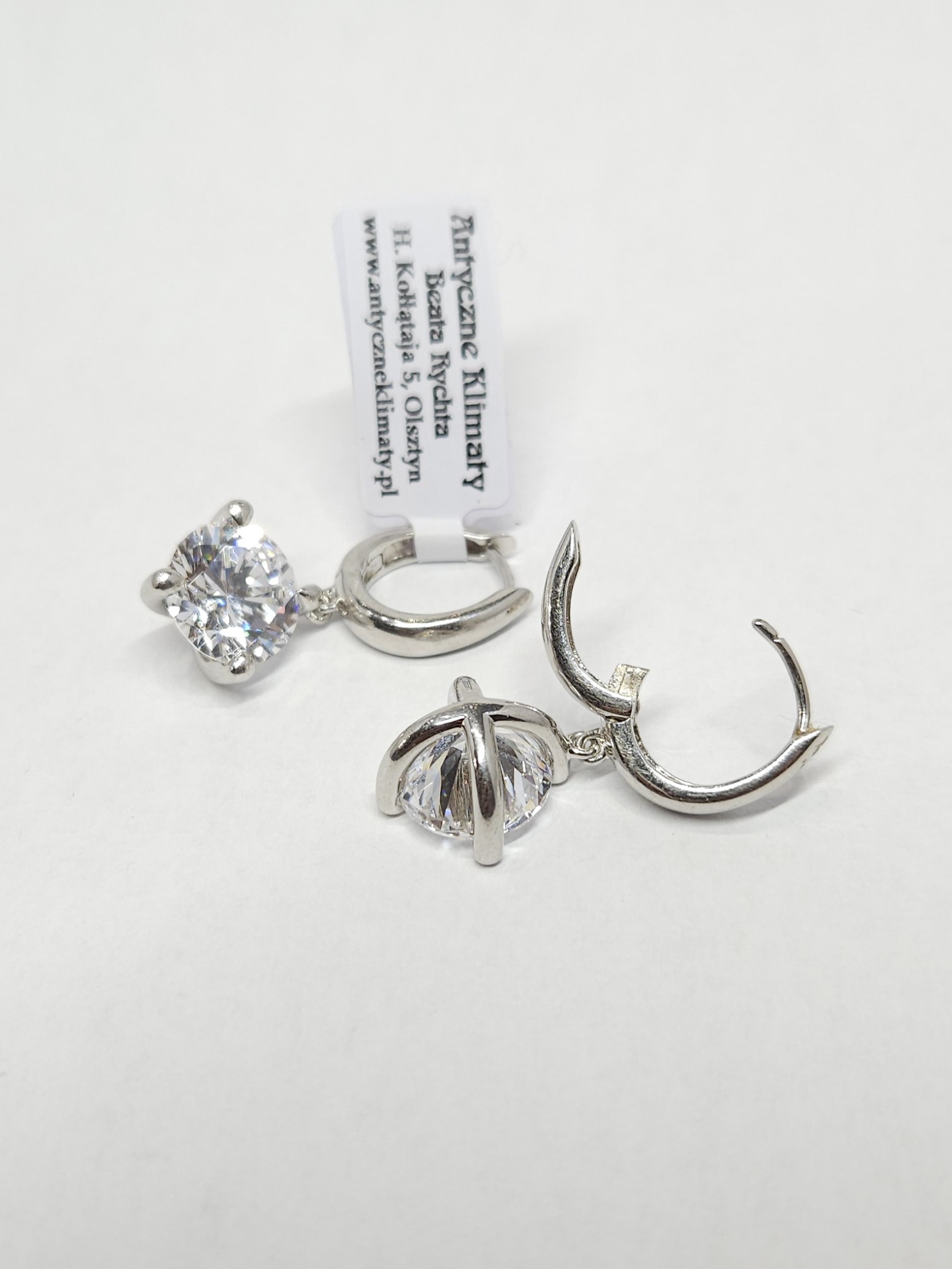 Srebrne, owalne, wiszące kolczyki z dużymi cyrkoniami, zapinane na zatrzask