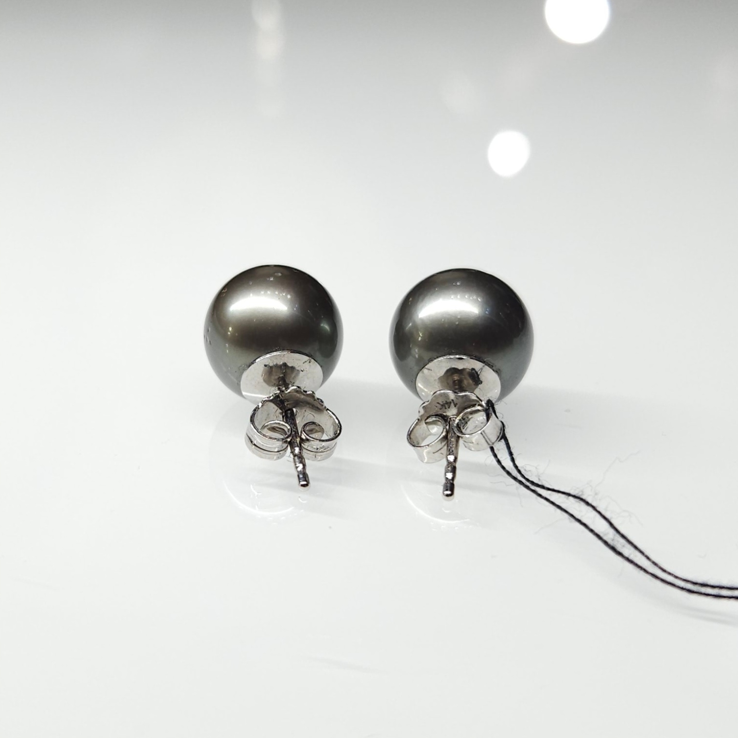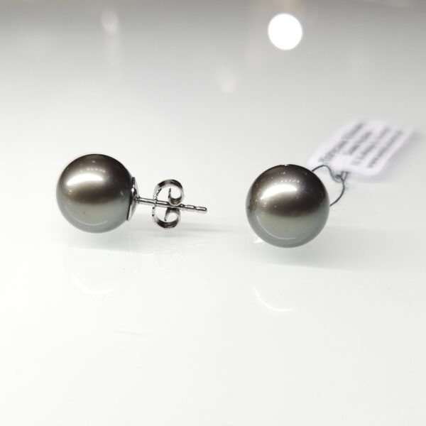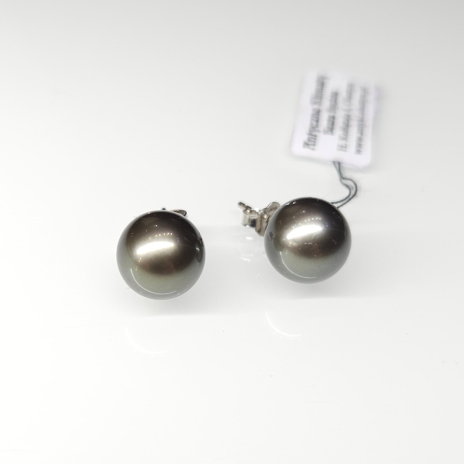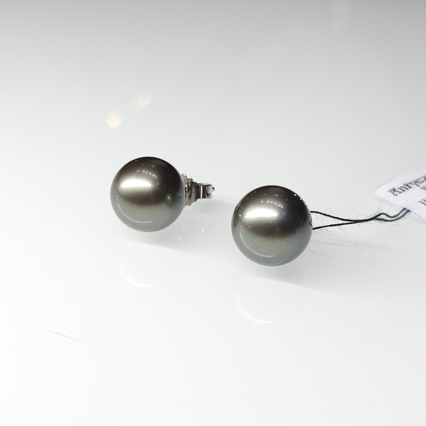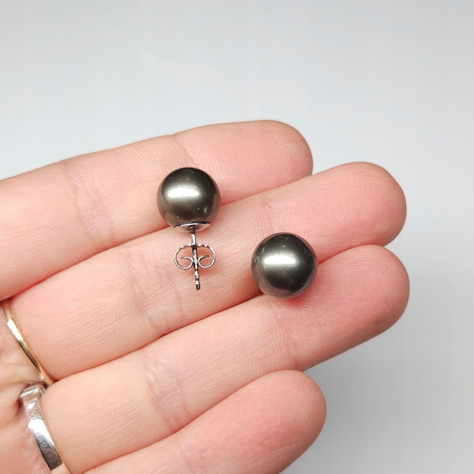 Kolczyki – sztyfty, wykonane z białego złota, z dużymi, ciemnymi perłami Tahiti