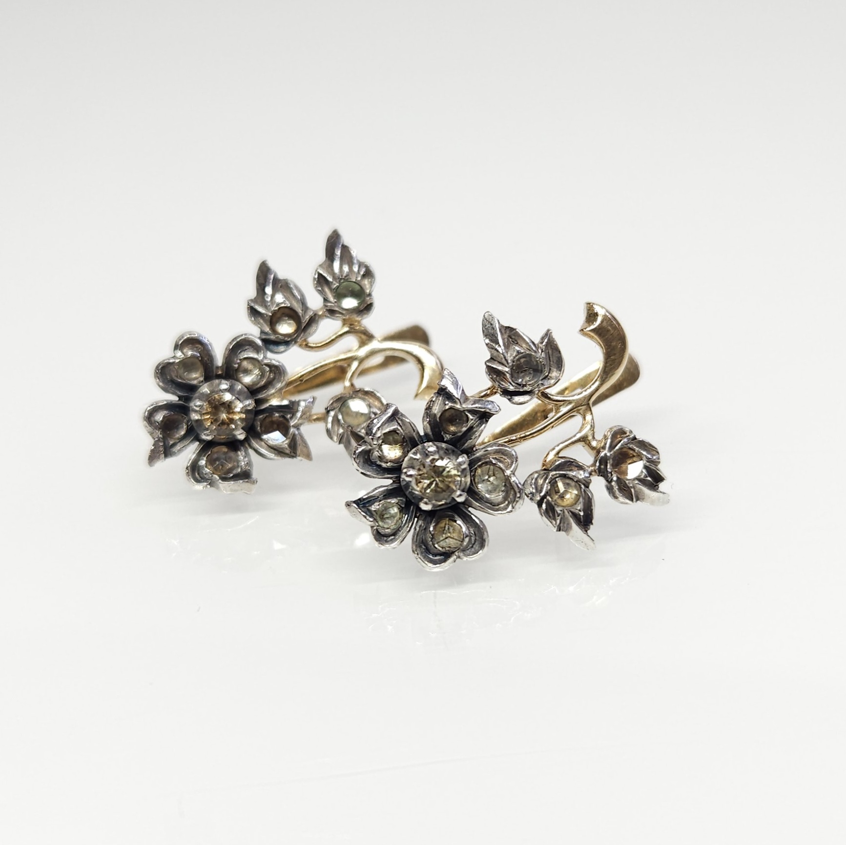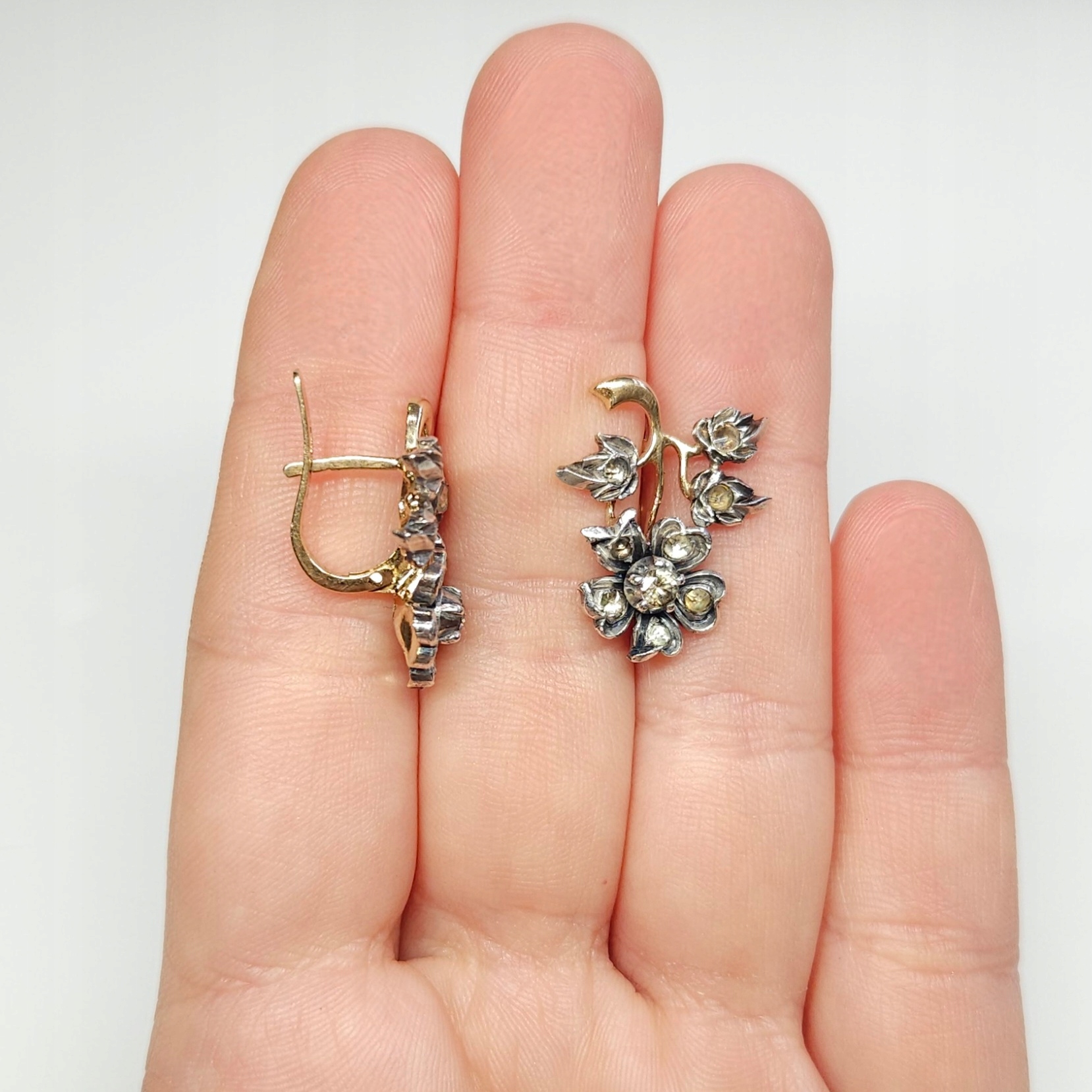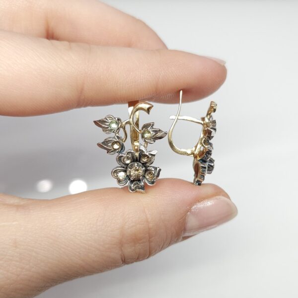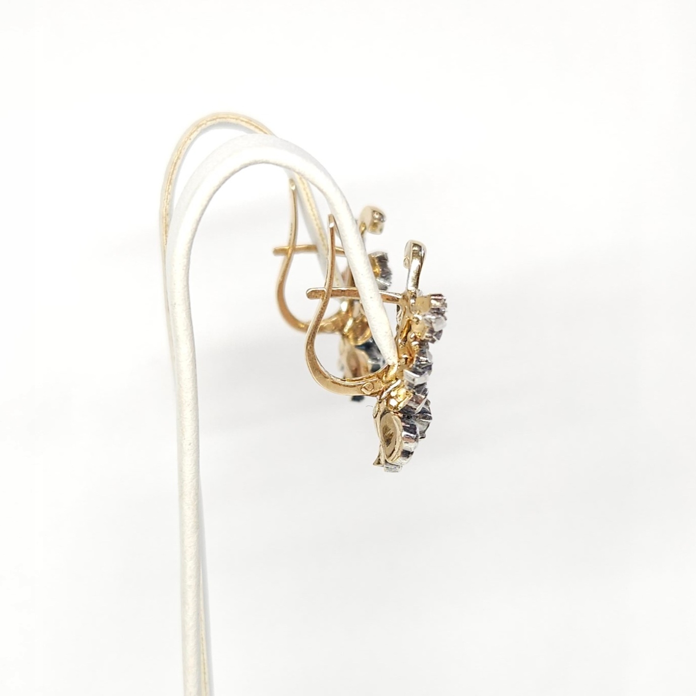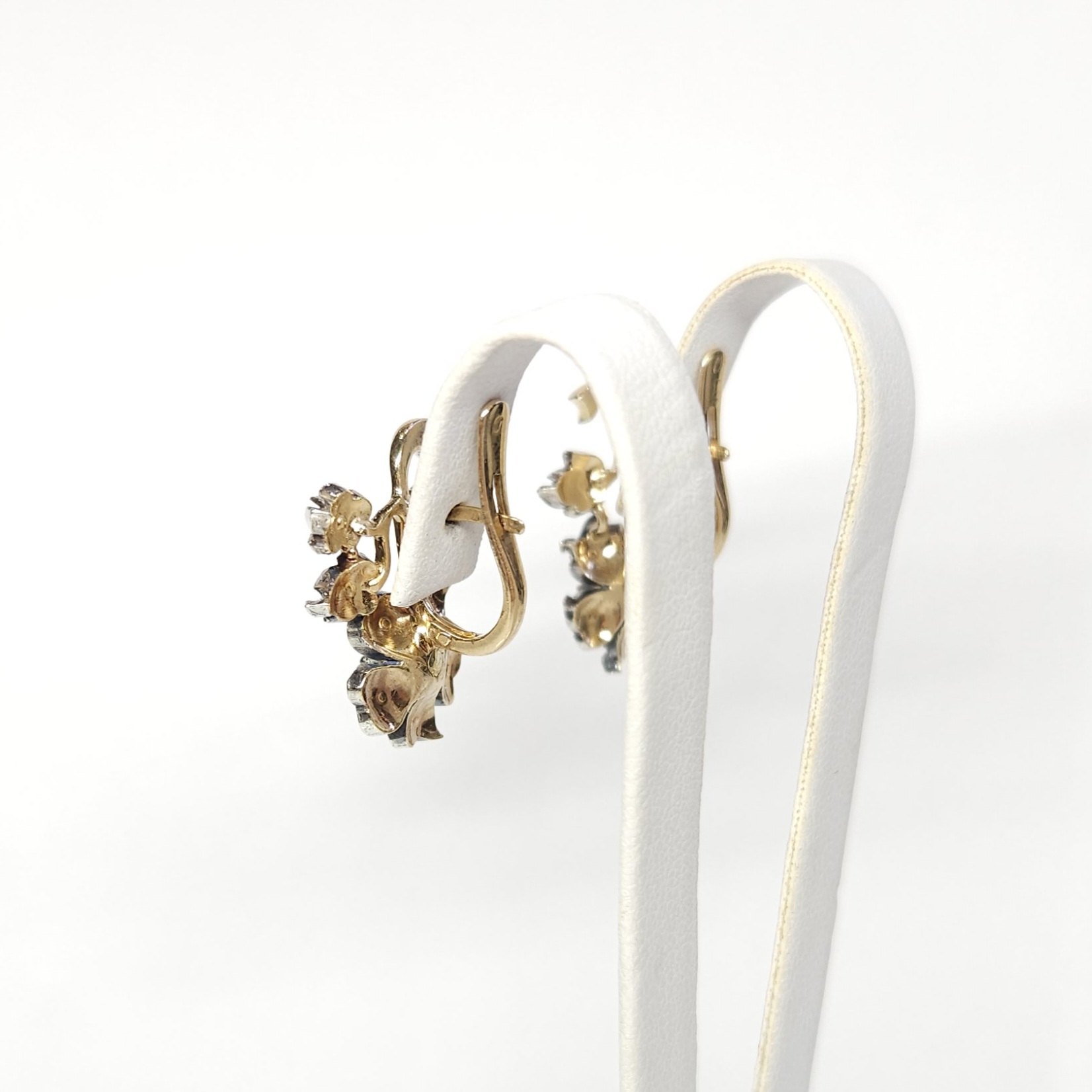 Efektowne, wiszące kolczyki, wykonane ze złota (tył i zapięcie) oraz srebra (przód), w kształcie kwiatów, wysadzane dwoma kamieniami naturalnymi (w centralnej części kwiatów) oraz leukoszafirami (pozostałe kamienie w płatkach i listkach)