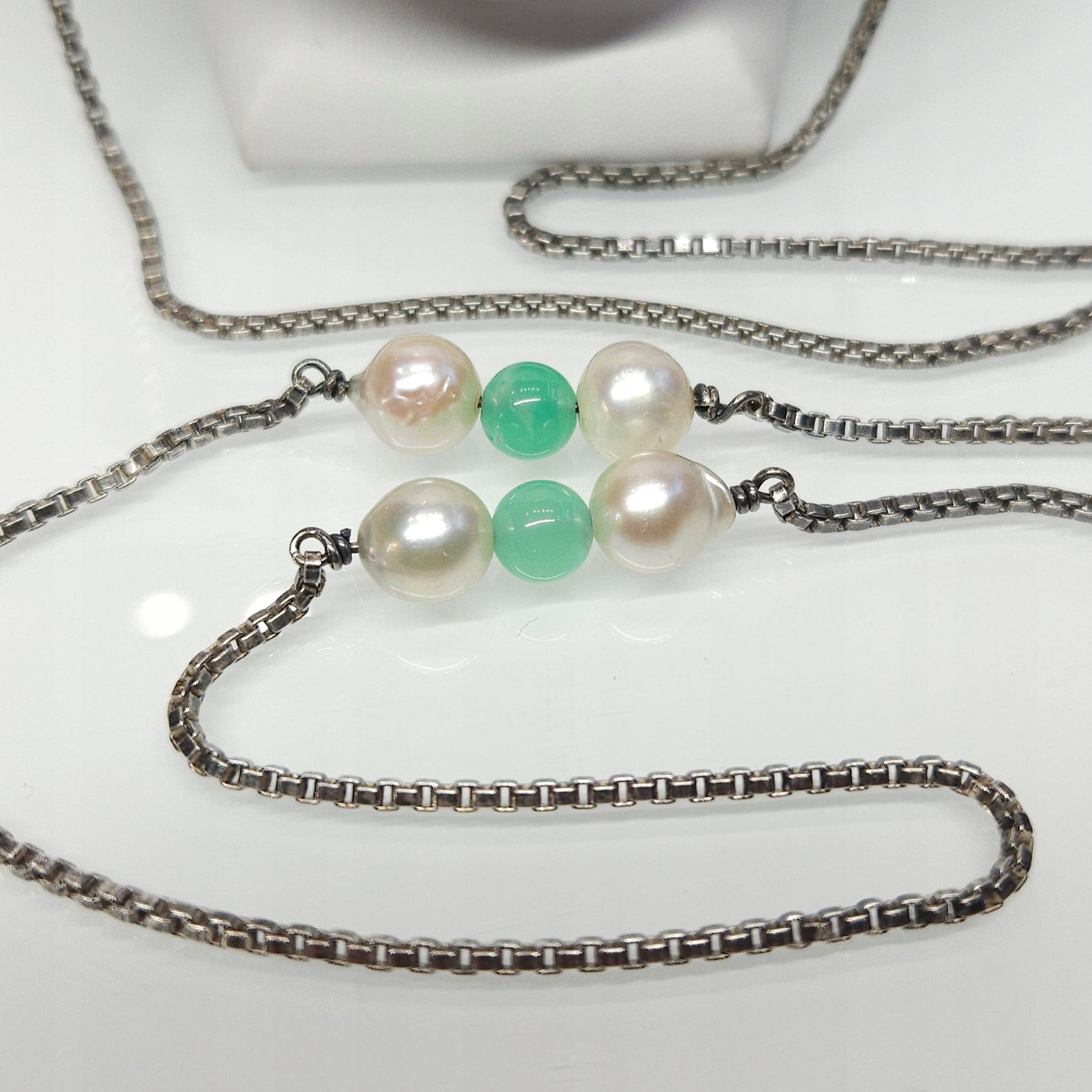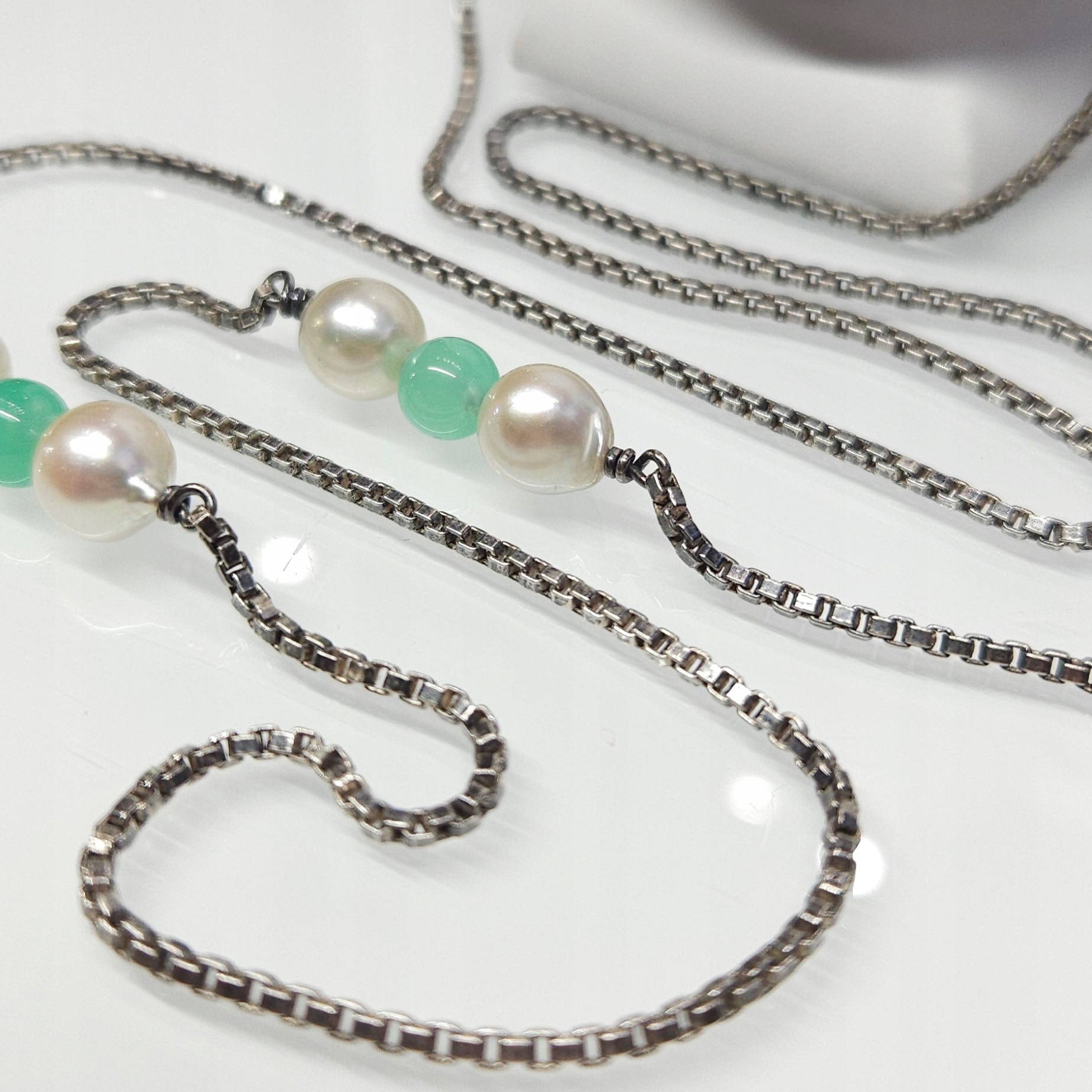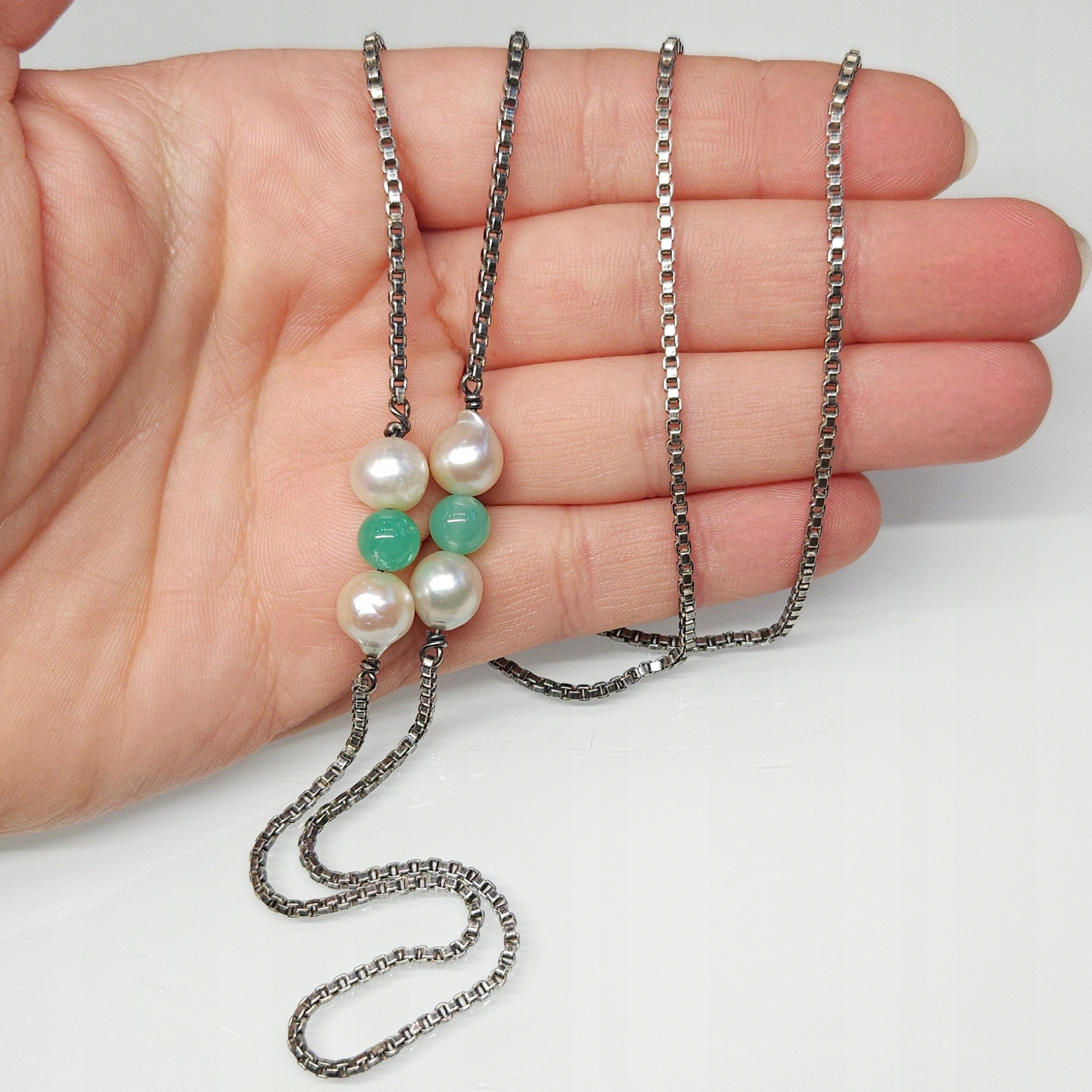 Długi naszyjnik z perłami hodowanymi i chalcedonem, srebro 0,800 obw. 107cm