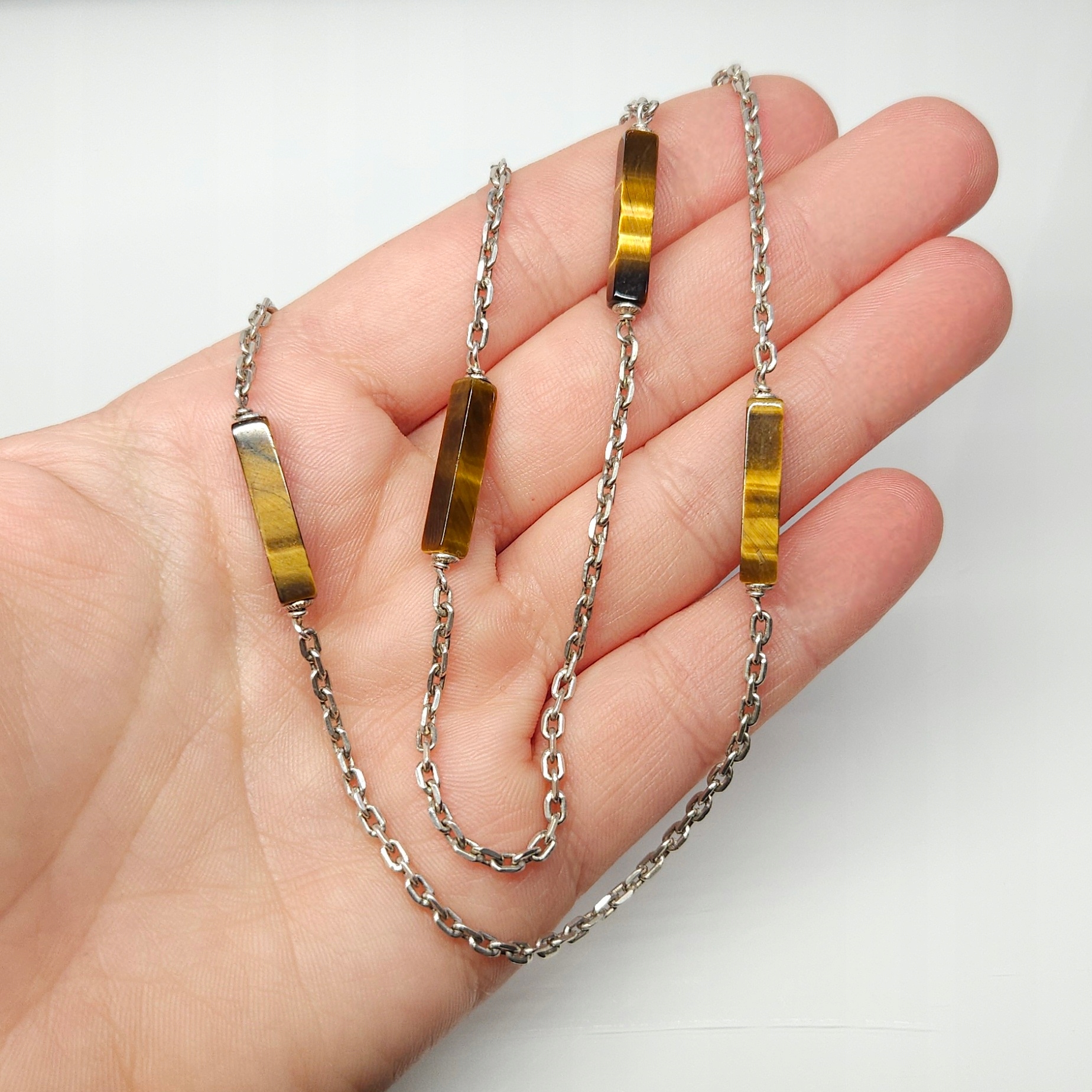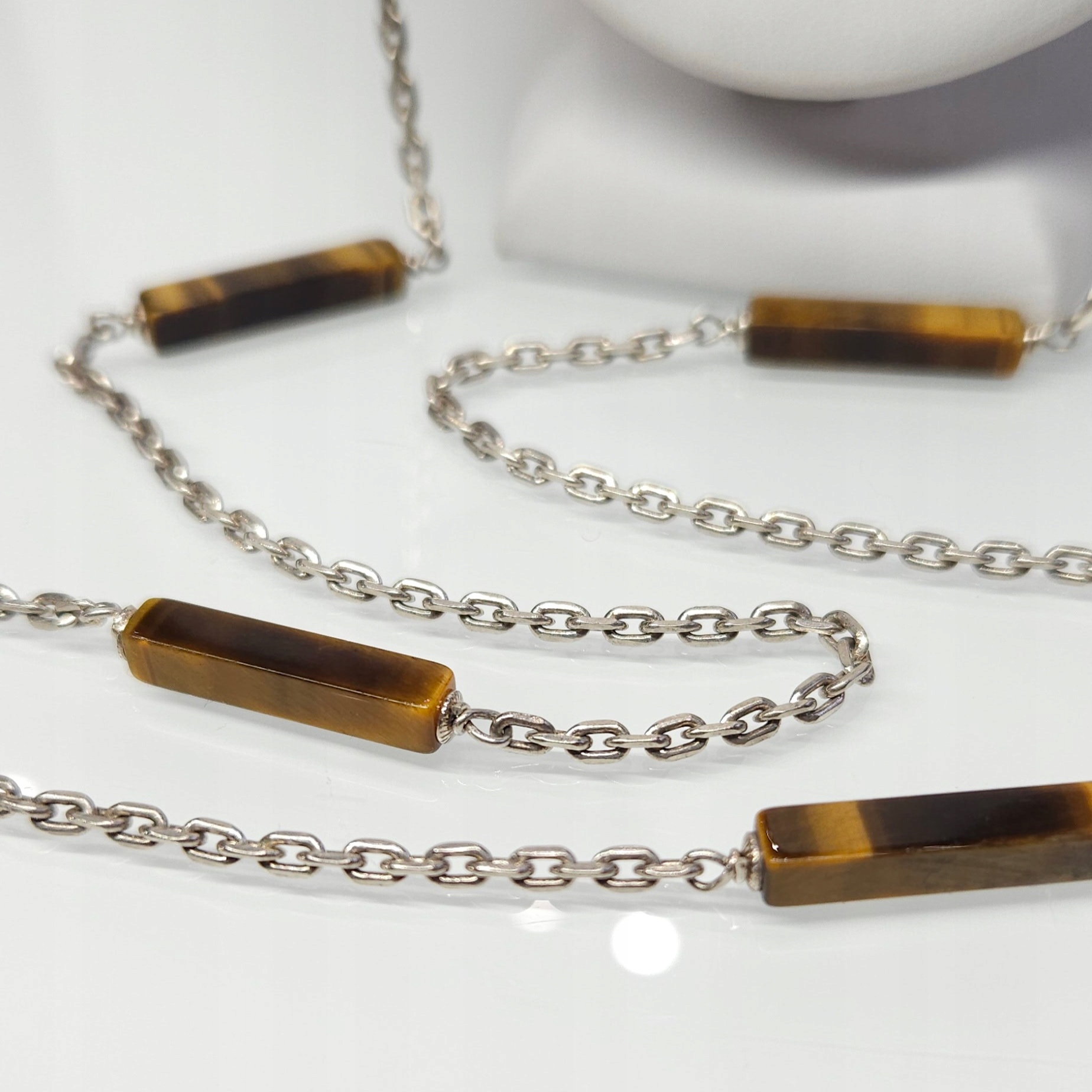 Długi, srebrny naszyjnik z tygrysim okiem