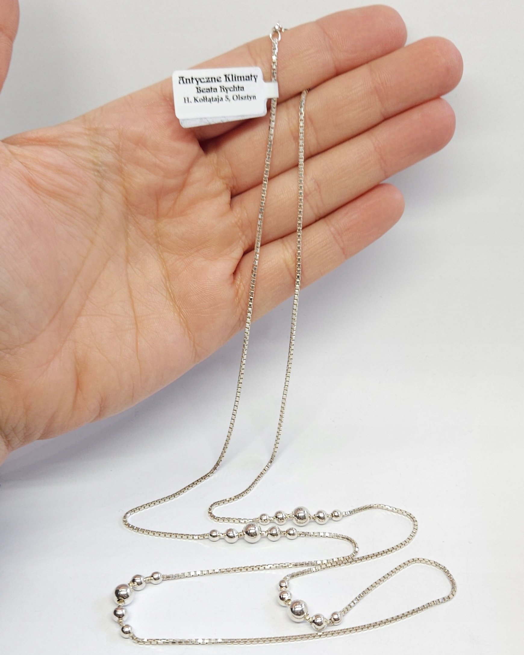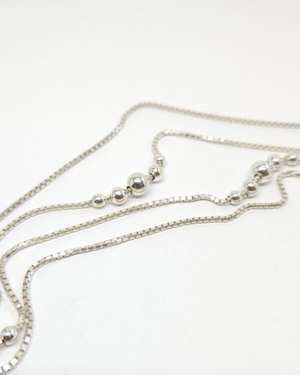Długi, delikatny, srebrny naszyjnik, wykonany z łańcuszka typu kostka, zdobiony czterema grupami stopniowanych kuleczek