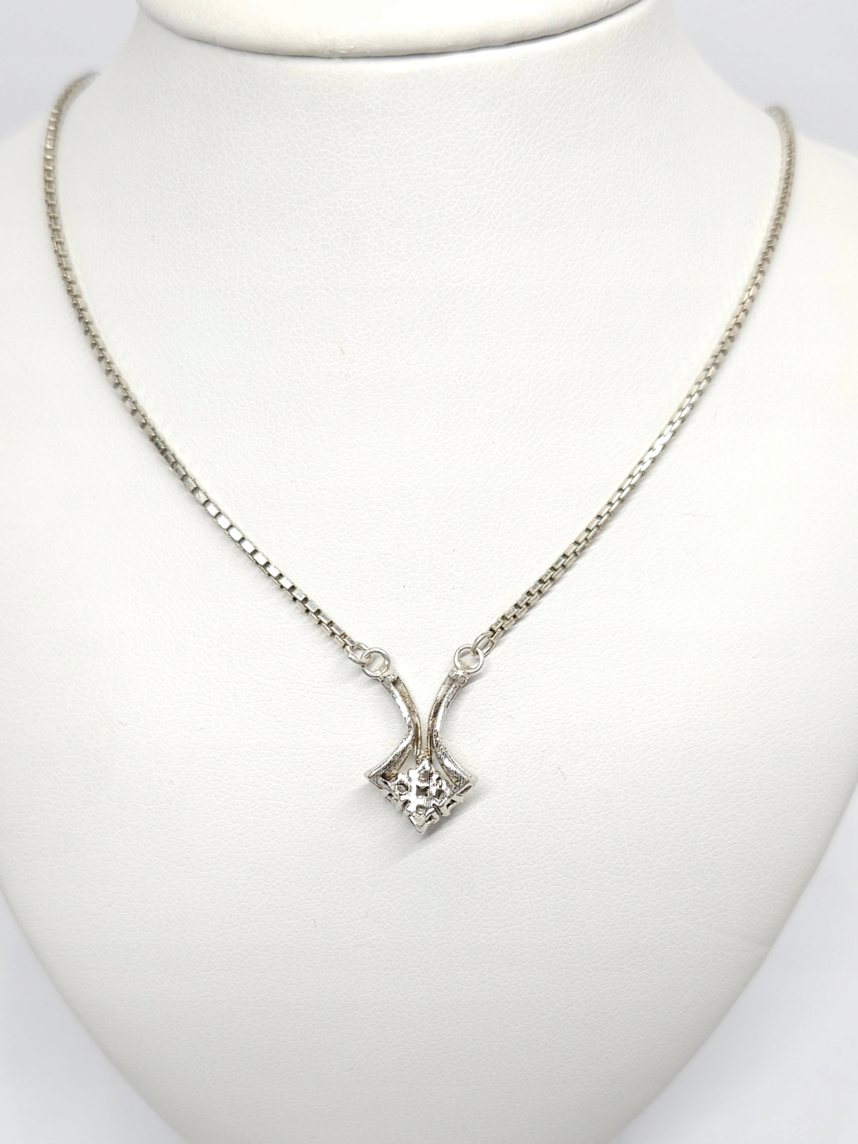 Krótki, srebrny naszyjnik, z rodowanym elementem ozdobnym, wysadzanym czterema cyrkoniami oraz regulowanym łańcuszkiem typu: kostka
