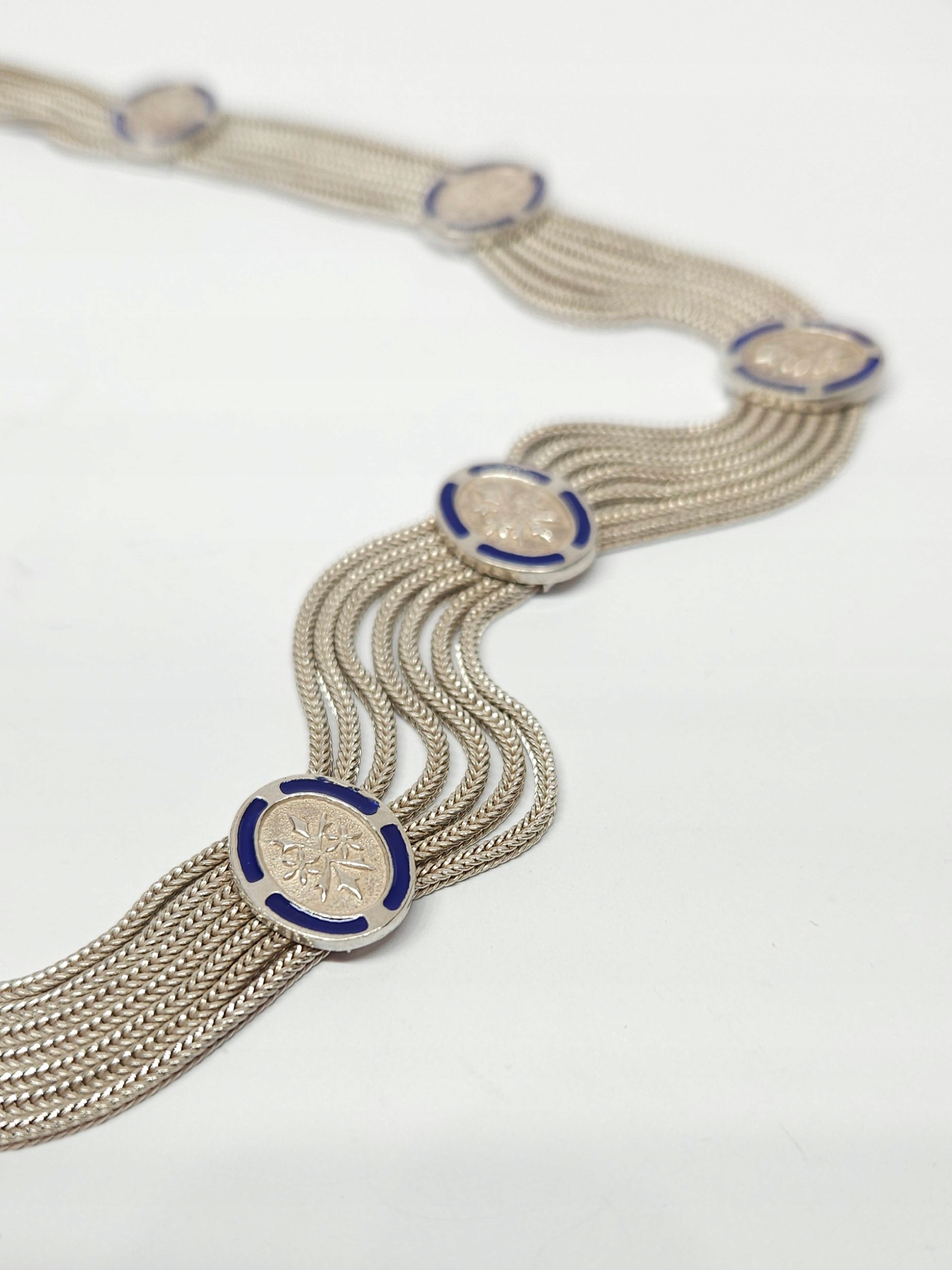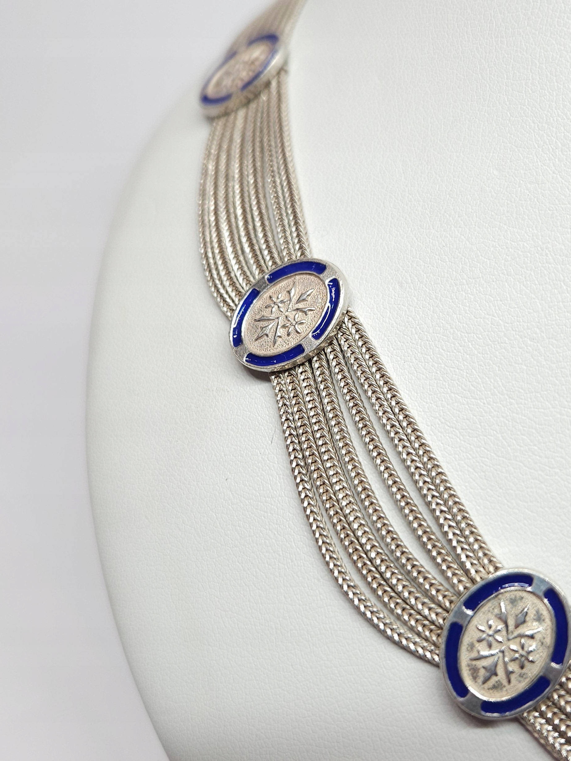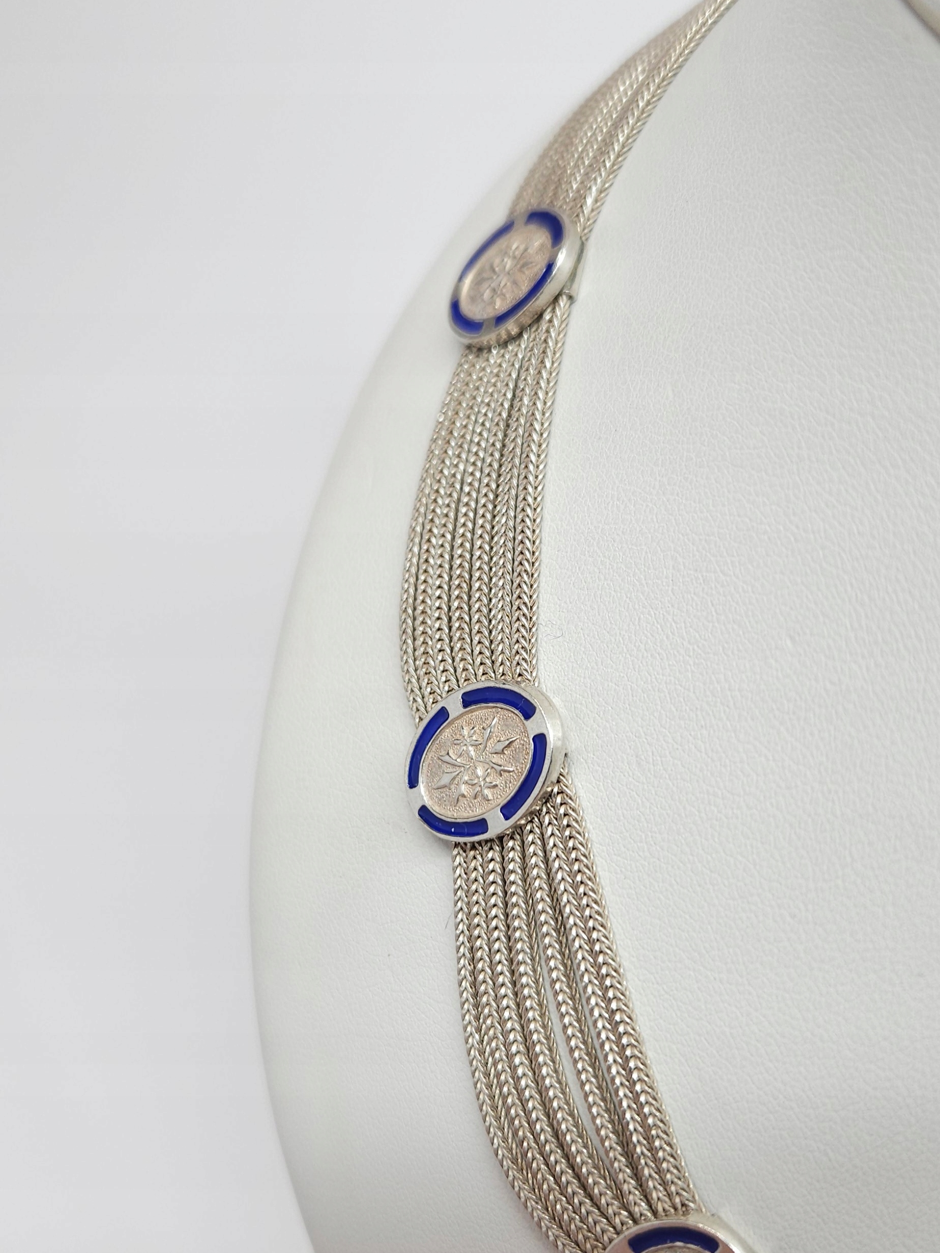 Krótki, srebrny naszyjnik z pocz. XXw., wykonany z 7 łańcuszków, połączonych równomiernie rozłożonymi, owalnymi elementami ozdobnymi, dekorowanymi kobaltową emalią; naszyjnik posiada zapięcie szufladkowe z dodatkowym zabezpieczeniem