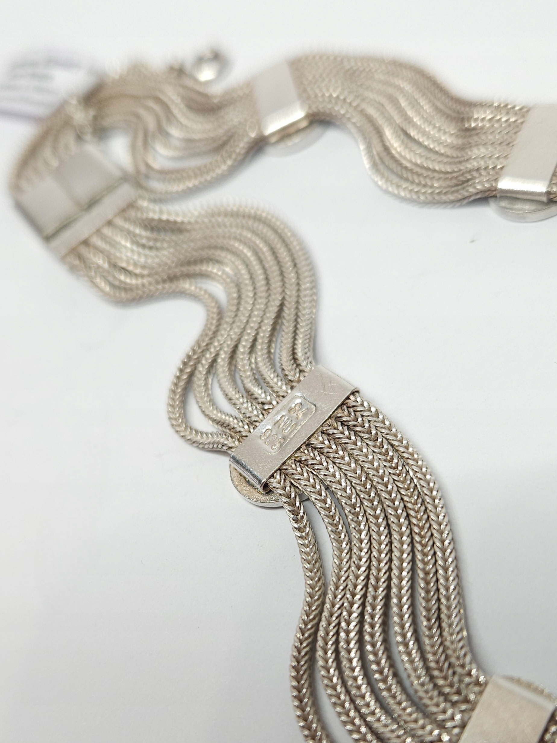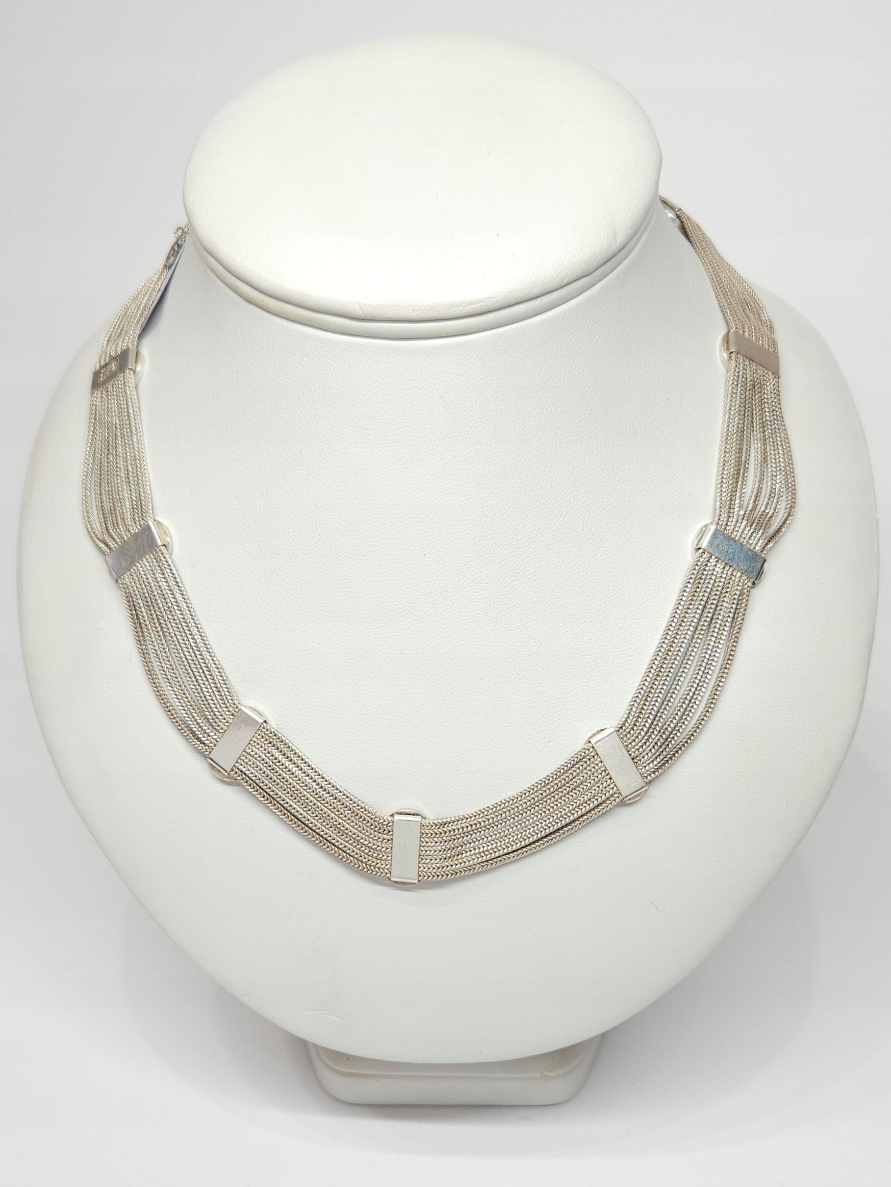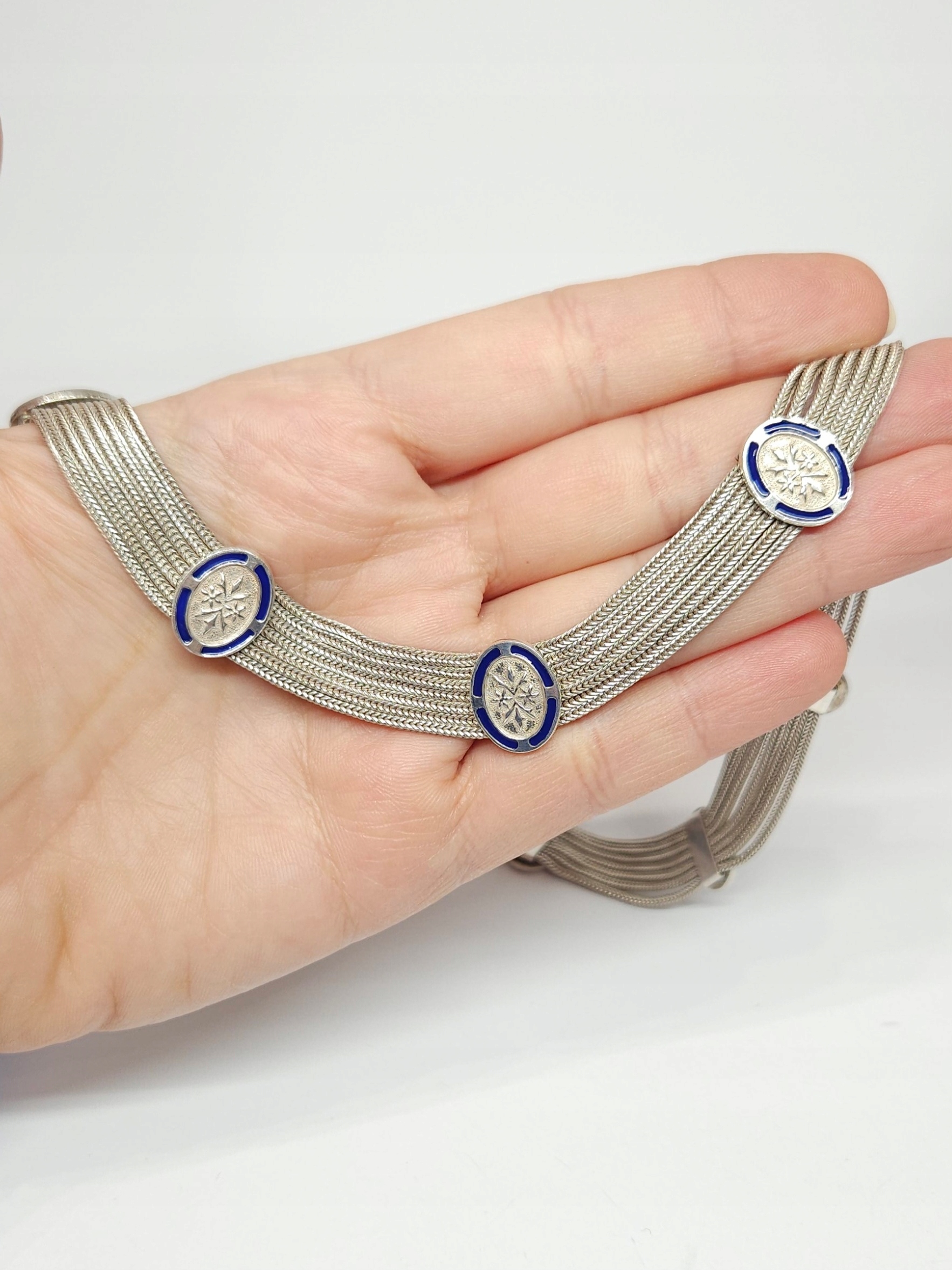 Krótki, srebrny naszyjnik z pocz. XXw., wykonany z 7 łańcuszków, połączonych równomiernie rozłożonymi, owalnymi elementami ozdobnymi, dekorowanymi kobaltową emalią; naszyjnik posiada zapięcie szufladkowe z dodatkowym zabezpieczeniem