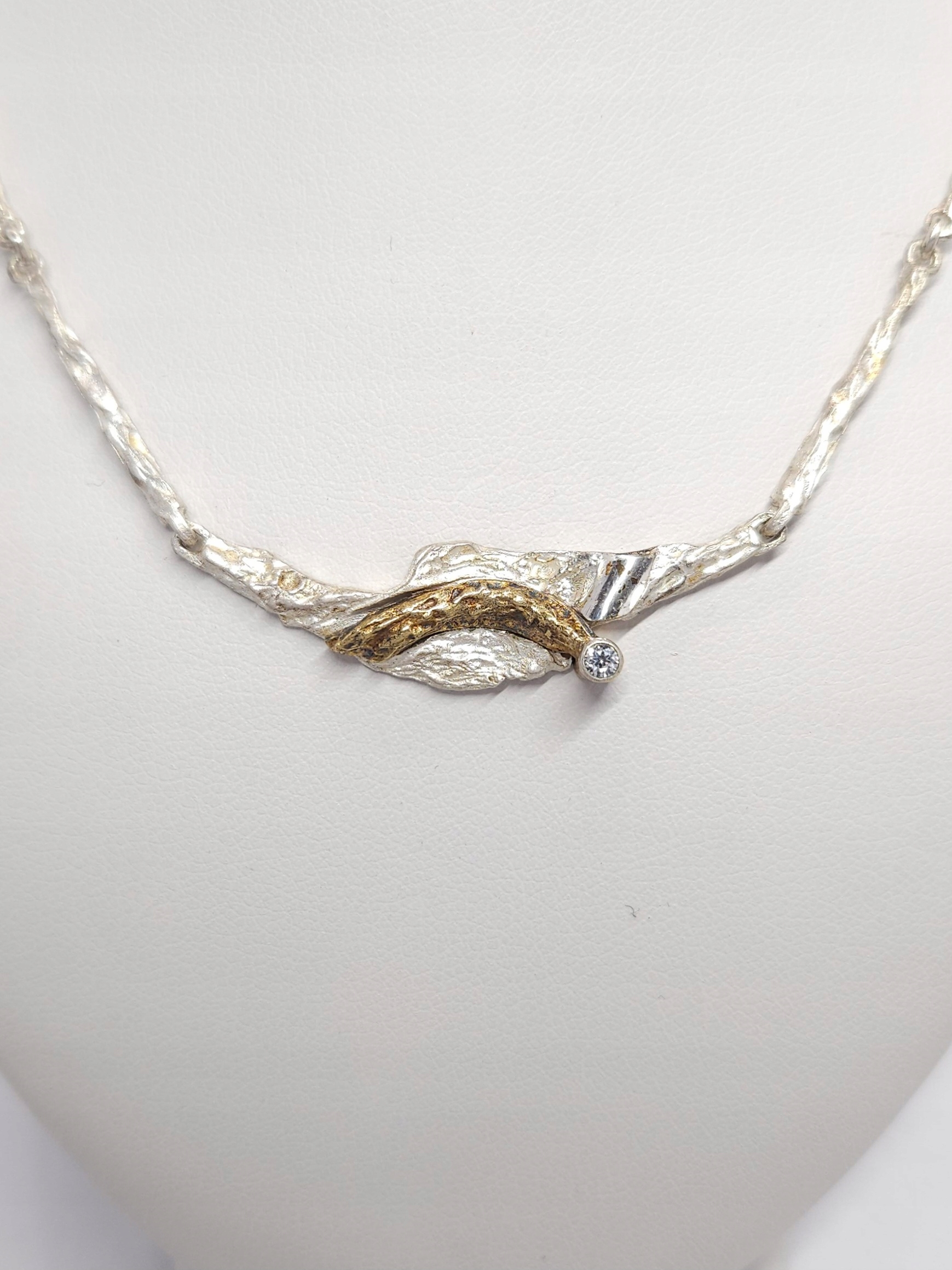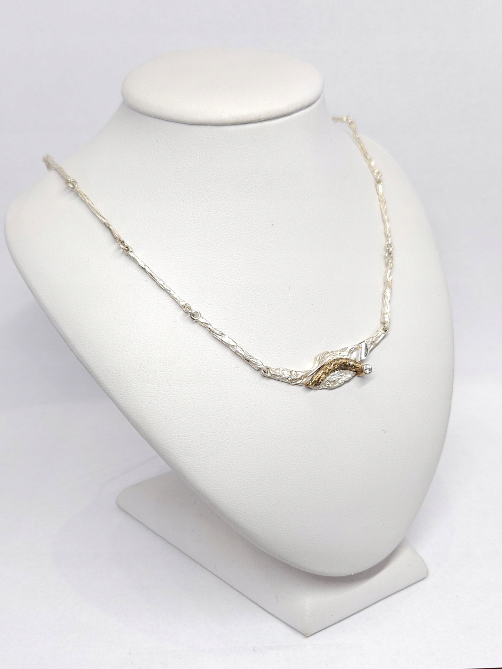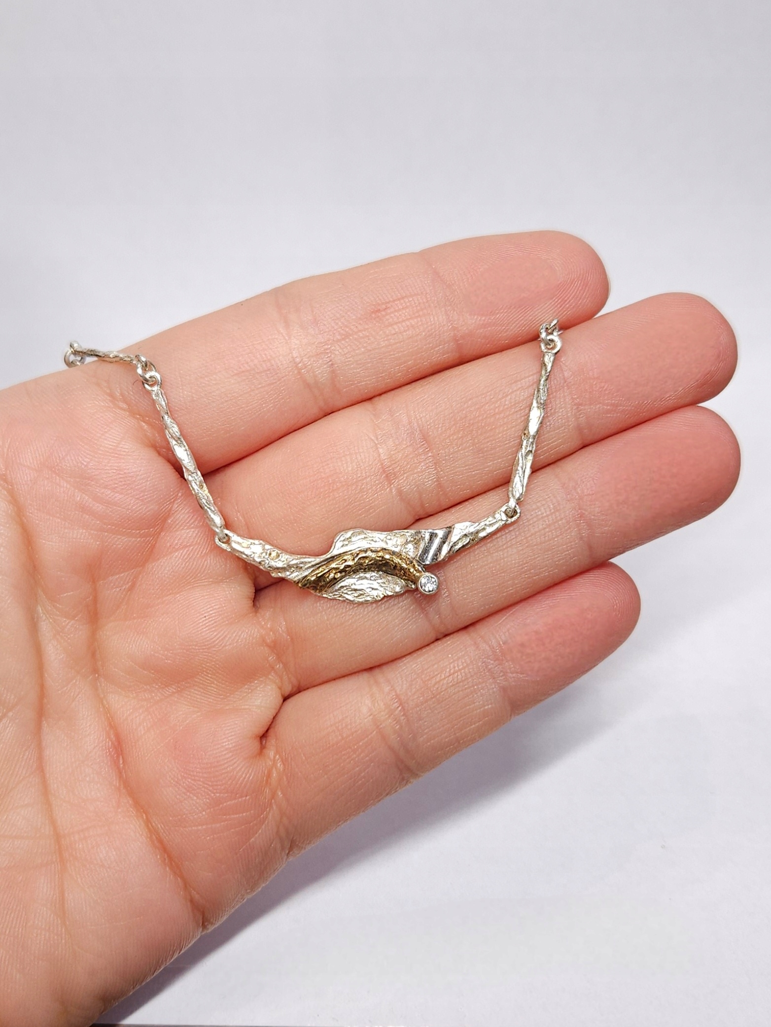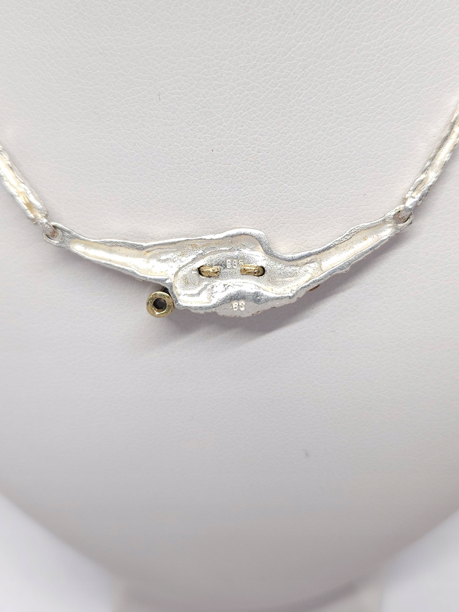 Krótki, srebrny naszyjnik o nieregularnej powierzchni, z miejscowo pozłacanym elementem ozdobnym z pojedynczym kamieniem naturalnym; naszyjnik posiada zapięcie szufladkowe z dodatkowym zabezpieczeniem