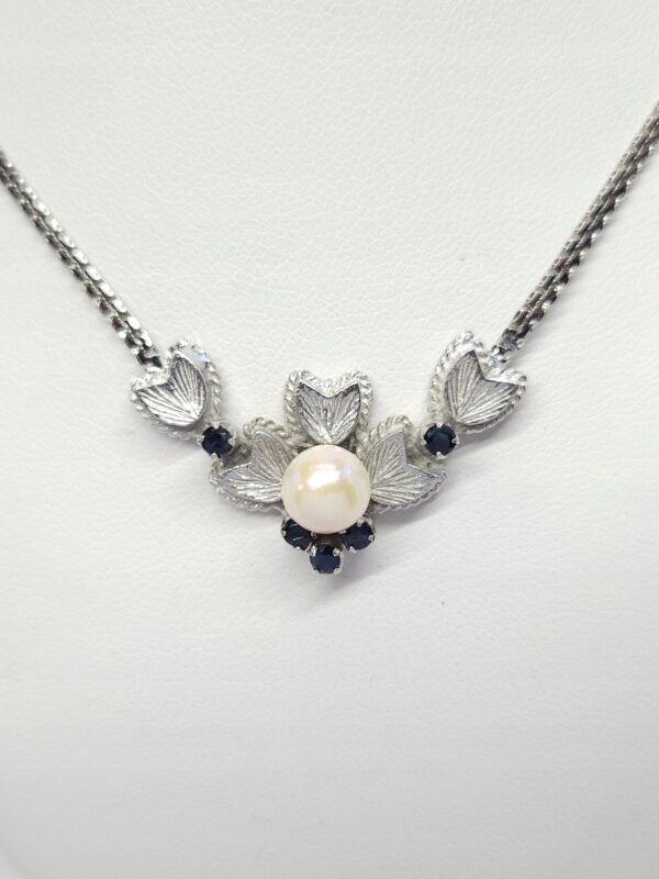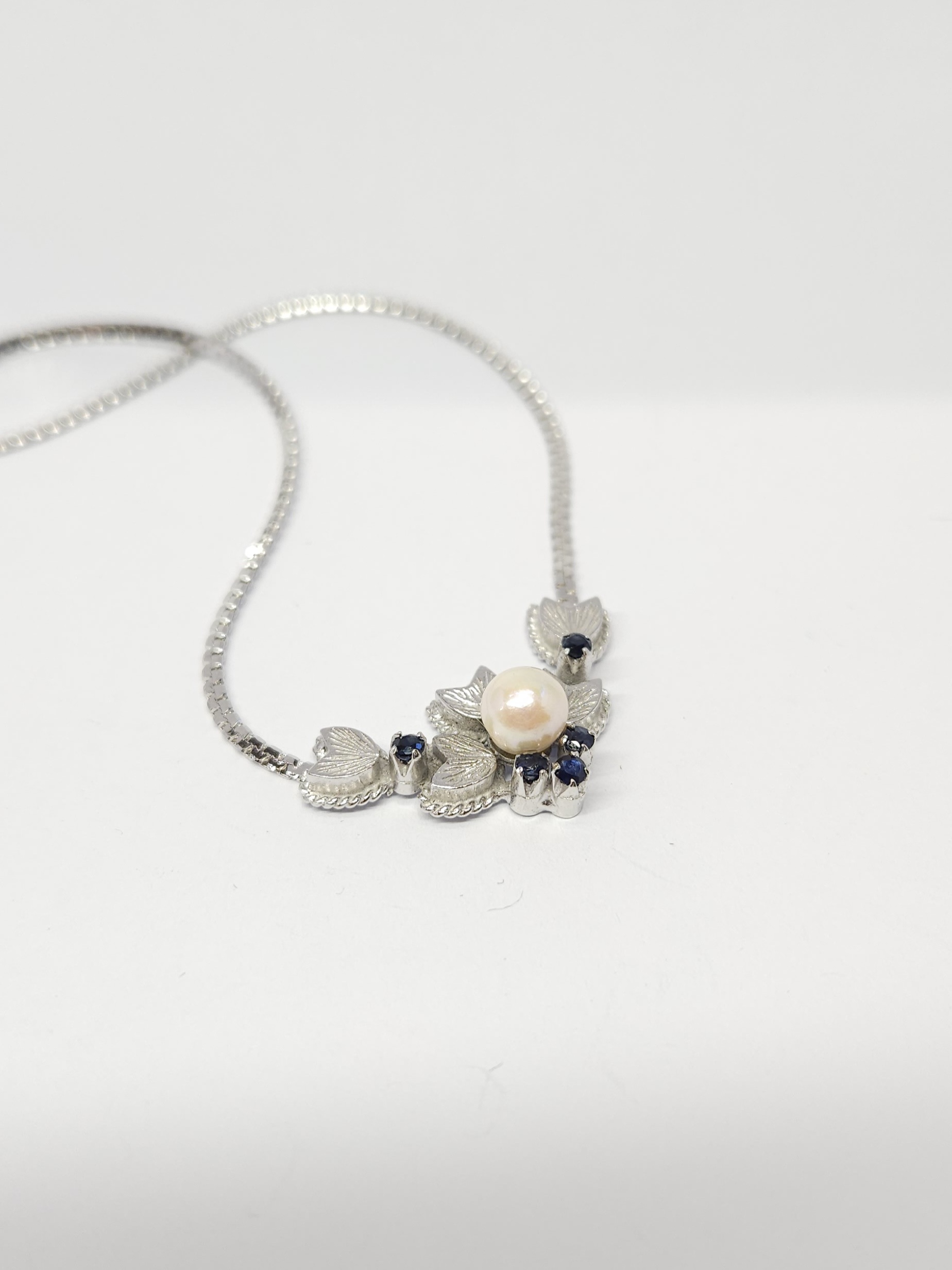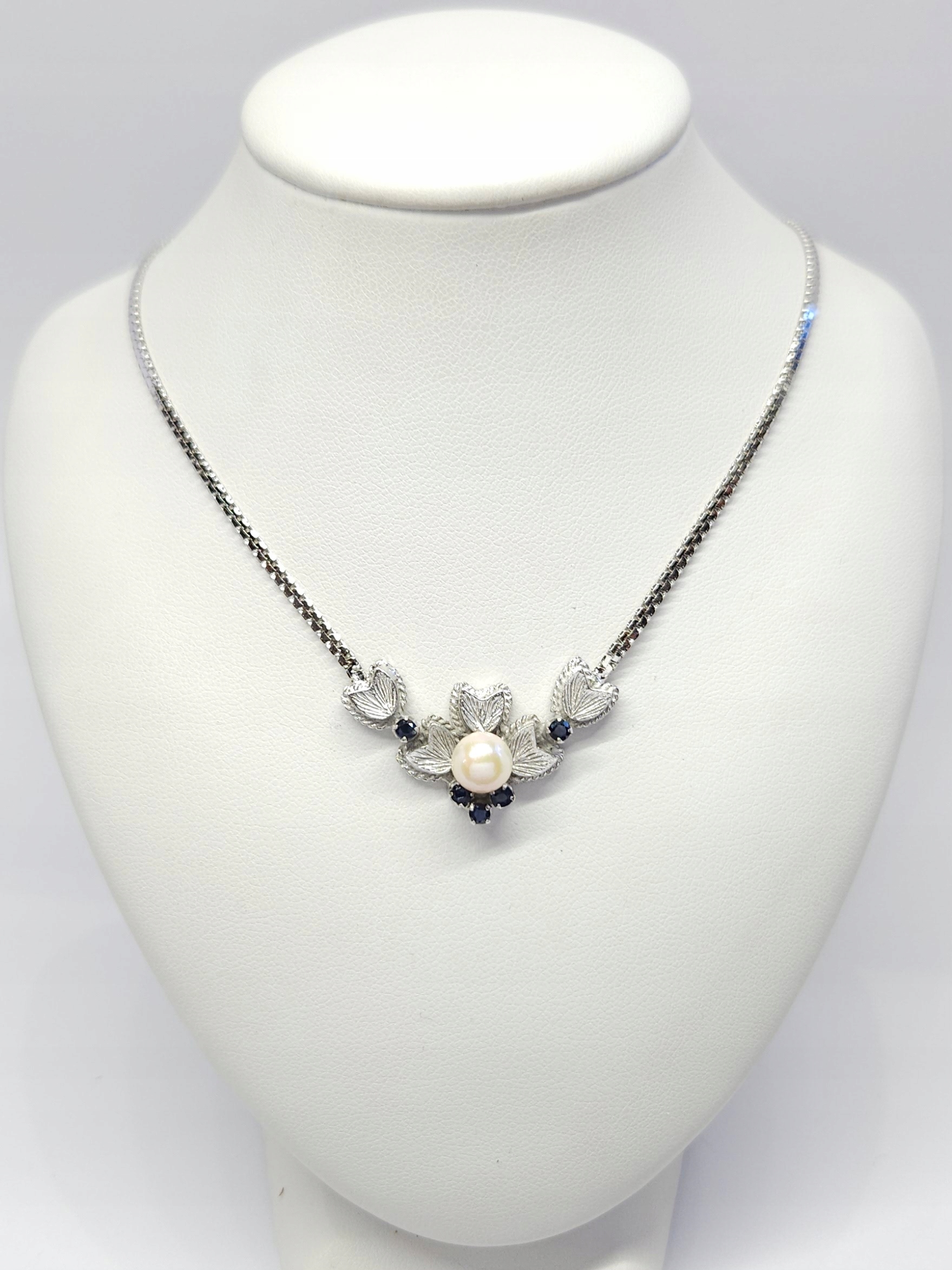 Krótki naszyjnik, wykonany ze srebra rodowanego, z elementem ozdobnym zdobionym perłą hodowaną oraz ciemnoszafirowymi kamieniami naturalnymi