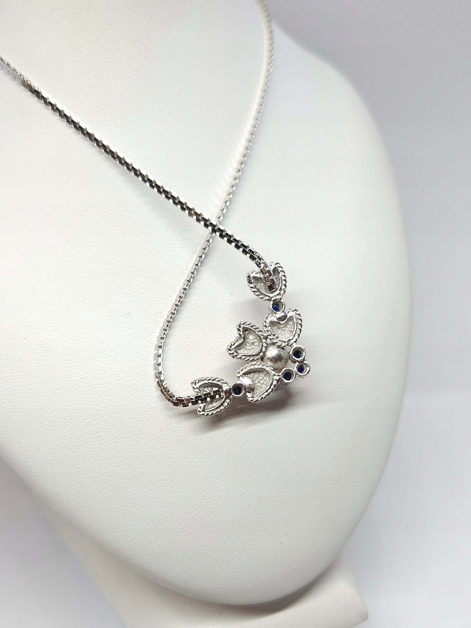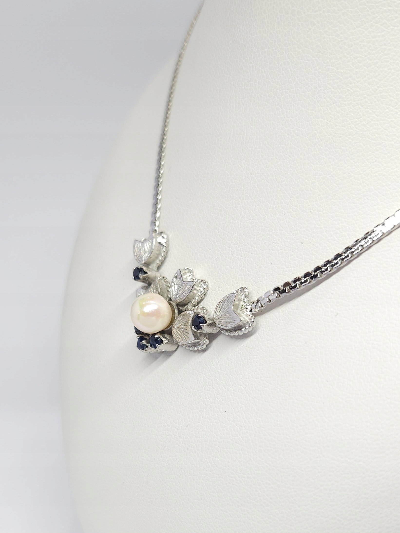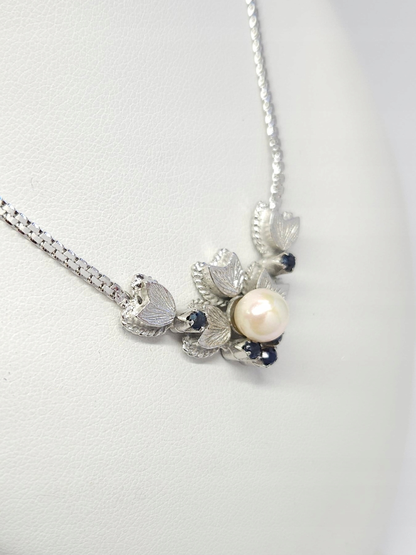 Krótki naszyjnik, wykonany ze srebra rodowanego, z elementem ozdobnym zdobionym perłą hodowaną oraz ciemnoszafirowymi kamieniami naturalnymi